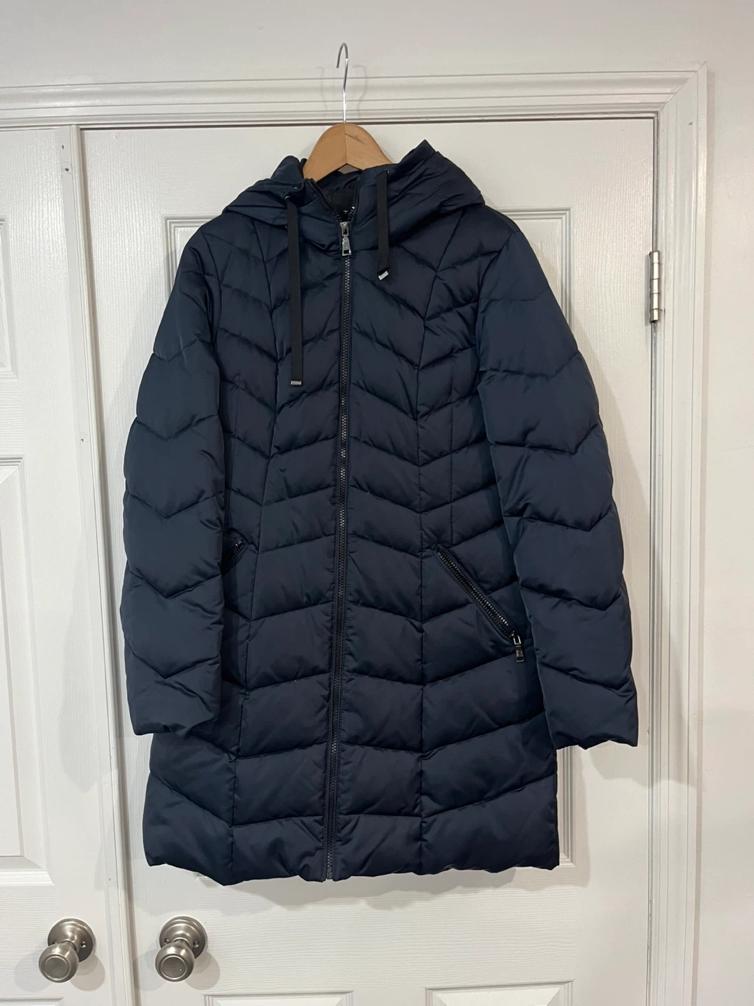 60Selling a Tahari puffer coat in navy blue! It's a size M/M. Perfect for staying warm and stylish during the colder months