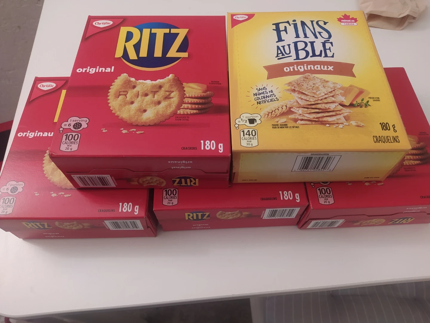 This listing includes Christie RITZ Original Crackers and FINS AU BLÉ Original Crackers. Each box is 180g. RITZ crackers are 100 calories per 20g serving, while FINS AU BLÉ crackers are 140 calories per 30g serving. Both contain no artificial flavours or colours.