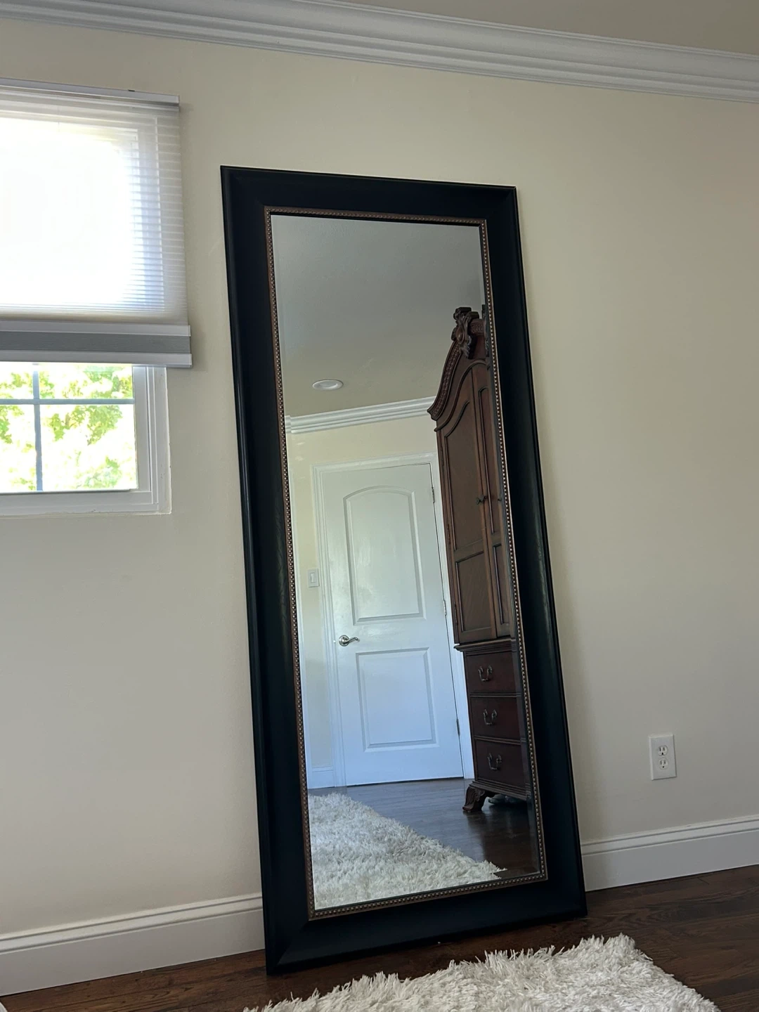 79.5” H x 33” W Tall framed mirror. It’s in great condition and ready to brighten up your space!
