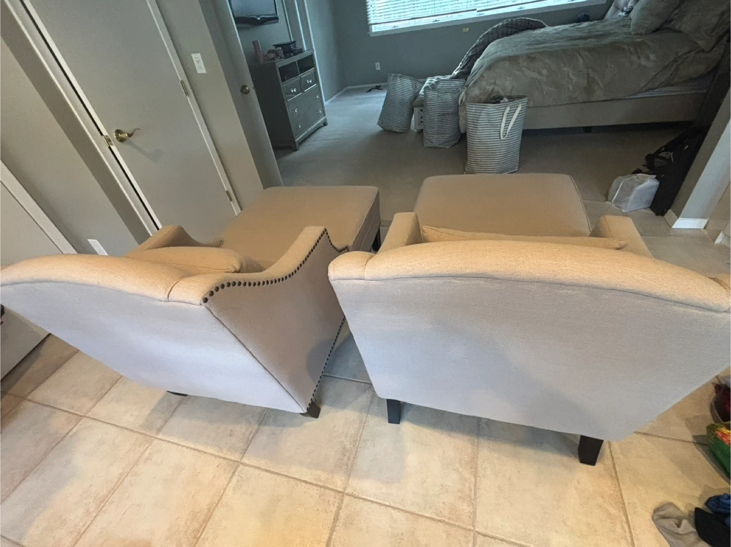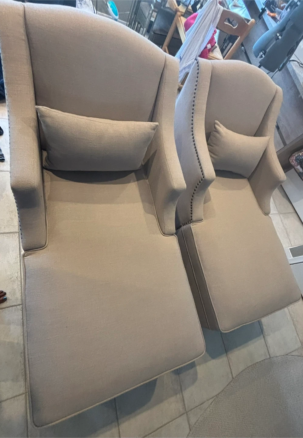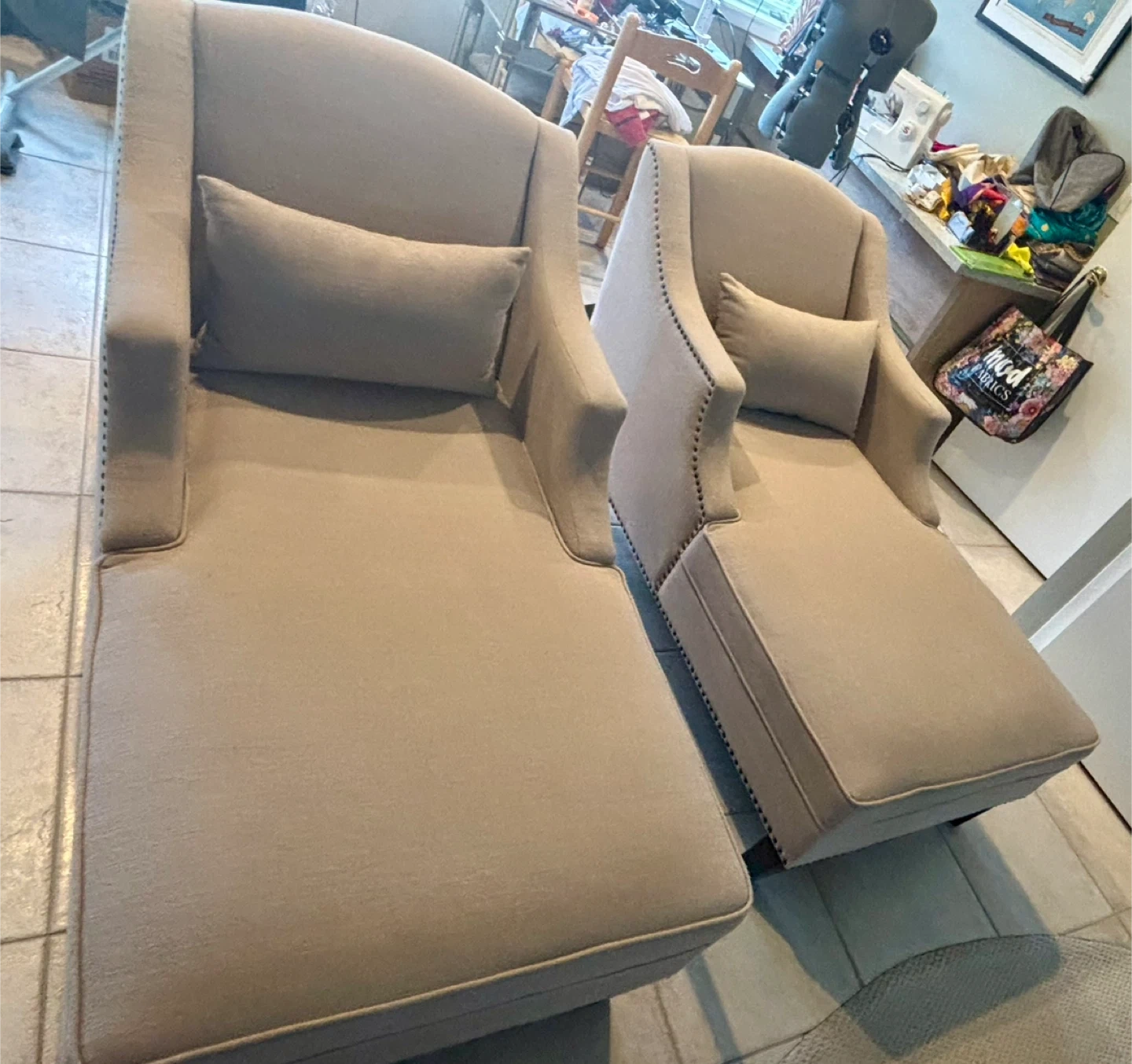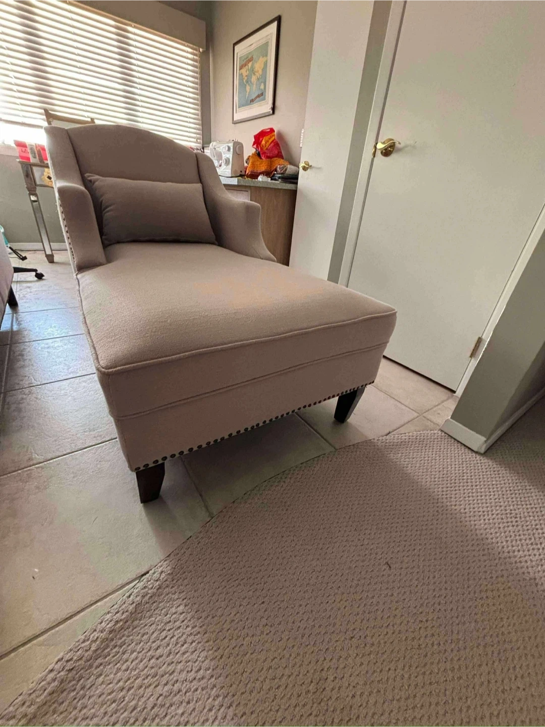 Selling a comfy tan chaise lounge chair! It's in great condition and would look great in any room. It has a neutral color and a pillow for extra comfort. Seat Height 17.5 back height 35. Width 30.5 length 61 inches. 2 available. Asking $110 each.