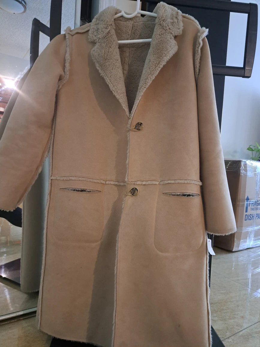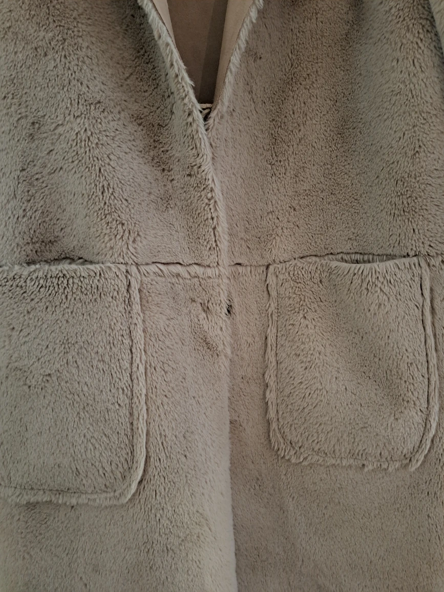 60Selling a cozy tan faux fur coat! It's in great condition and perfect for staying warm and stylish during colder weather. The coat features a soft, plush faux fur exterior and a smooth lining. It has a classic design with a collared neckline and front pockets. This coat is sure to be a great addition to your wardrobe!
