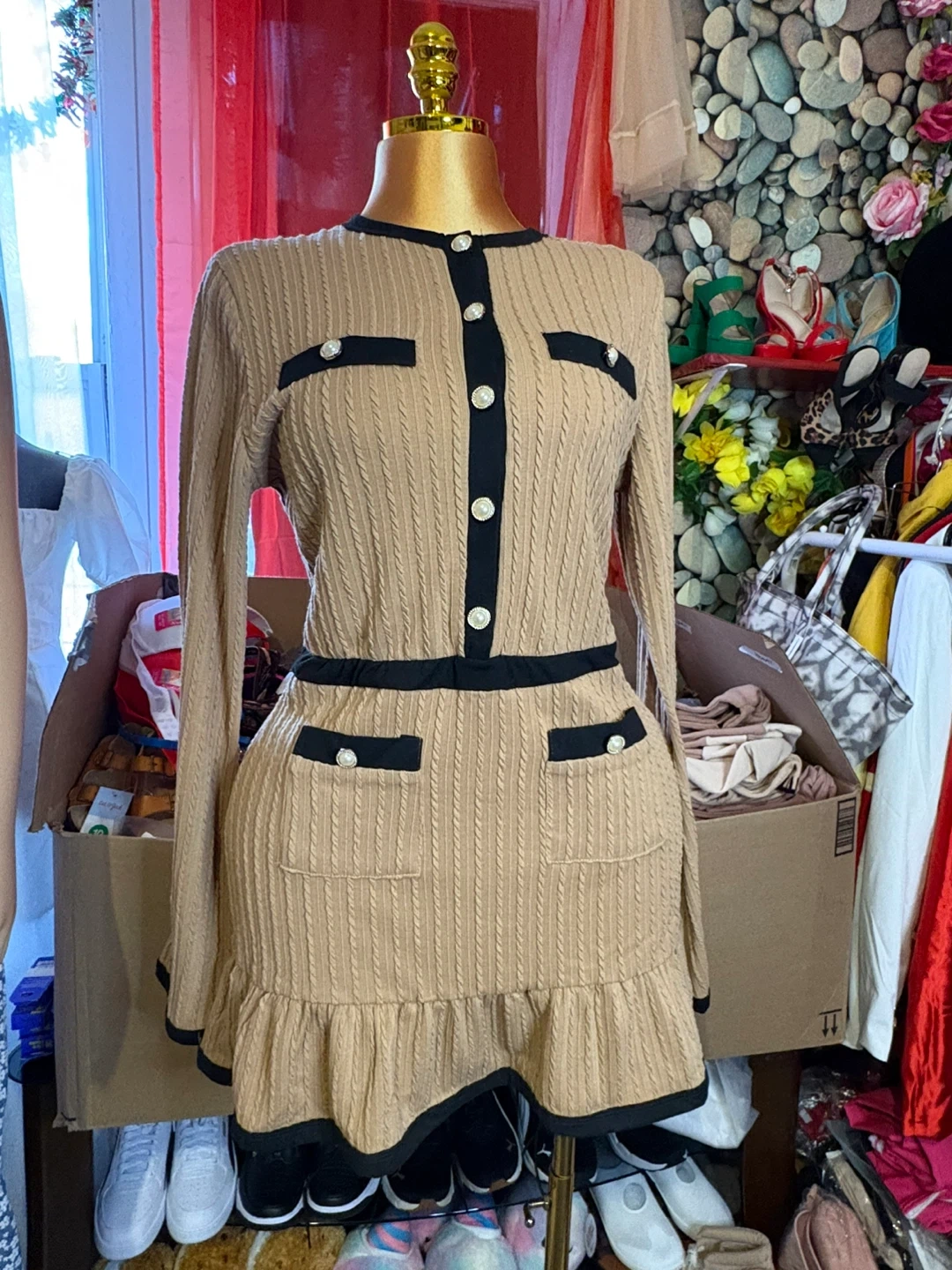 153This is a cute tan knit dress with black trim. It features a button-down front and two front pockets. The dress has a ruffled hem and is made of a comfortable knit material. It's perfect for a casual day out or a dressy occasion!
