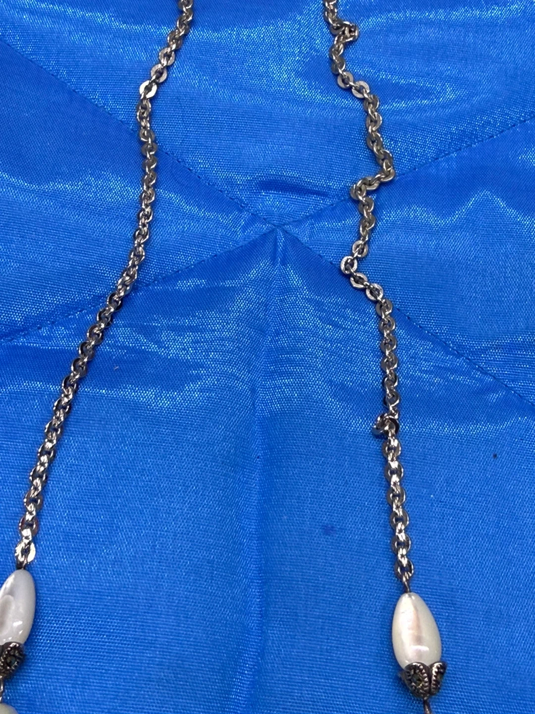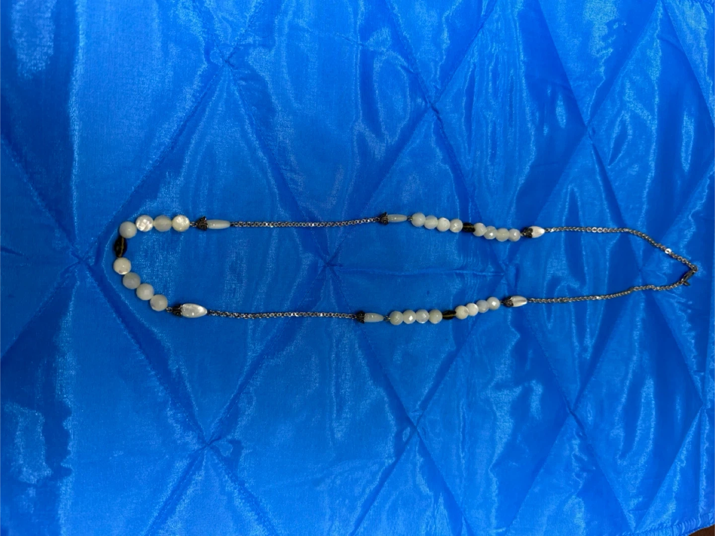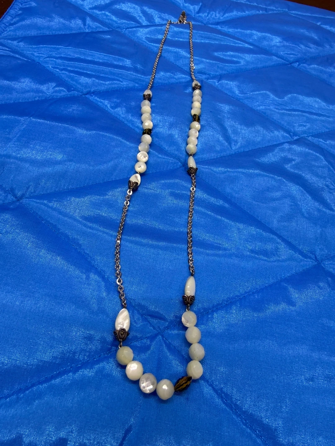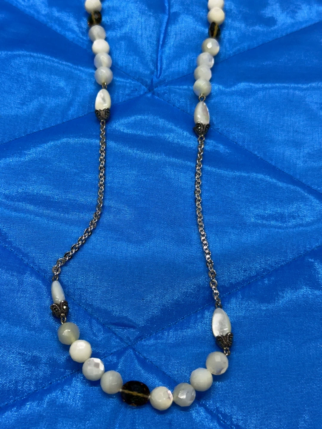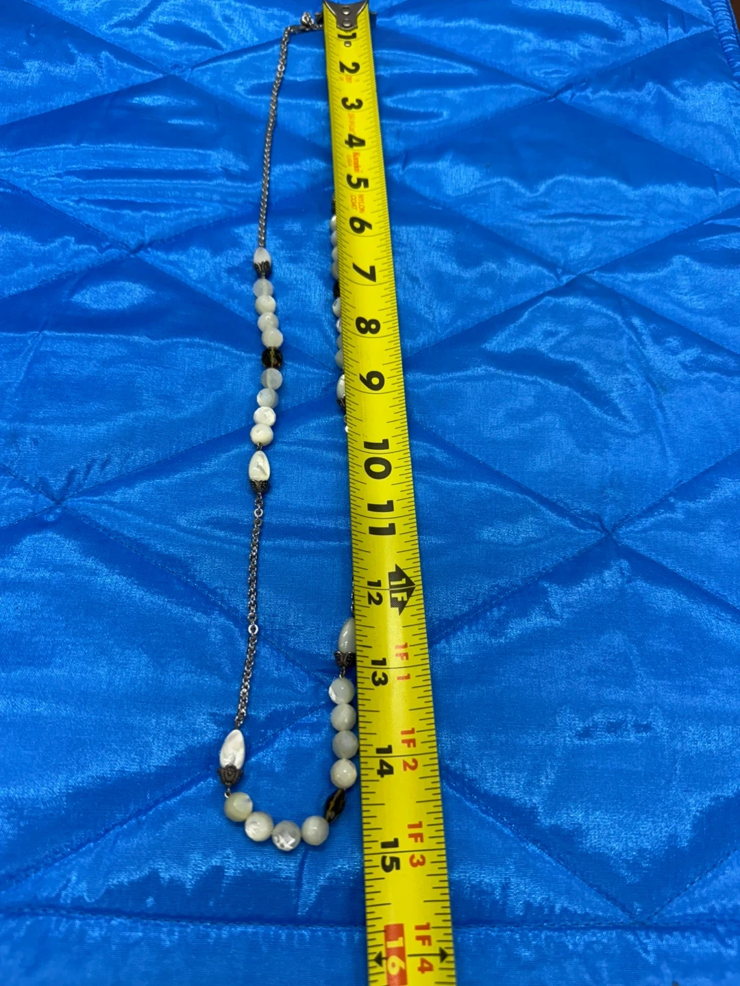 This necklace features a sterling silver chain with various white and translucent beads, including some with a pearlescent finish and a darker accent bead. It has a lobster clasp closure. The length is approximately 16 inches.