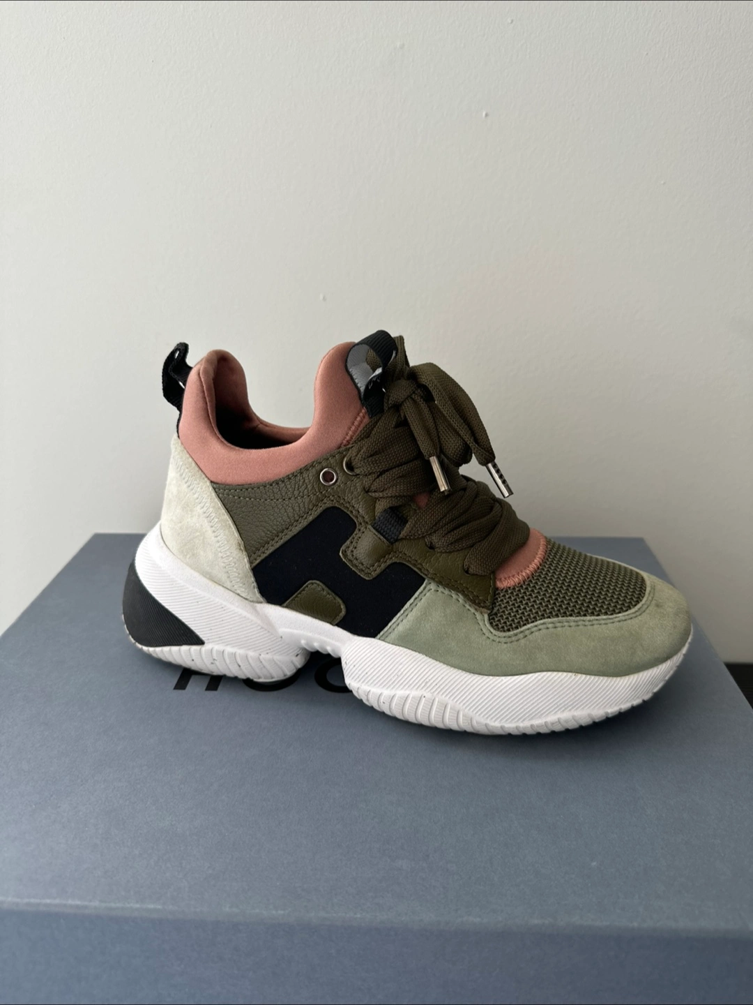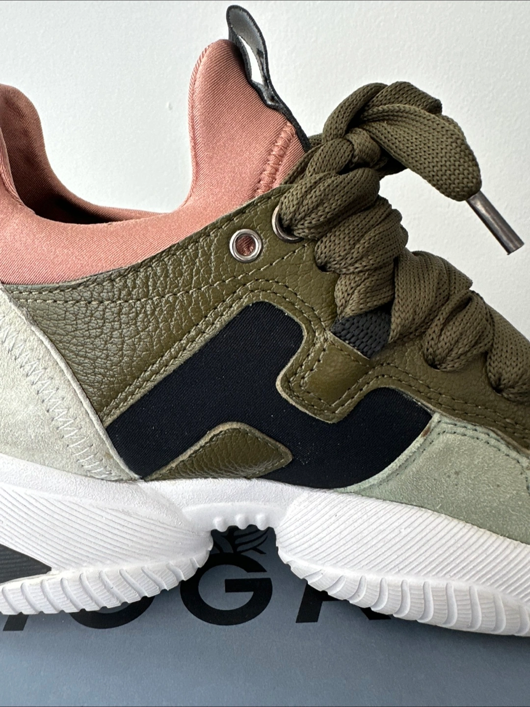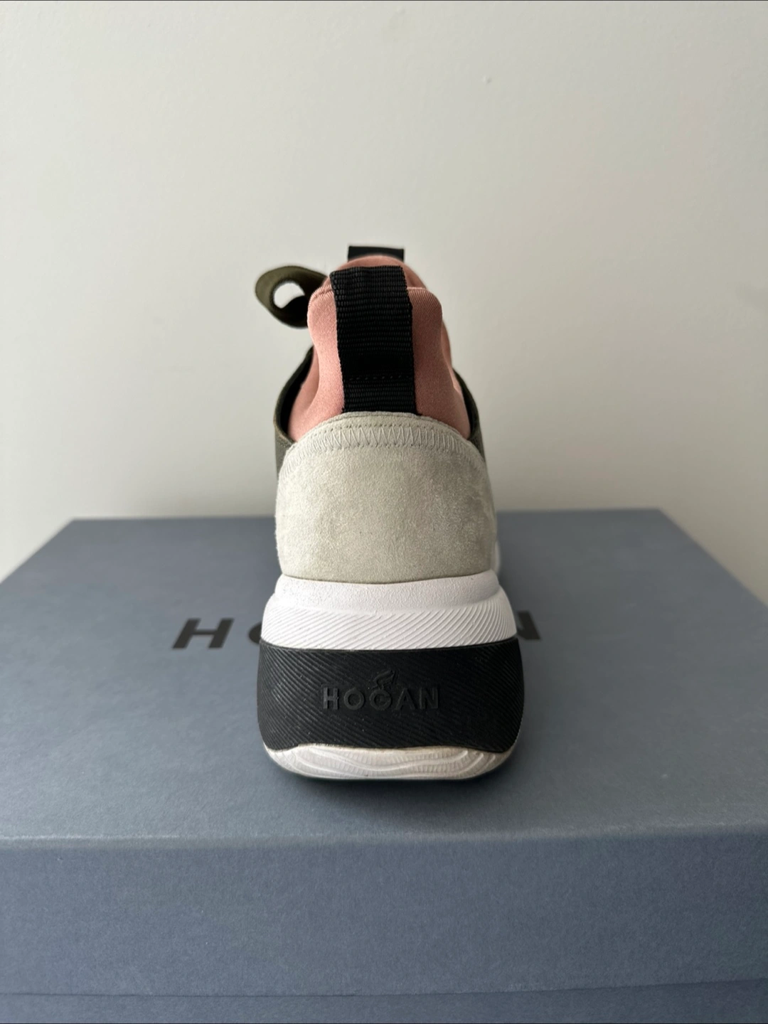 These Hogan sneakers are a stylish mix of olive green, pink, and black. They're made with suede and mesh materials for a comfortable fit. Comes with extra laces and a dust bag. Perfect for everyday wear!