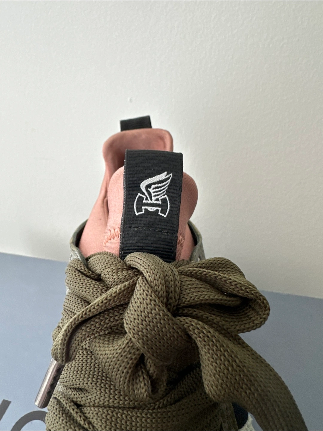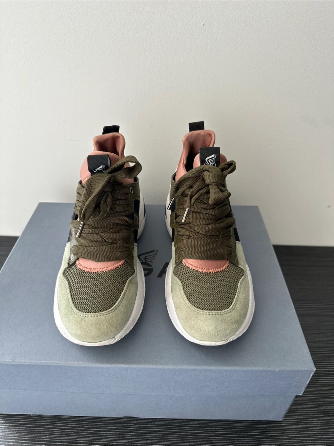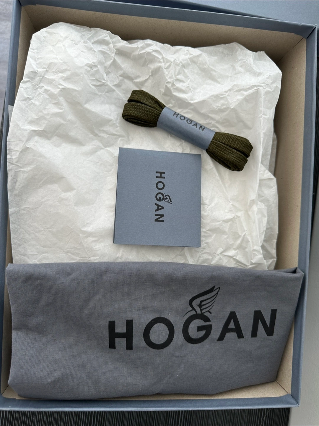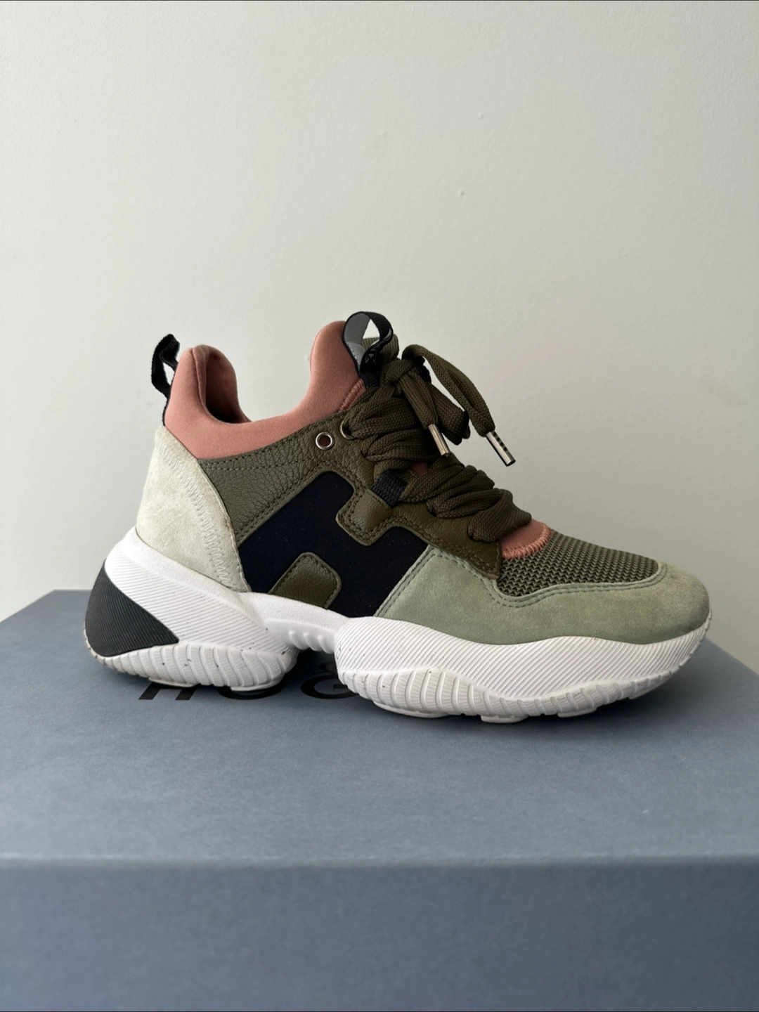 These Hogan sneakers are a stylish mix of olive green, pink, and black. They're made with suede and mesh materials for a comfortable fit. Comes with extra laces and a dust bag. Perfect for everyday wear!