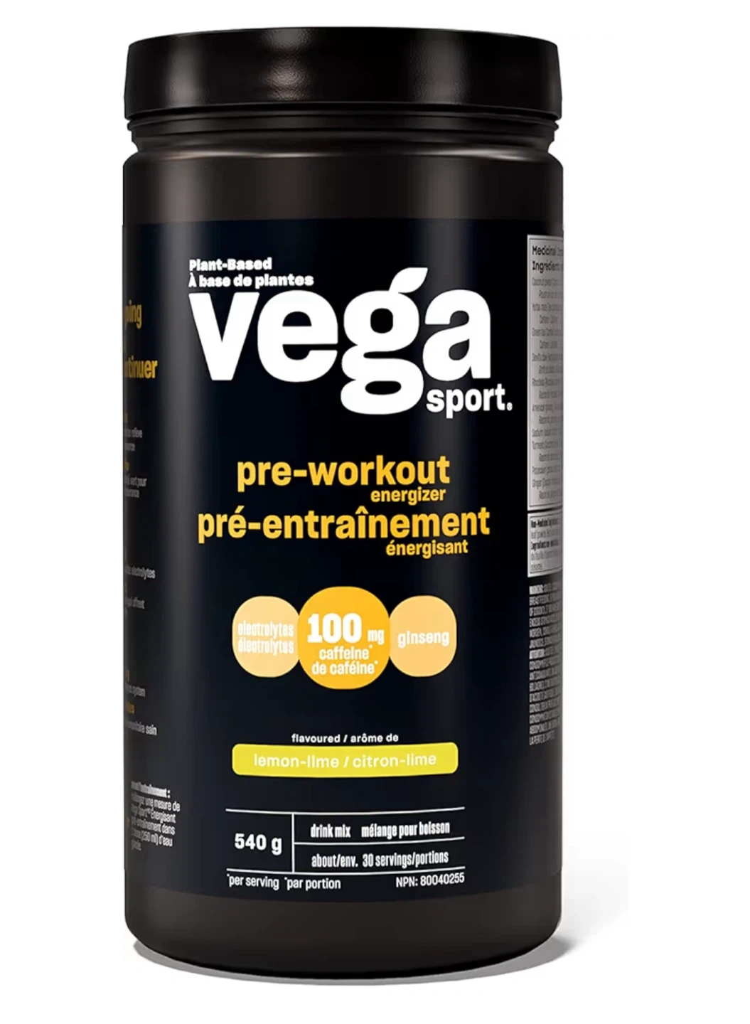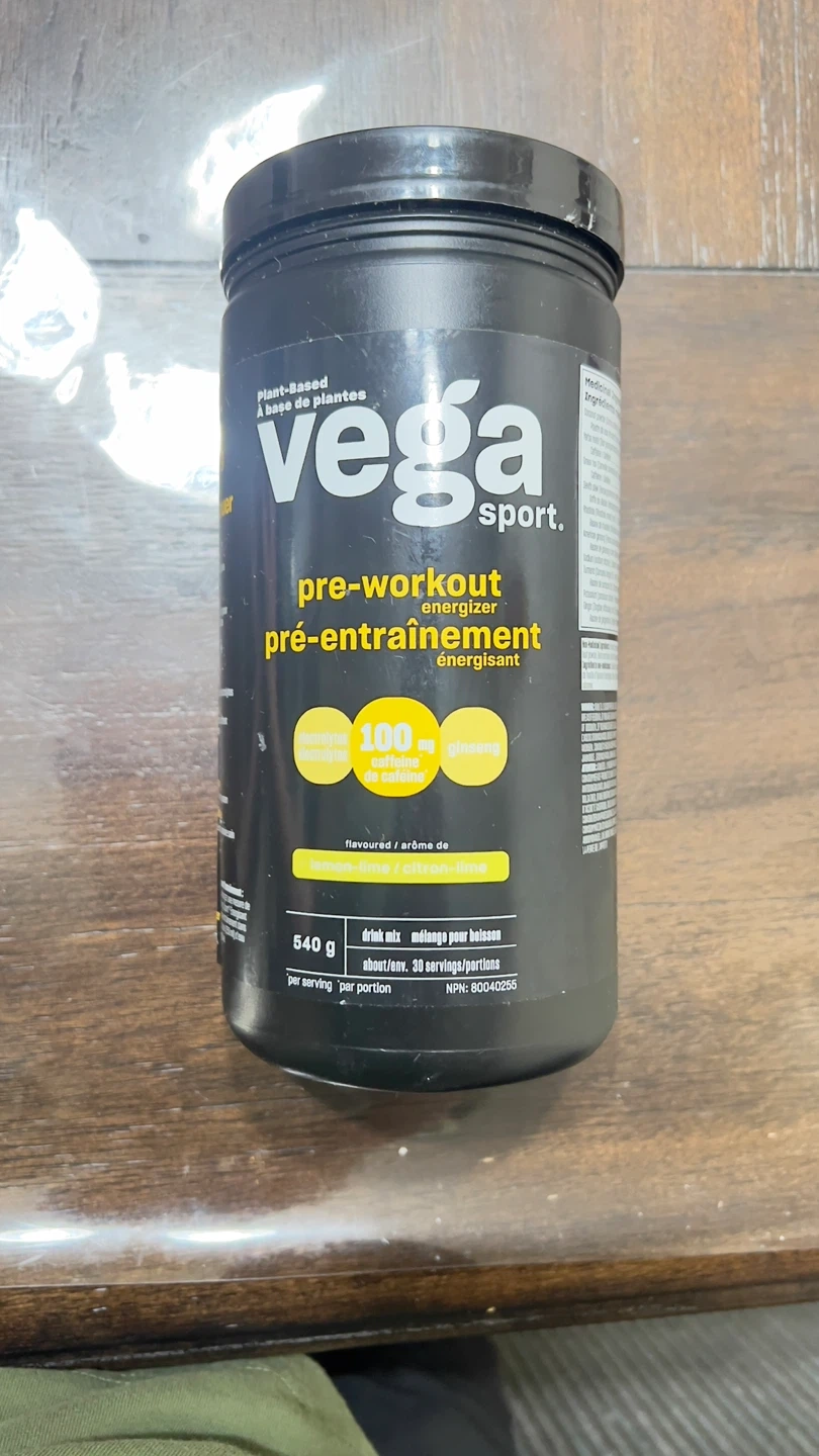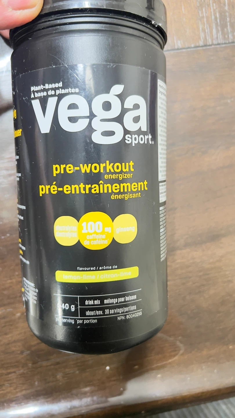 Plant-based Vega Sport pre-workout energizer in lemon-lime flavour. It contains 100 mg of caffeine per serving and electrolytes. 540g container, about 30 servings. Expiration date is 05/2028