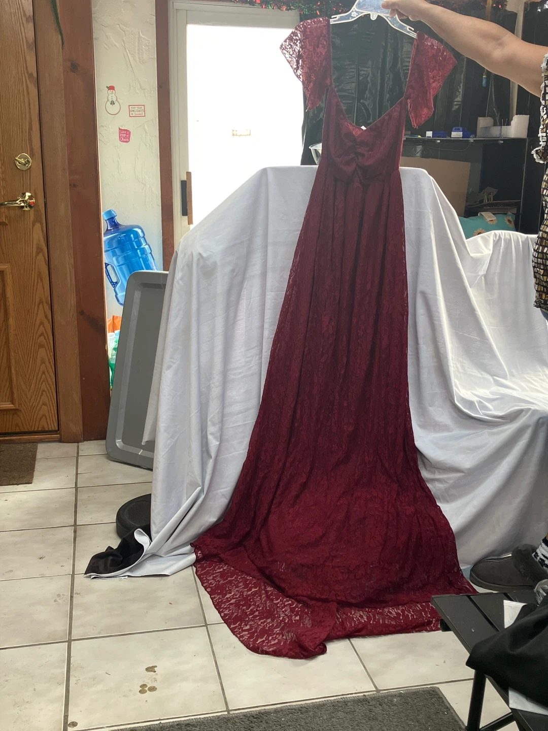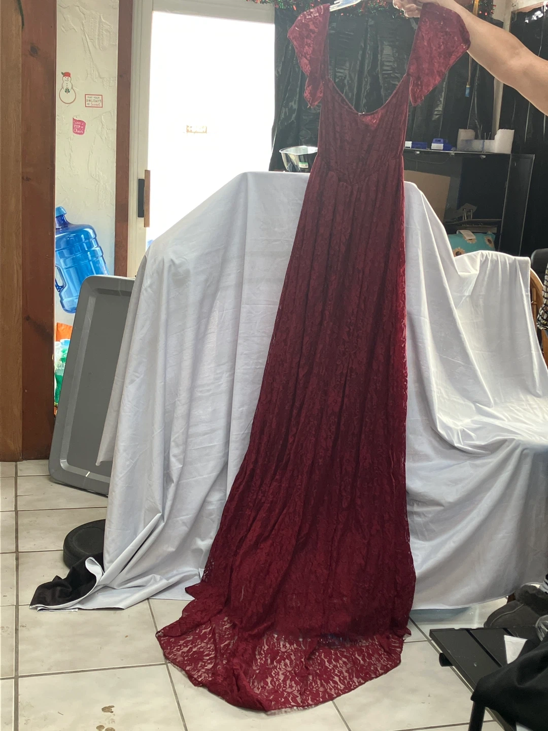 A beautiful burgundy lace formal gown with short flutter sleeves and a sweetheart neckline. It features a floor-length skirt with a train. This dress is perfect for special occasions.