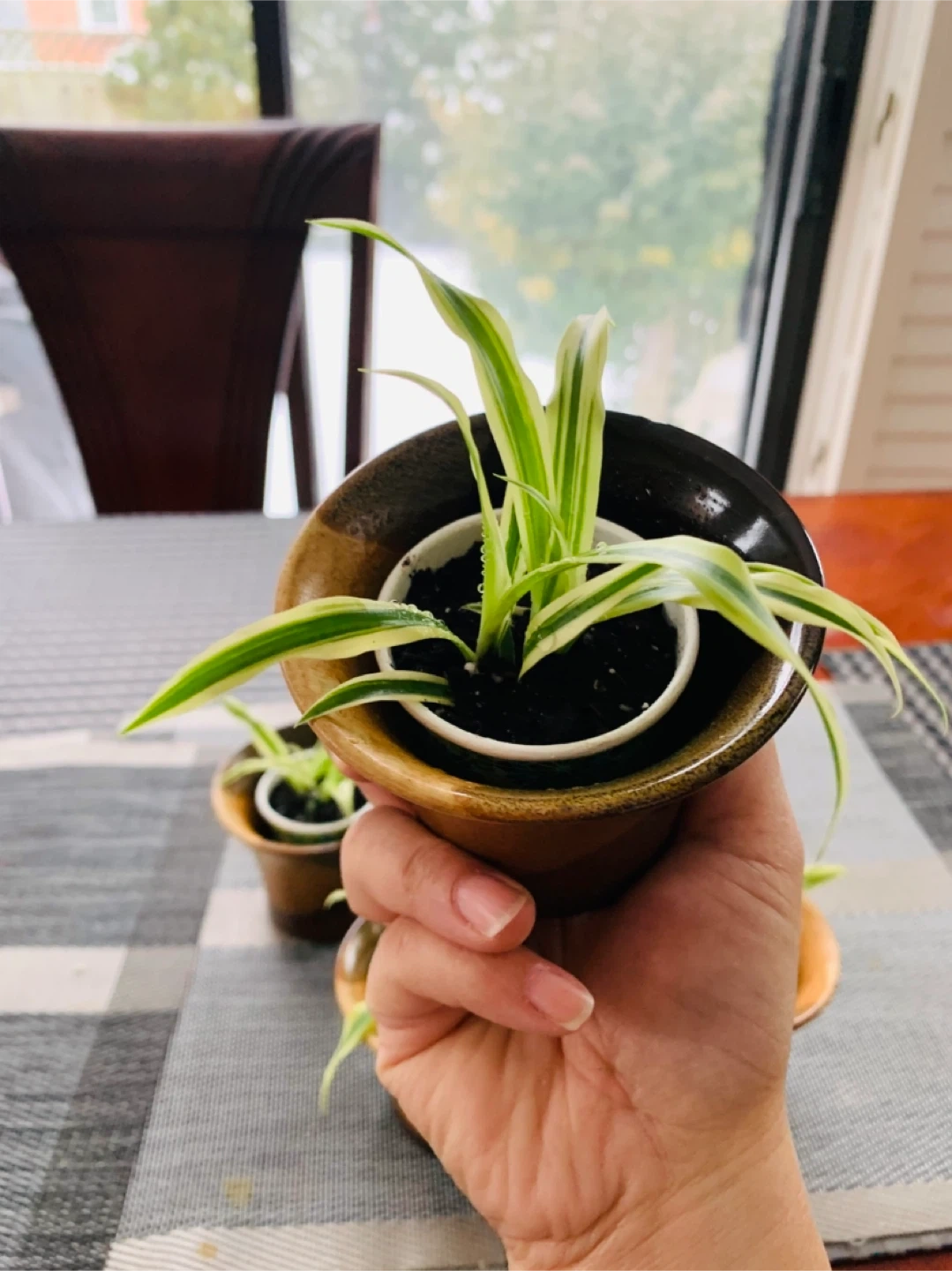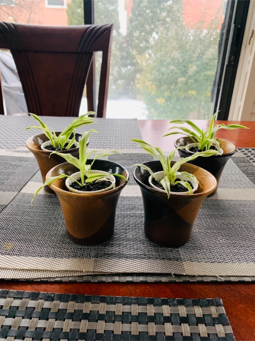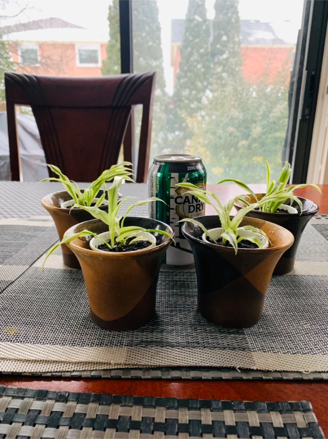 Healthy Baby Spider Plants (spiderettes) great for both indoors & outdoors! Potted Dec1. Pop can for size comparison.