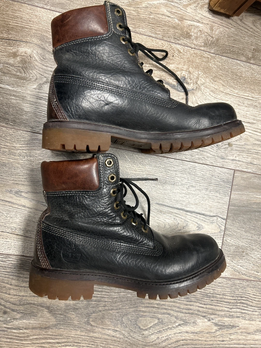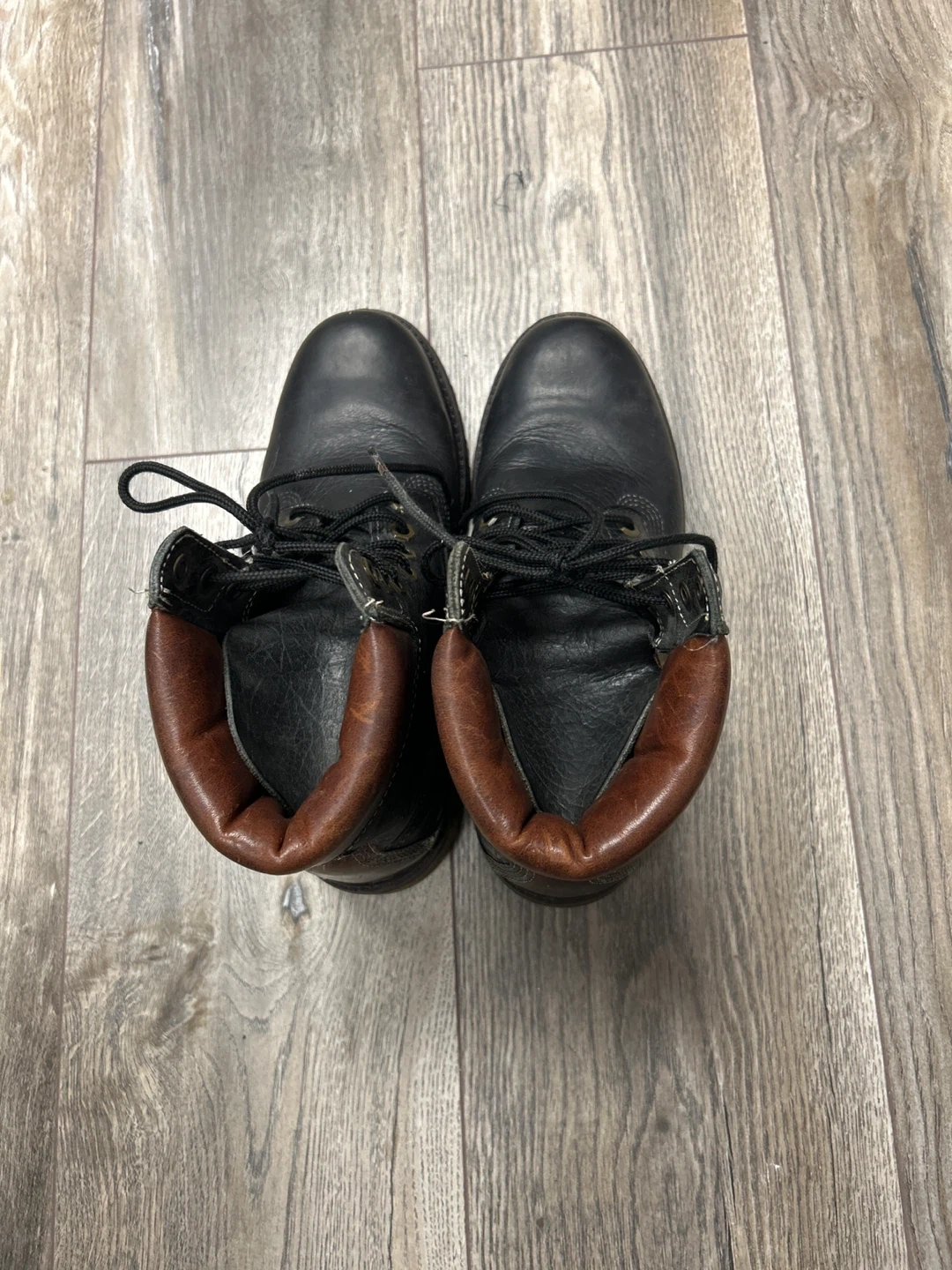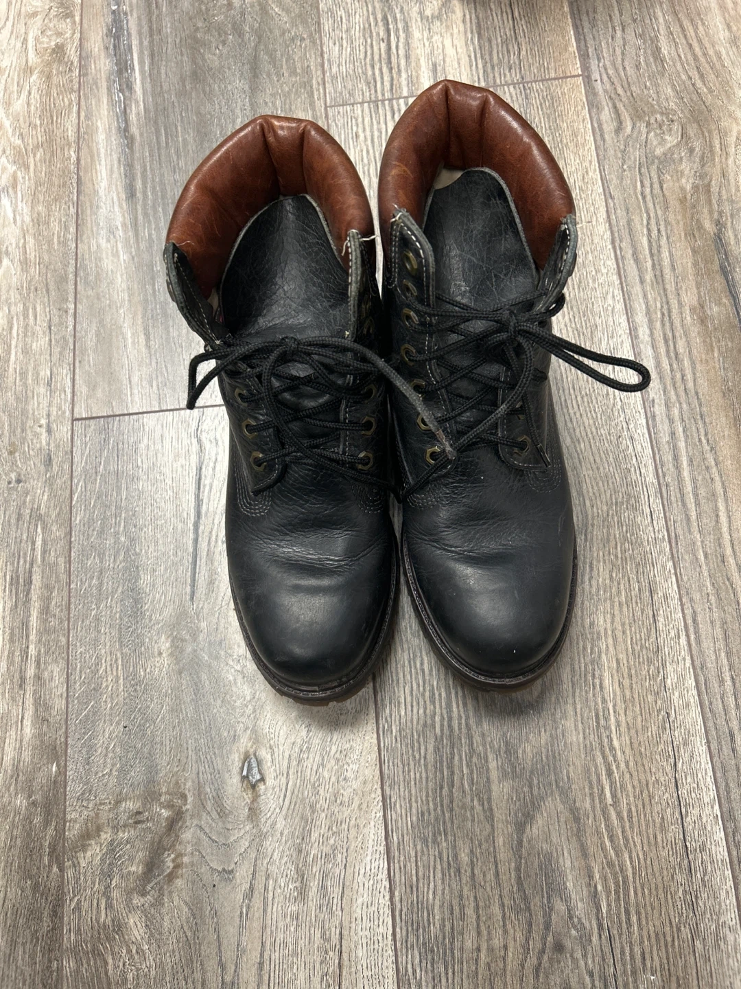 These are black leather work boots. They feature a lace-up closure and a durable sole. The brown collar adds a classic touch to the design. They're suitable for tough jobs.they look unisex
