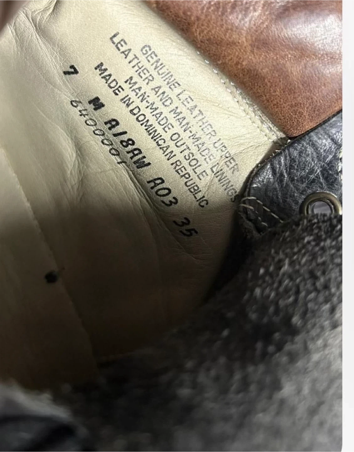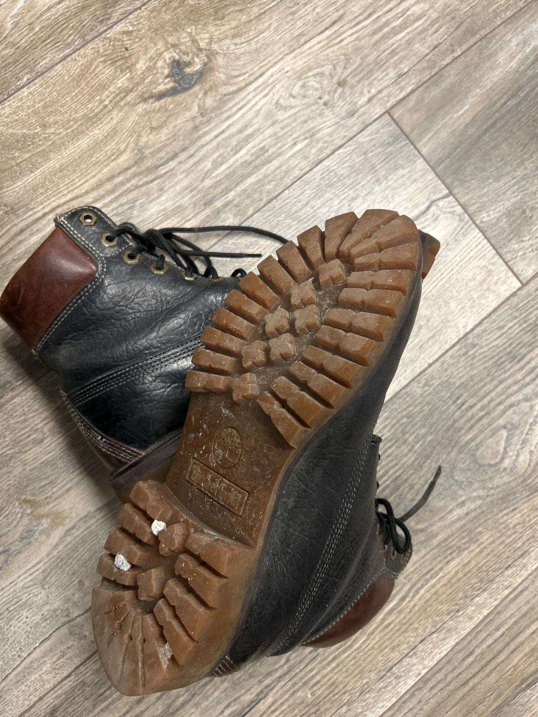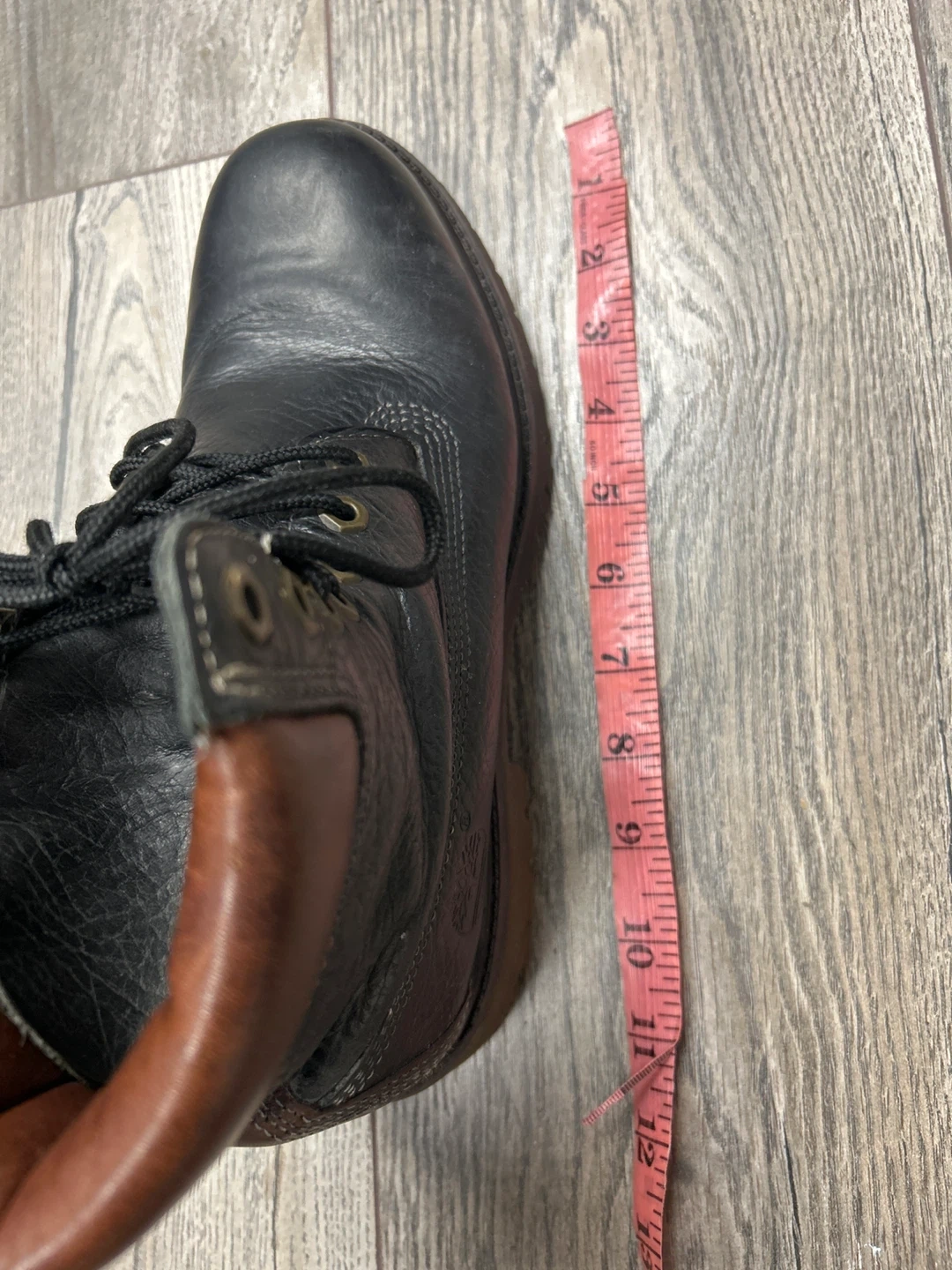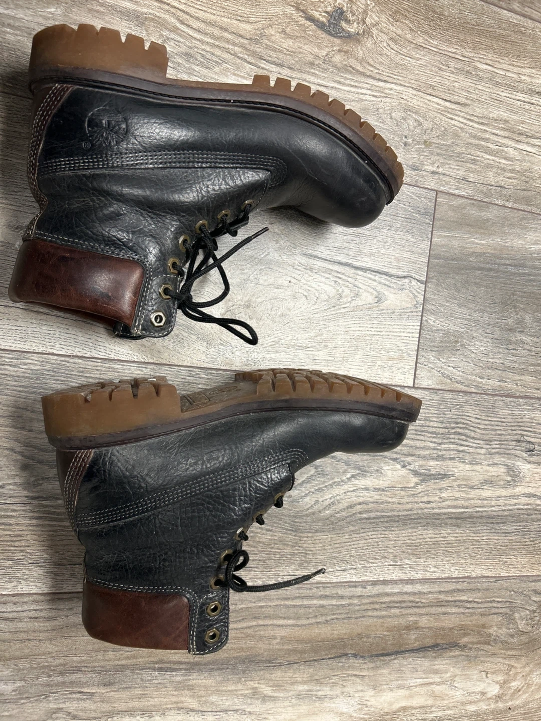 These are black leather work boots. They feature a lace-up closure and a durable sole. The brown collar adds a classic touch to the design. They're suitable for tough jobs.they look unisex