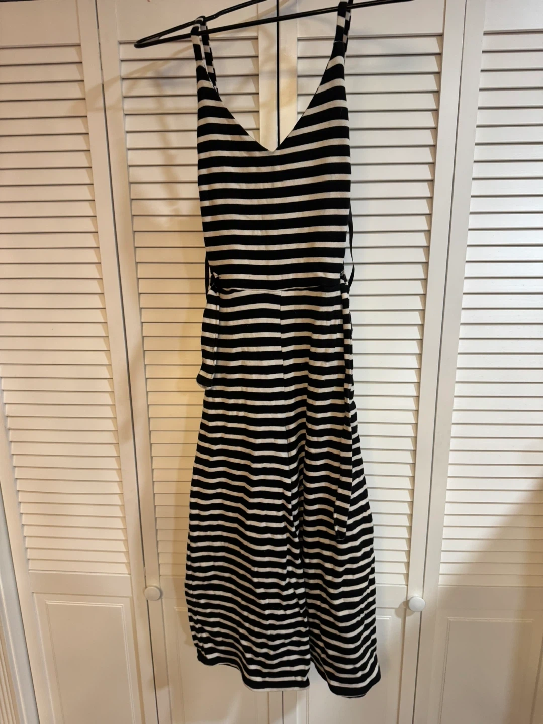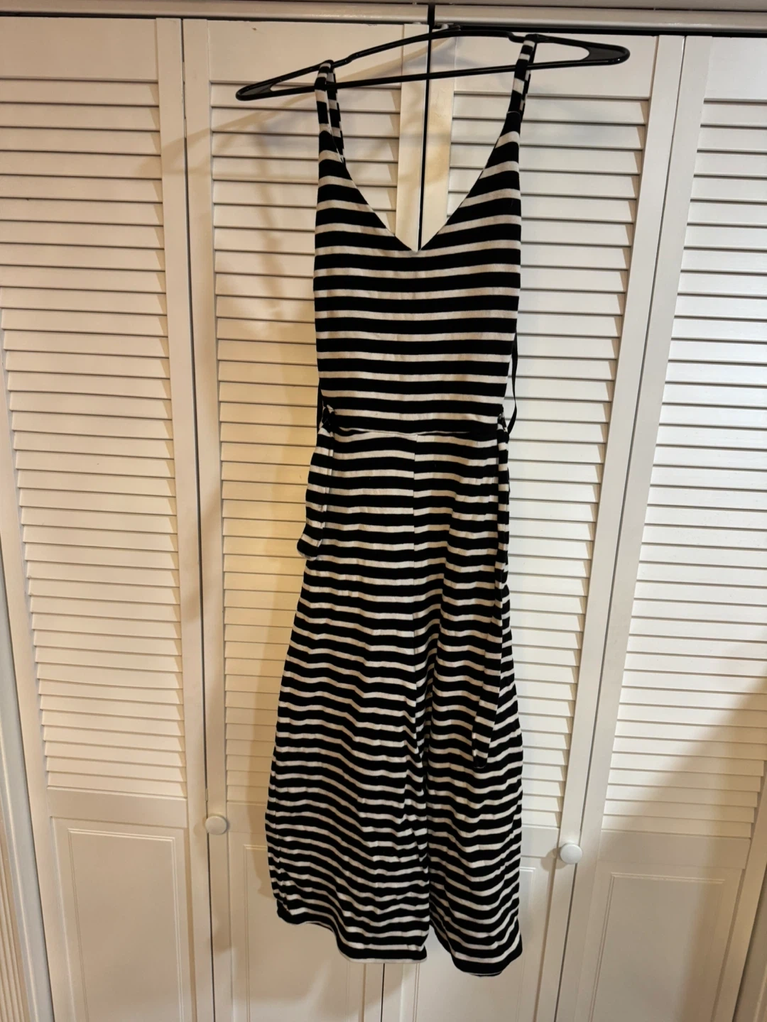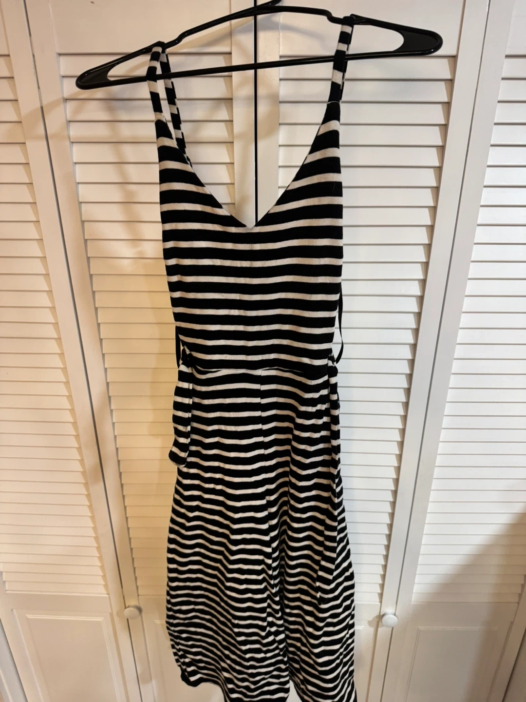 This is a fun and stylish black and white striped jumpsuit! It's perfect for a casual day out or dressing up for a night on the town. The material is lightweight and comfortable. It's in great condition and ready for a new owner!