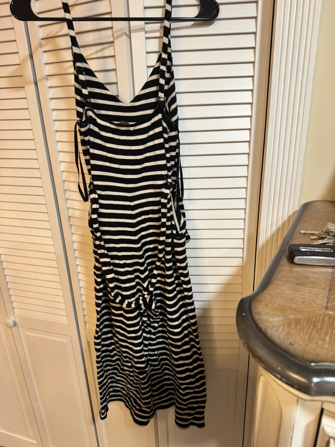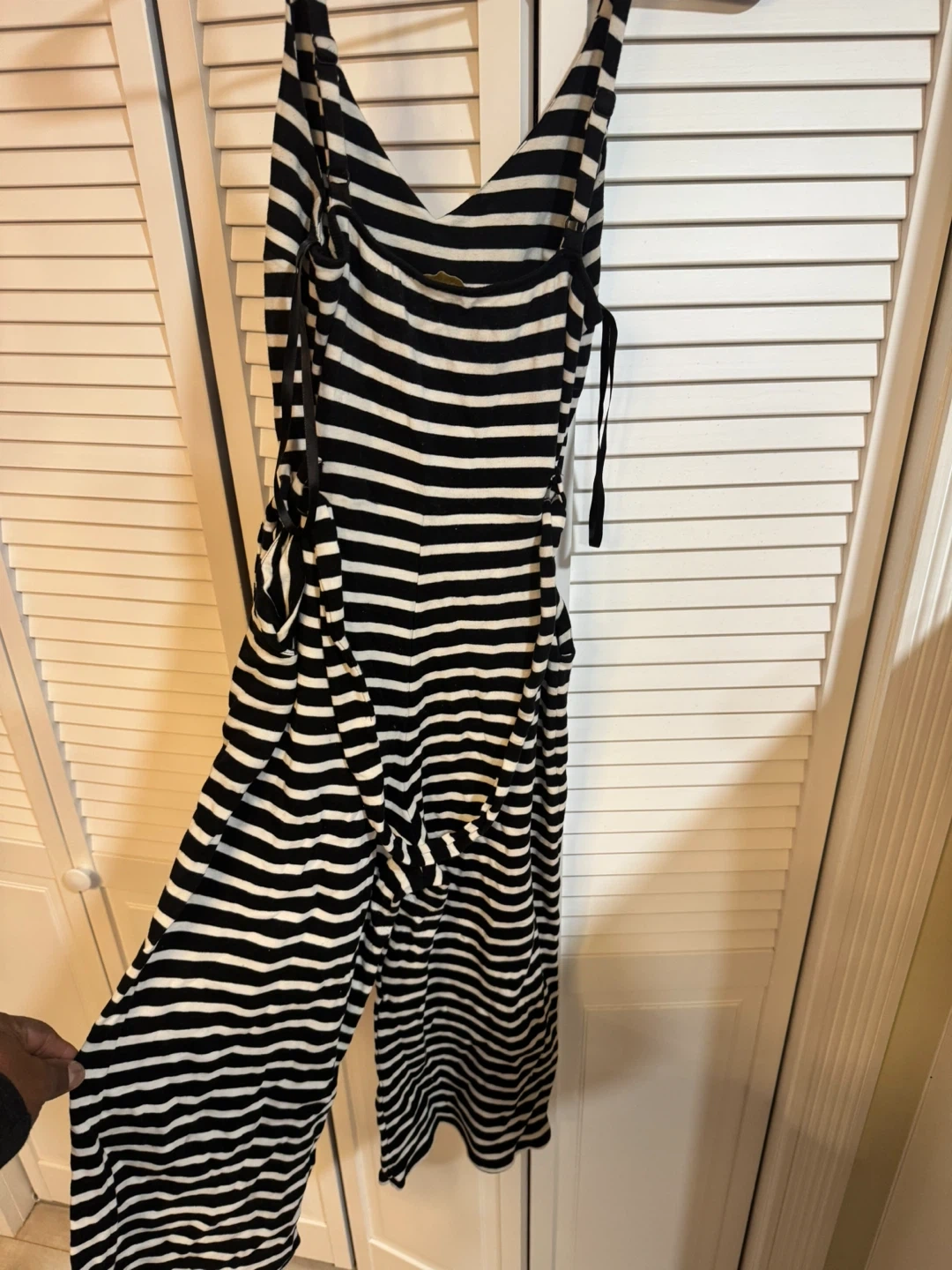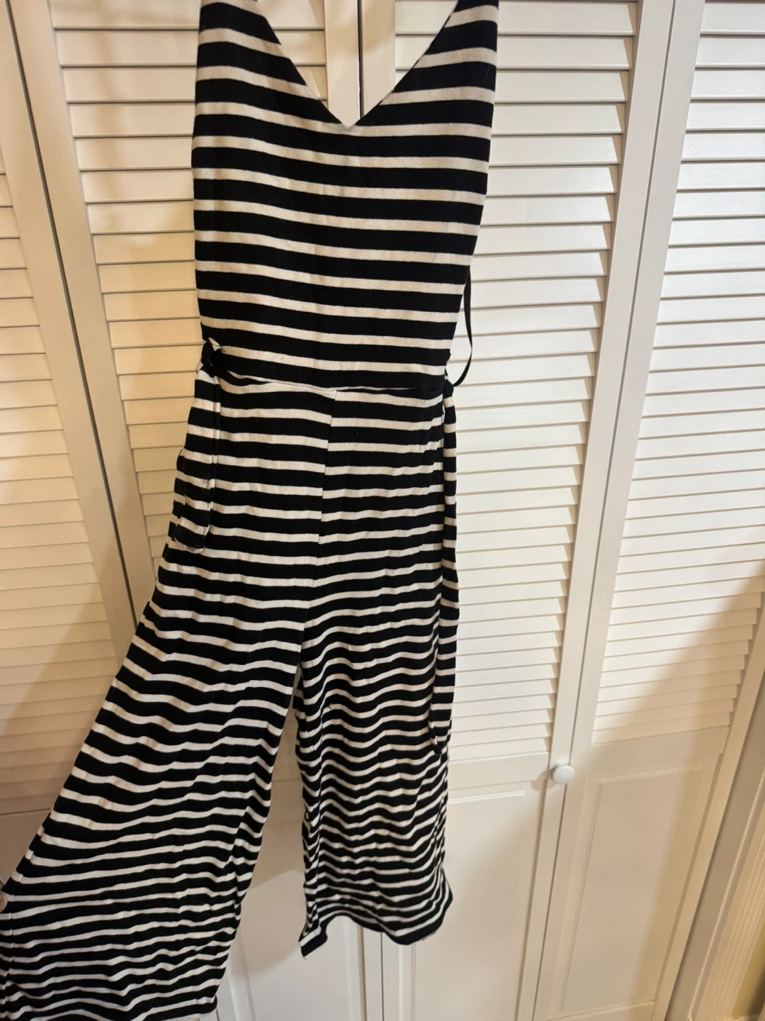 This is a fun and stylish black and white striped jumpsuit! It's perfect for a casual day out or dressing up for a night on the town. The material is lightweight and comfortable. It's in great condition and ready for a new owner!