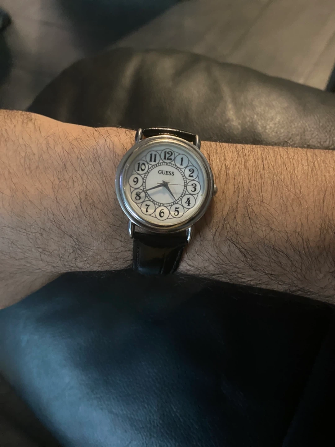 This is a Guess wristwatch with a classic white face and black leather band. It features an analog display with clearly marked numbers. The watch is suitable for everyday wear.