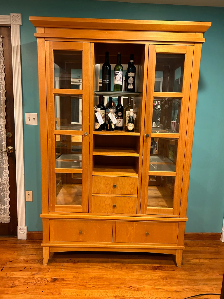 Tall wooden curio cabinet. Glass doors. Multiple shelves and drawers. Perfect for displaying collectibles or storing wine.