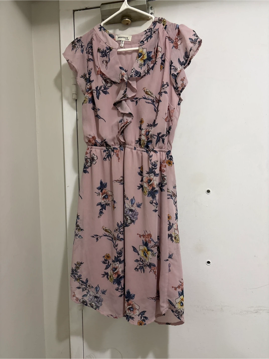 Monteau women's dress in a lovely pink floral print. It features short flutter sleeves and a ruffled neckline. The waistband is elasticated for a comfortable fit.