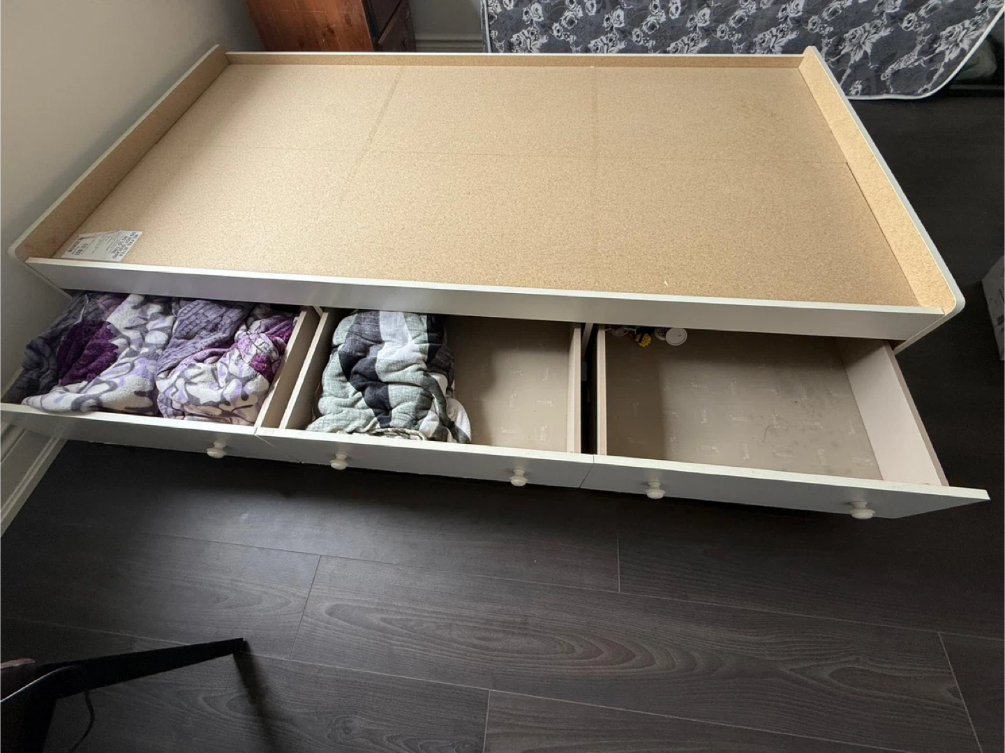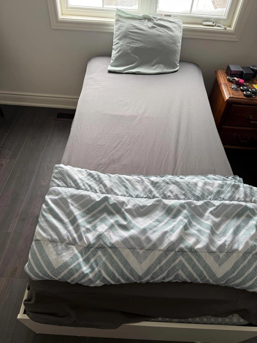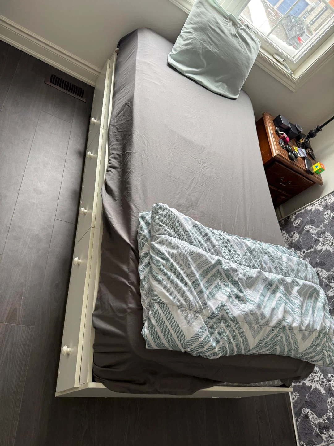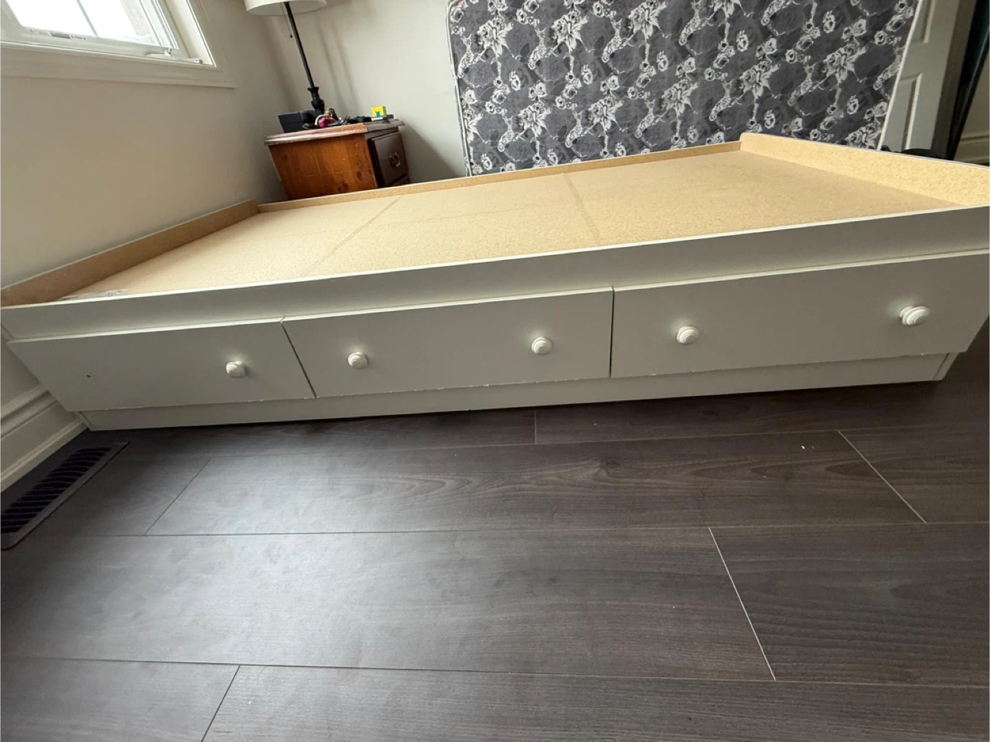 Functional single bed with spring mattress. It also has 3 spacious drawers. Fully detachable. Easy to carry. Can fit in a big SUV or a pickup truck. Mattress is also in a good condition.