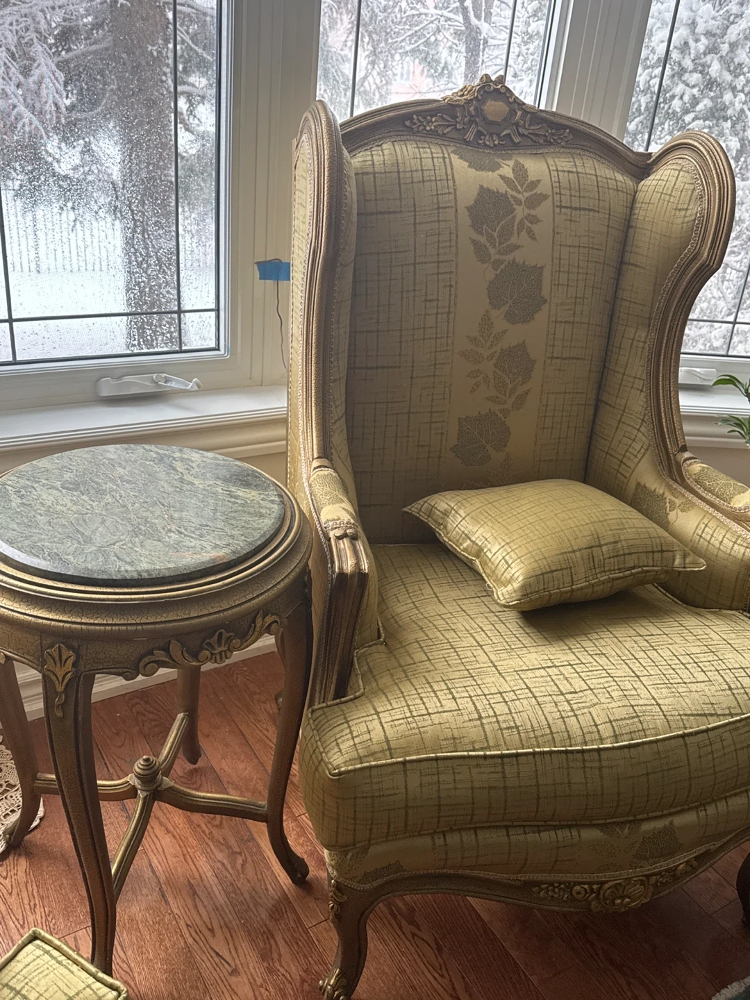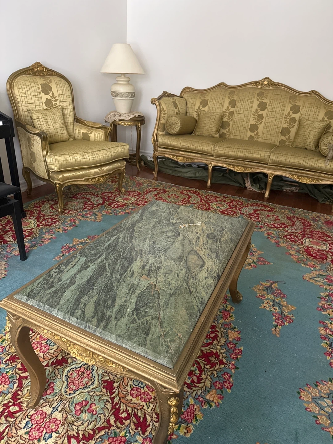 A vintage ornate sofa and two matching armchairs upholstered in a gold patterned fabric. Features include carved wood details and multiple accent pillows. This classic furniture set adds elegance to any living space. Suitable for formal sitting areas or drawing rooms.