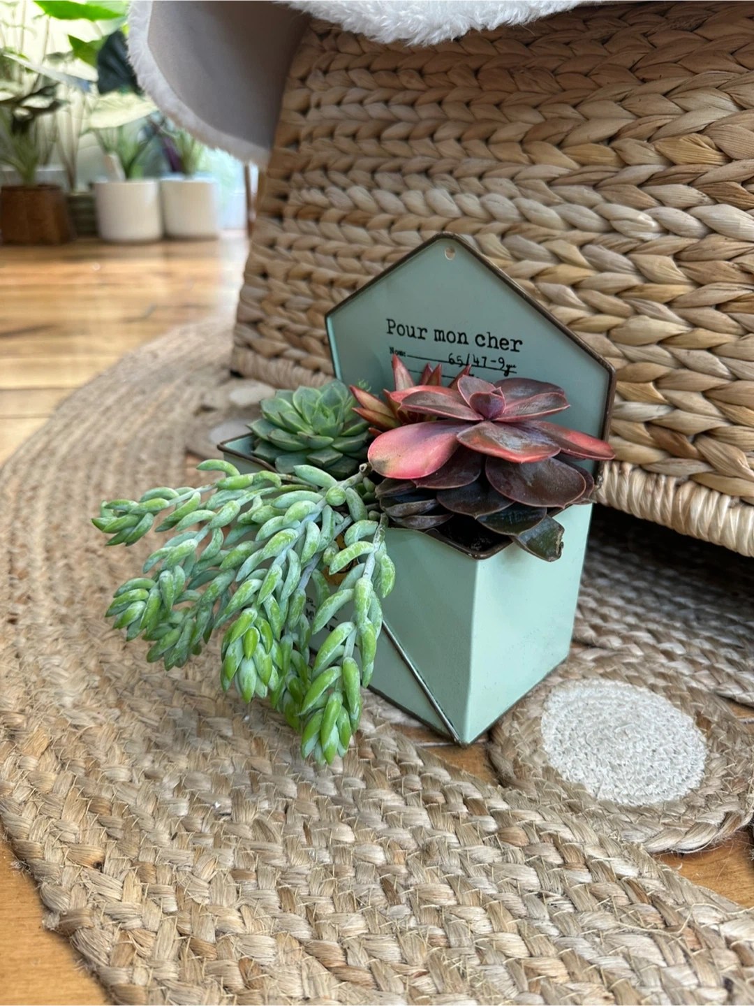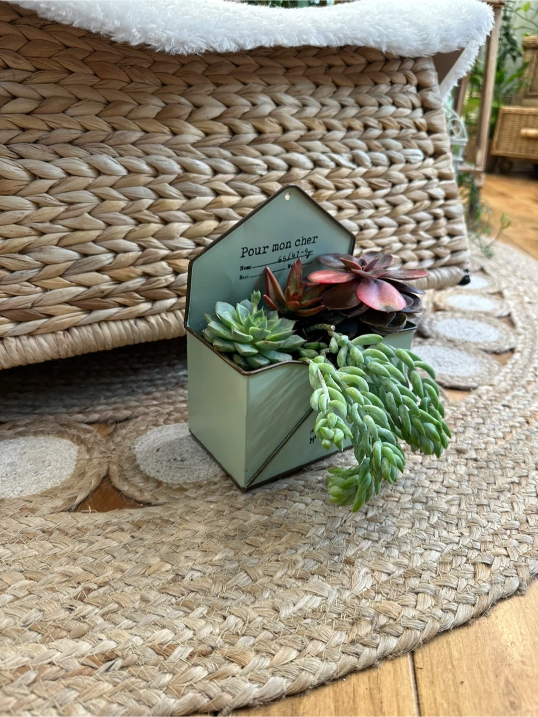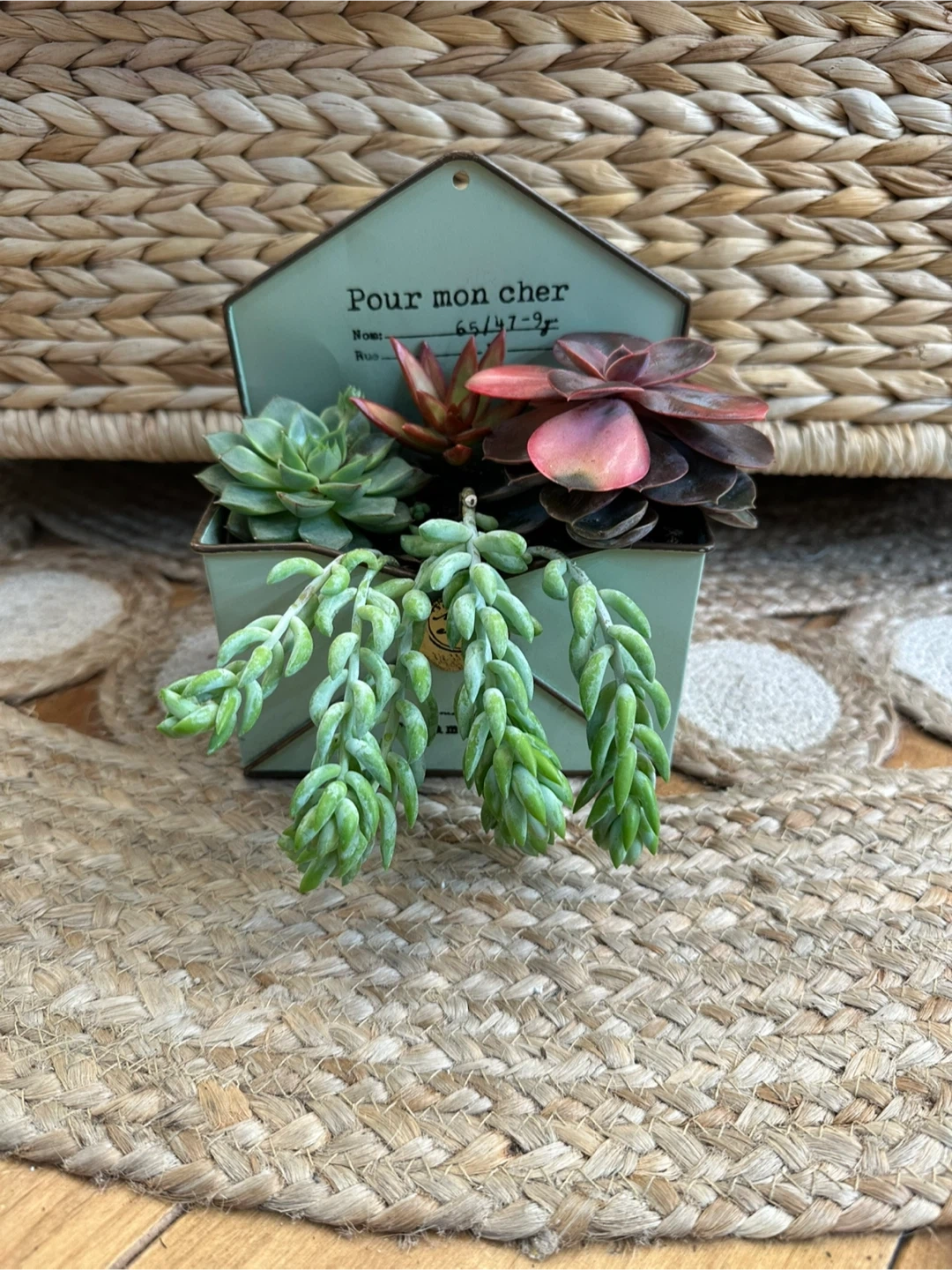 Lovely arrangement of assorted succulents in a charming light green metal mailbox planter with bottom drainage. Can be wall mounted or placed on a bright, sunny shelf or desk. Delightful addition to any home or office and is easy case with minimal watering needs (average 1xmonth)