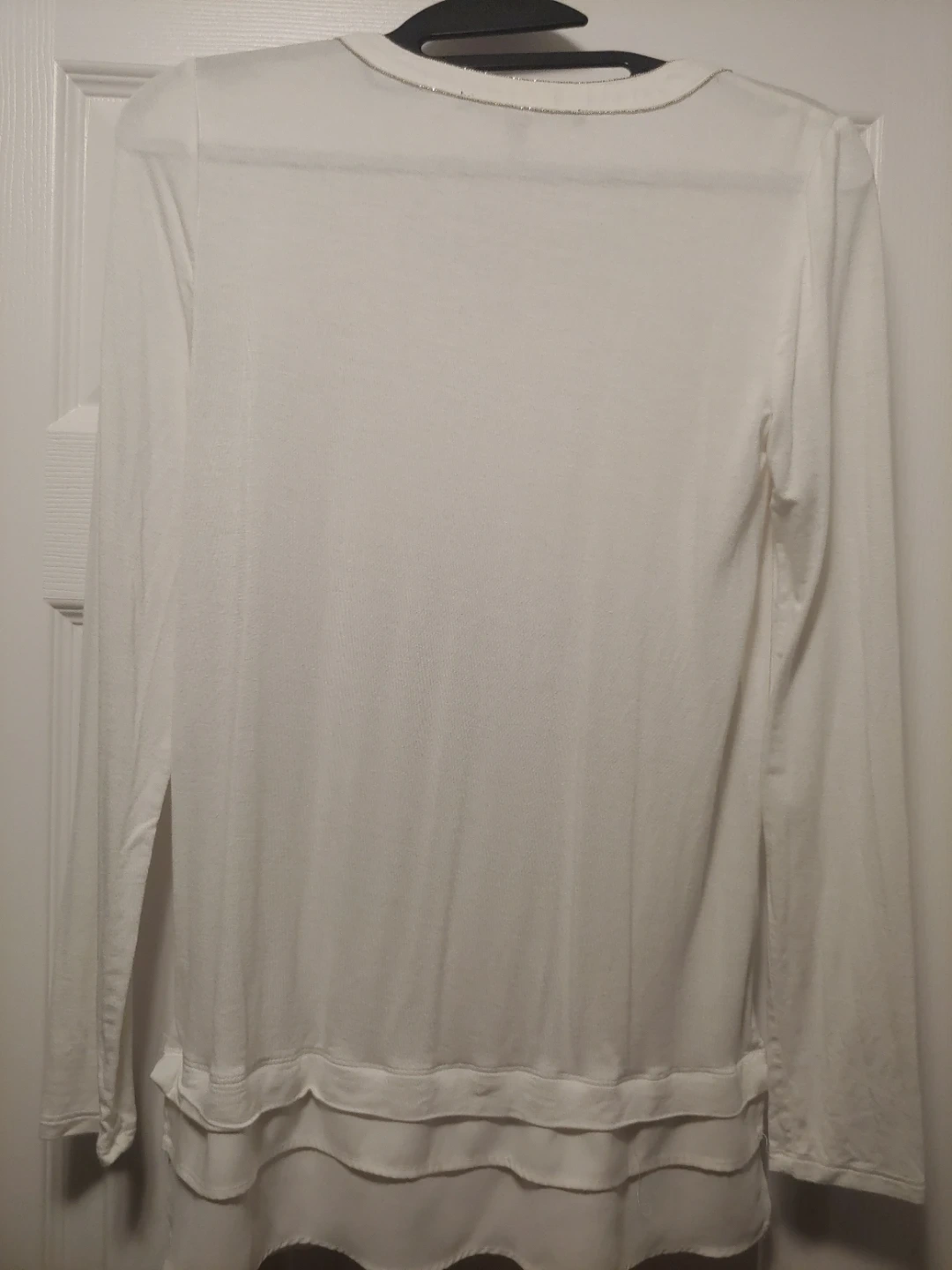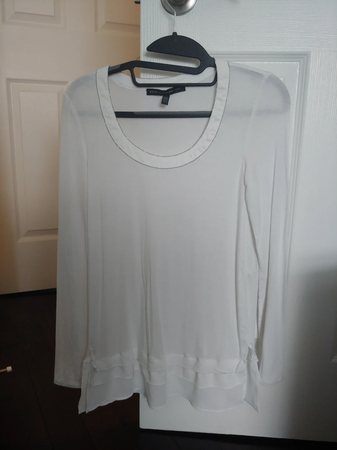 Like new simple white long-sleeved top from White House Black Market. It features subtle bead detailing around the neckline and a layered hemline. Like new condition. Fits like an XS
