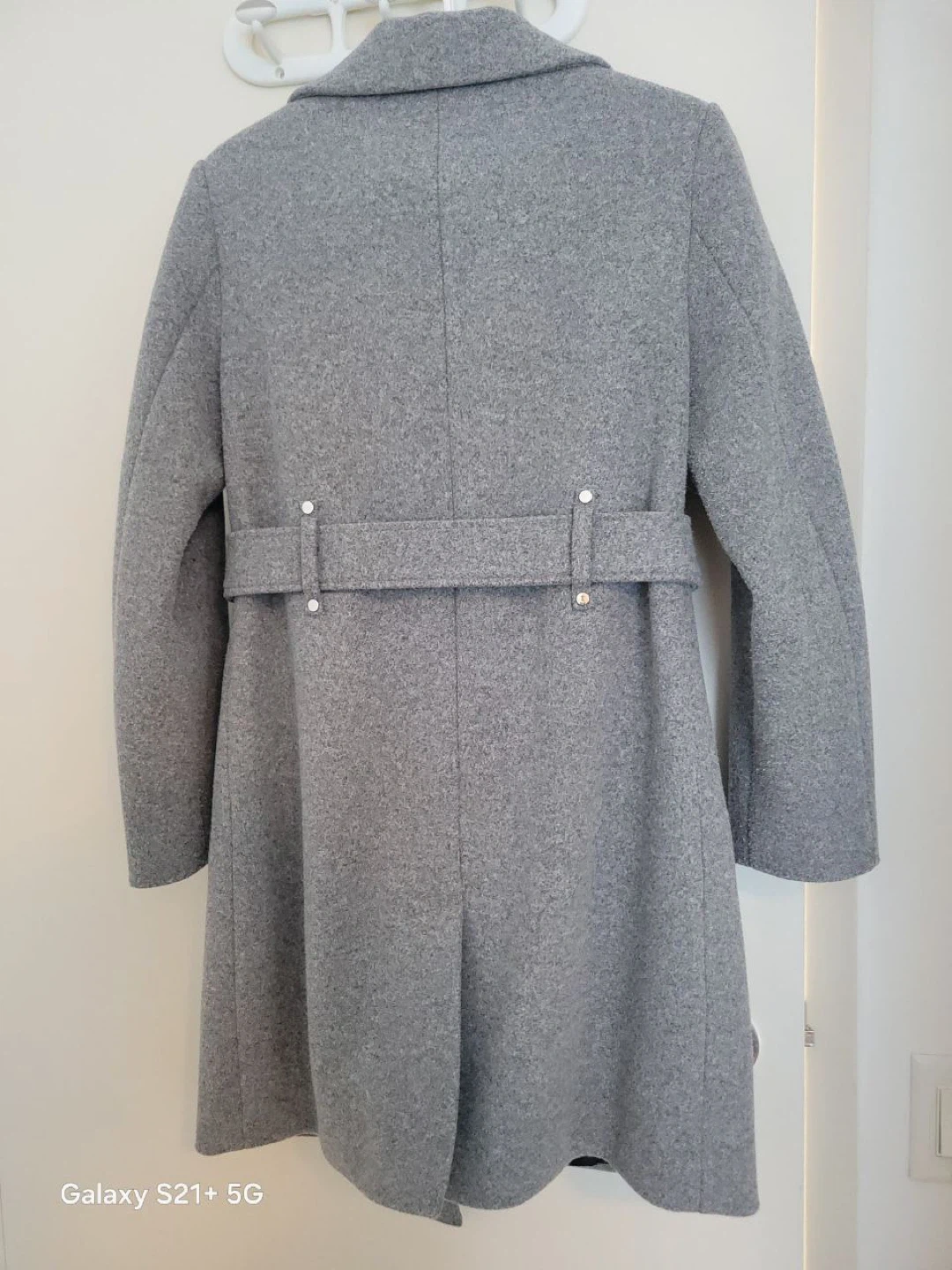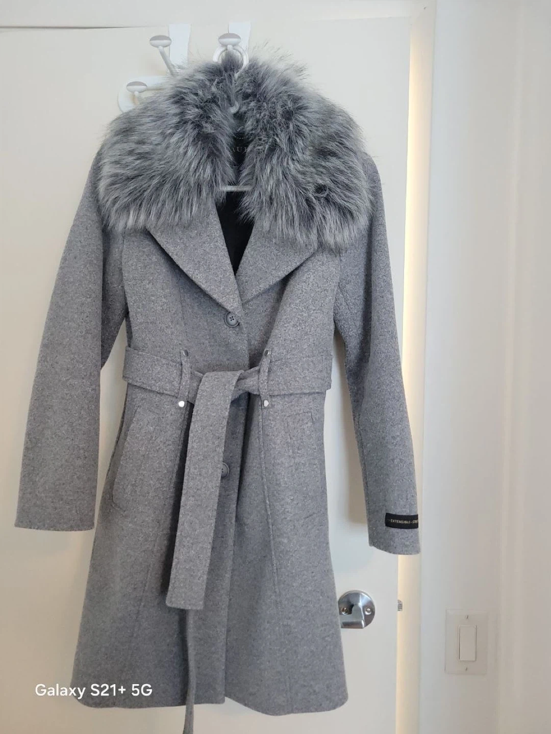 Chic grey wool blend coat from Laura. It features a removable fur collar and a tie belt for a customizable fit. Includes side pockets and button closure. Perfect for staying warm and stylish this season!