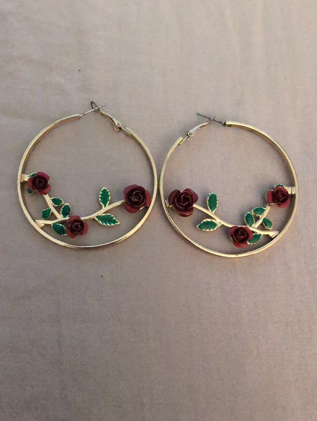 Selling a pair of gold hoop earrings with a cute rose detail! They're in great condition and would be a lovely addition to any outfit