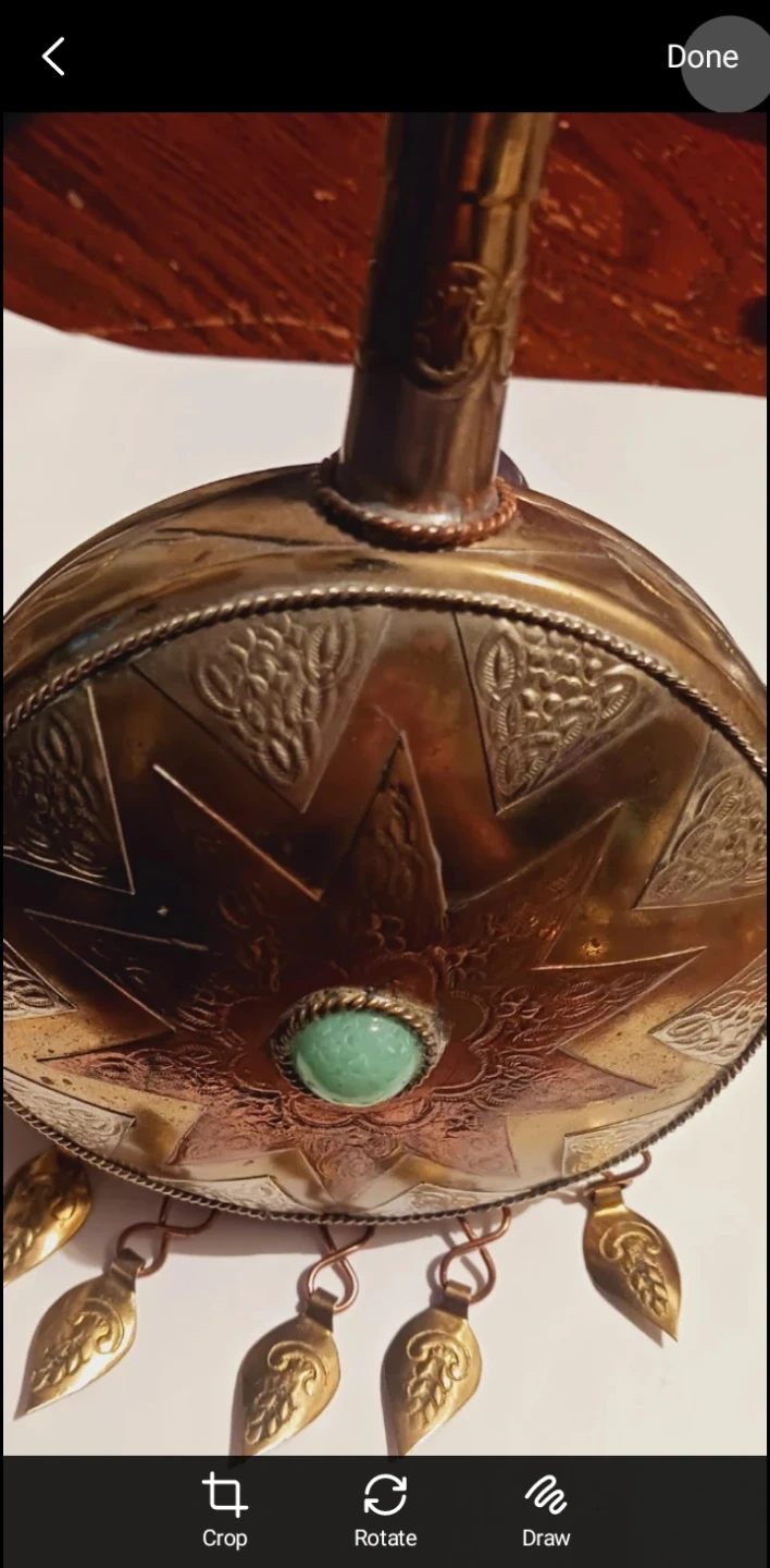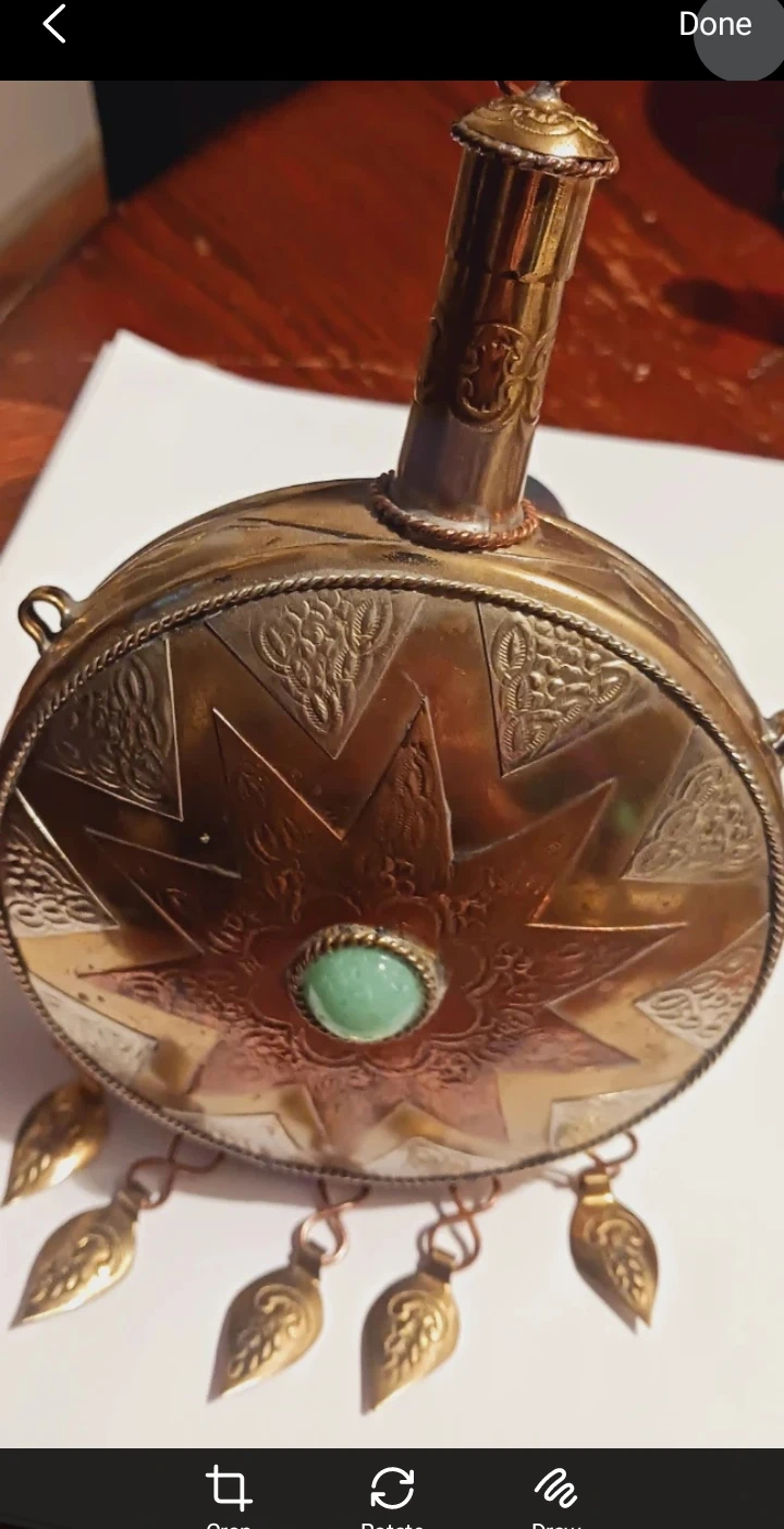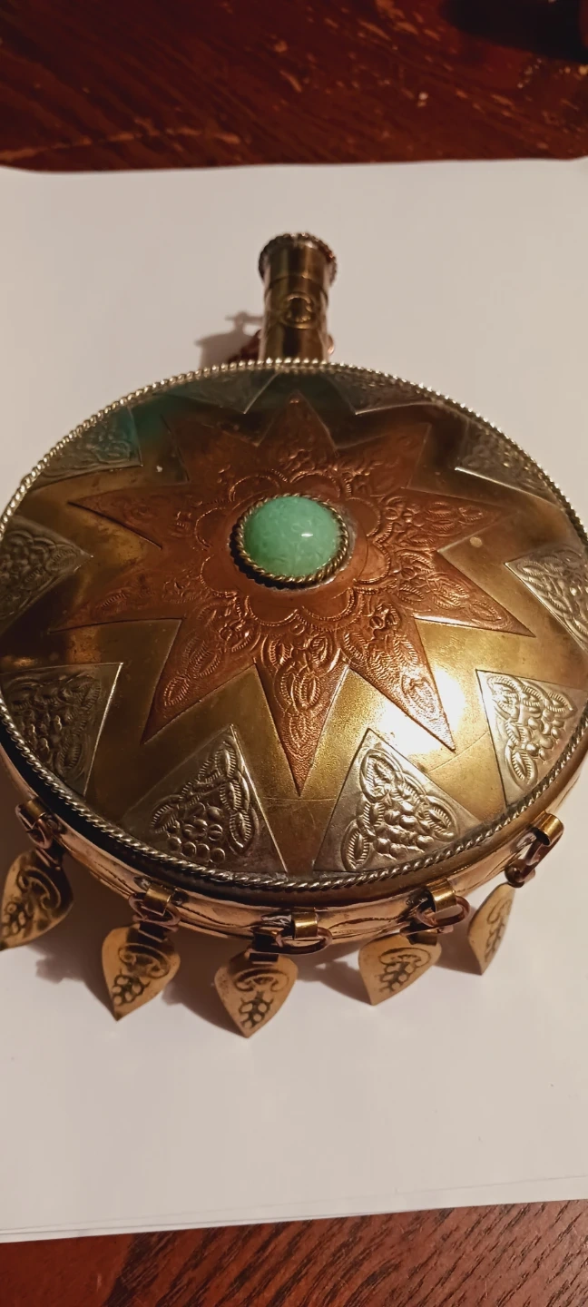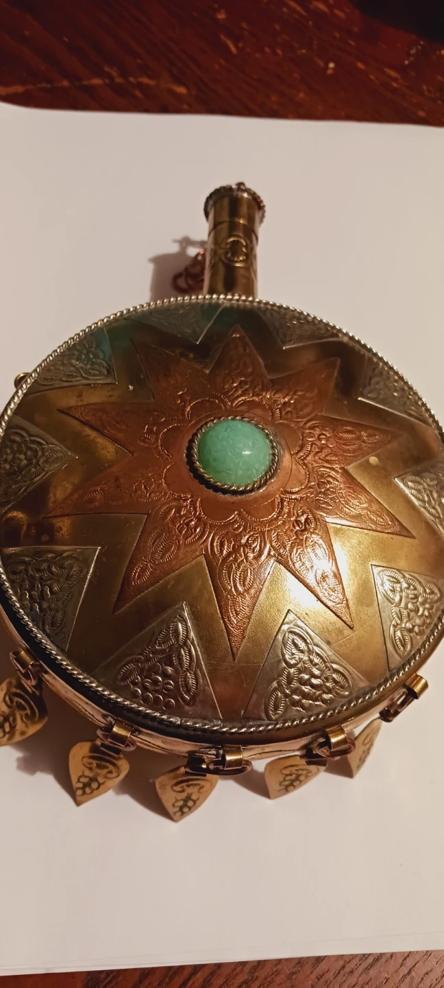 Ornate Vintage Morrocan Copper Brass Metal Flask with Gemstone Accents. This unique flask is crafted from ornate metal with intricate engravings. It features a central gemstone and decorative leaf-shaped charms along the base. Its decorative design makes it a striking piece. 7"×5". Excellent condition. ALL MY PRICES ARE NEGOTIABLE !!