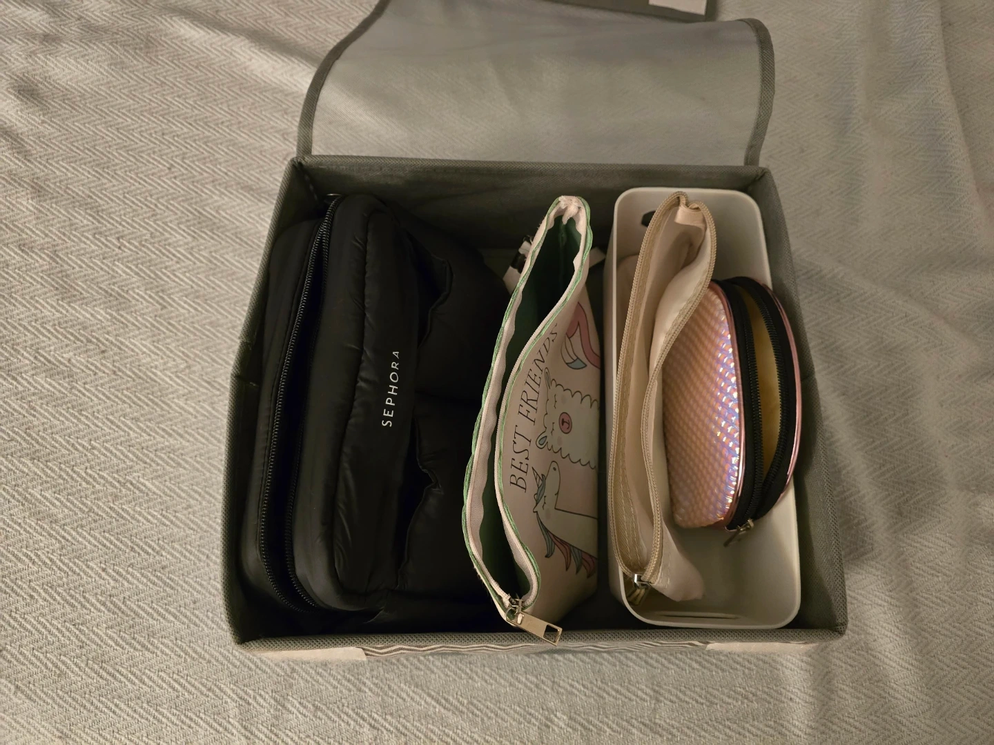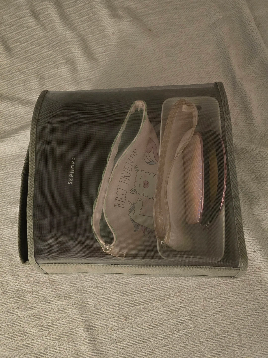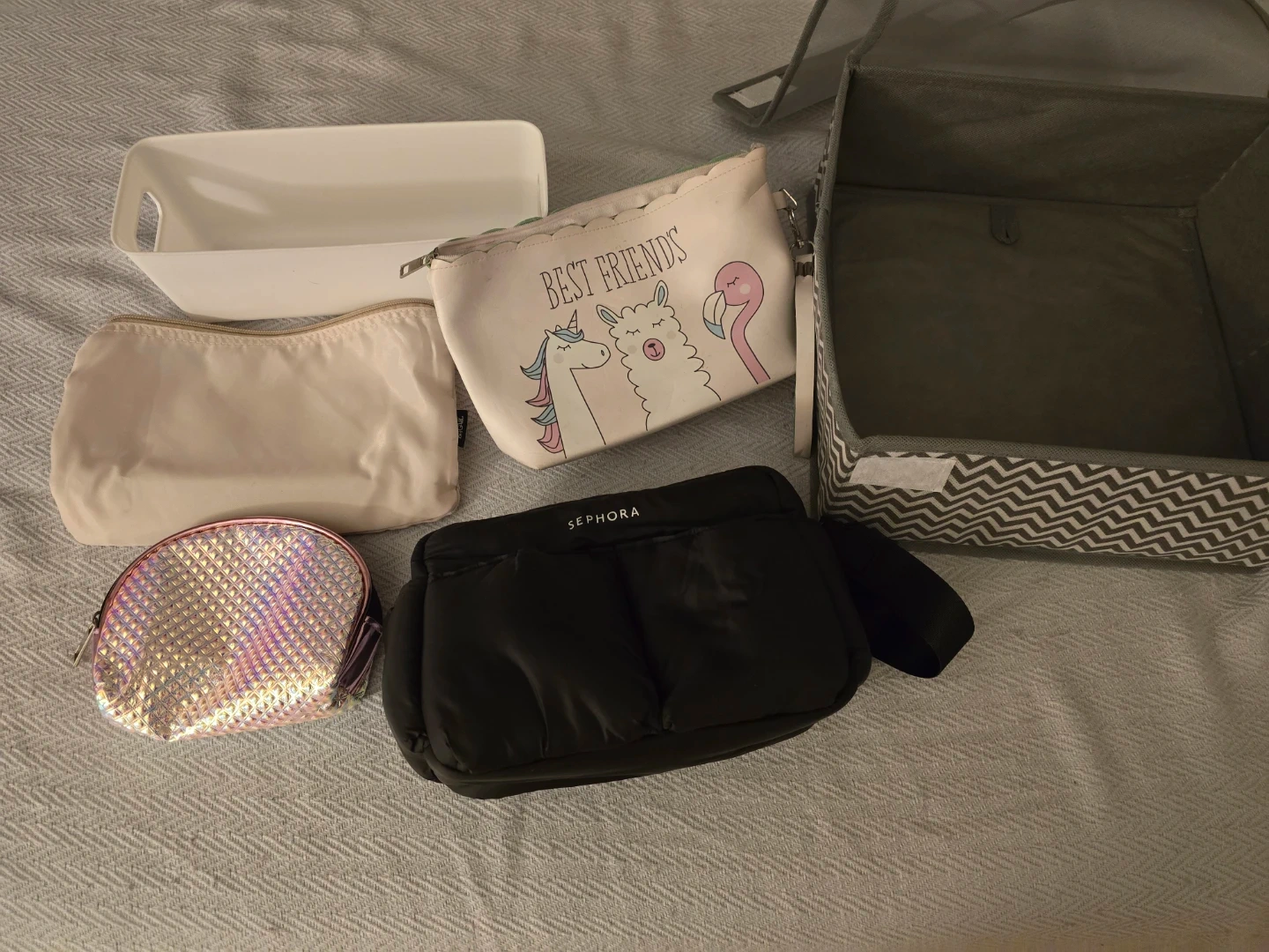 This set includes a black Sephora cosmetic bag, a pouch with llamas and flamingos, a cream-colored pouch, and a small iridescent pouch. Also includes a white organizer tray and a gray storage bin with a lid. Perfect for organizing your makeup and toiletries!