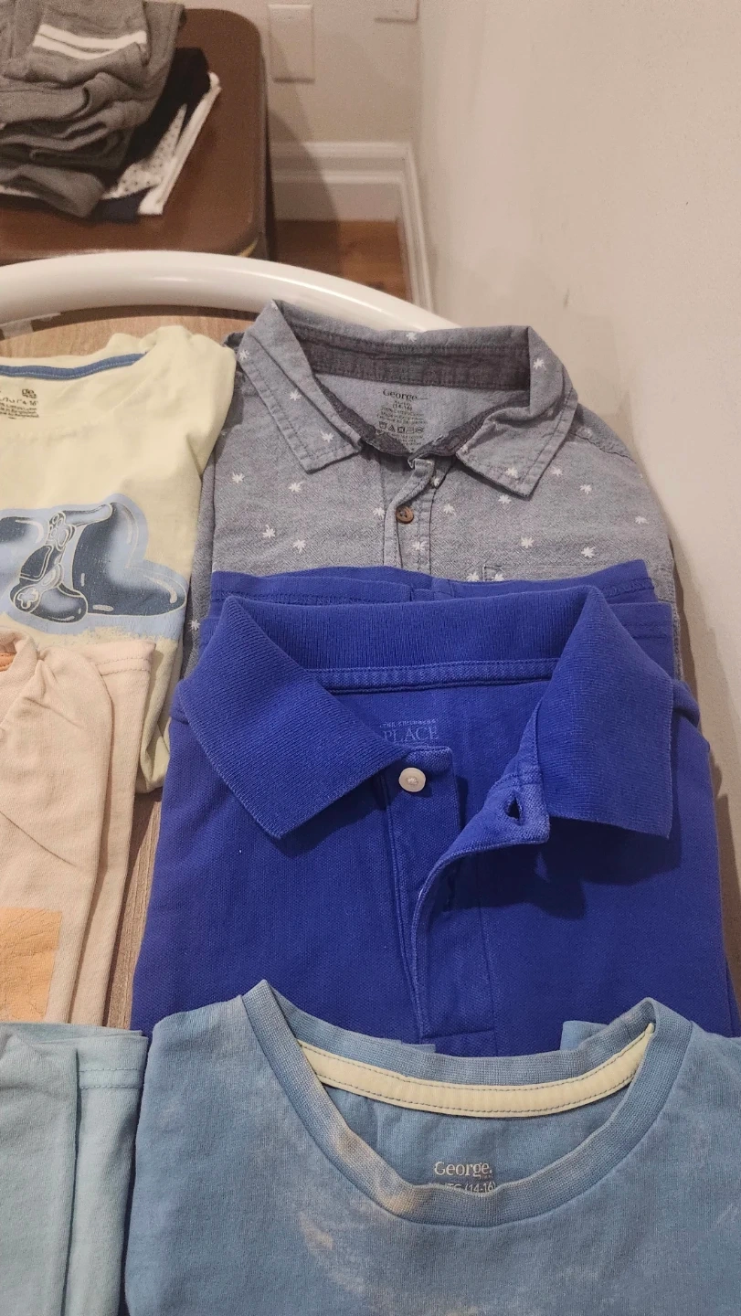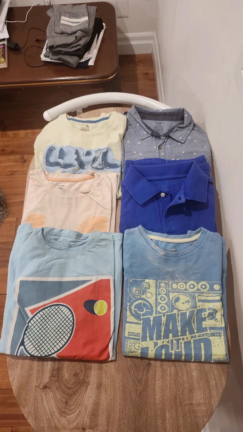 This bundle includes six boys' tops, featuring t-shirts and polos. Brands include George and The Children's Place. Sizes range from 14-16. Cotton blend materials. All 6 for onky $5. Happy tht some kid will enjoy wearing this very lightly used clothes.