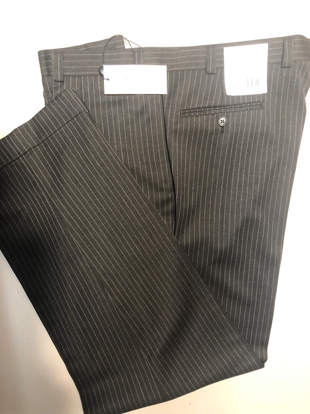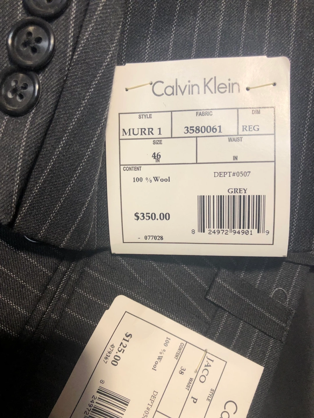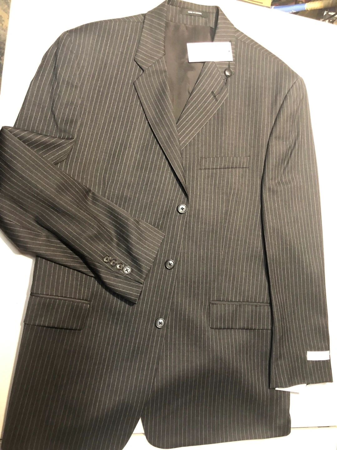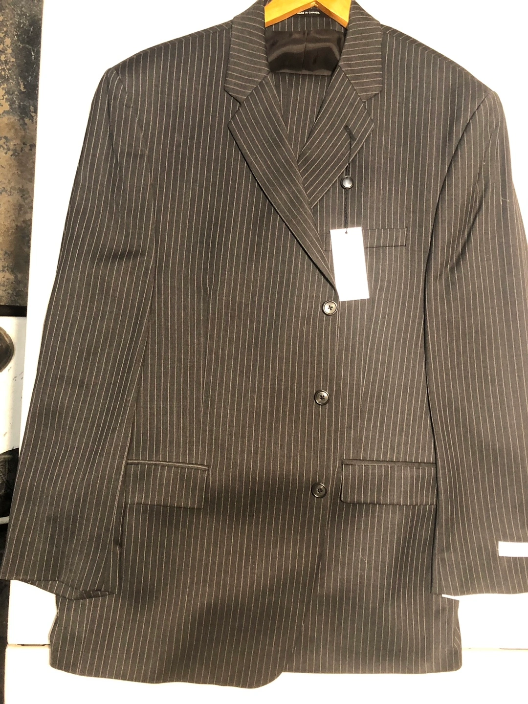 New Gray pinstripe suit jacket 100% Wool , Three button closure. Two flap pockets and one chest pocket.also the Matching Pants , Absolutely Beautiful, Jacket is 46 , Style Murr1 , Pants are 38 W X 32 long