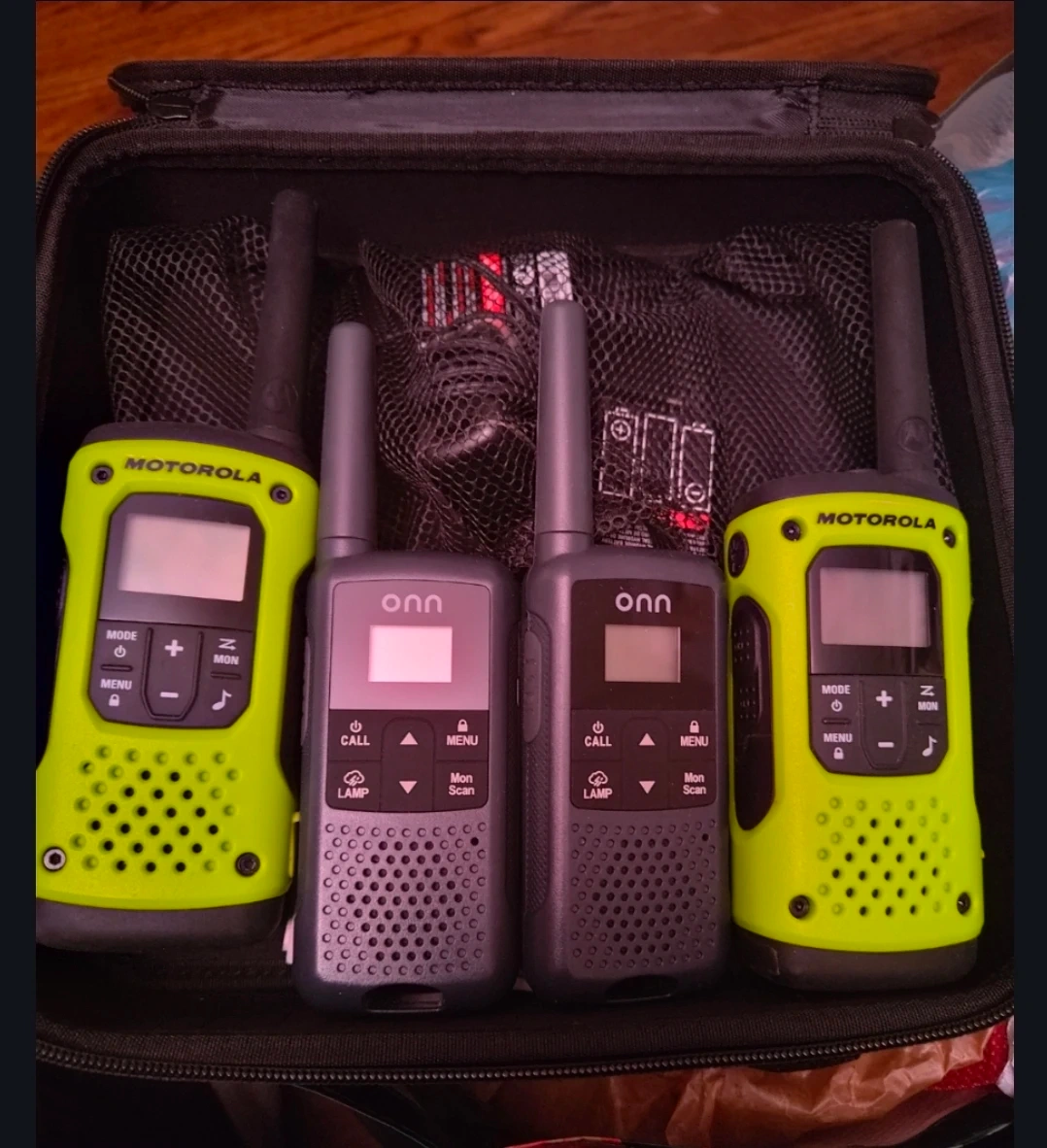 Set includes two neon yellow Motorola walkie talkies and two gray Onn walkie talkies. All come in a black zippered carrying case. They look ready for adventure!