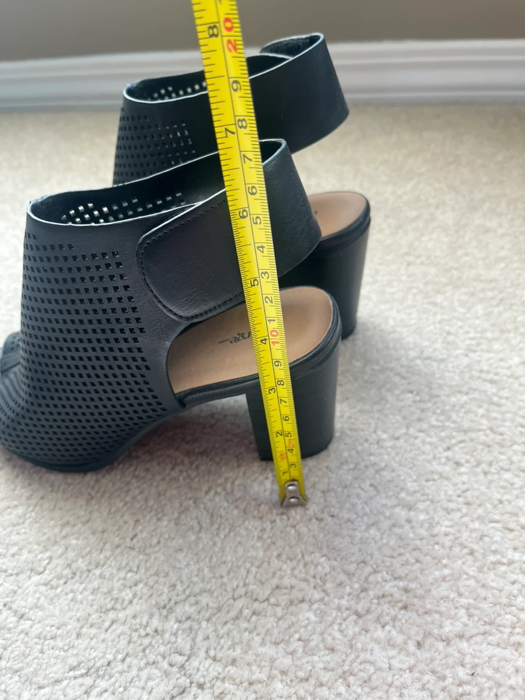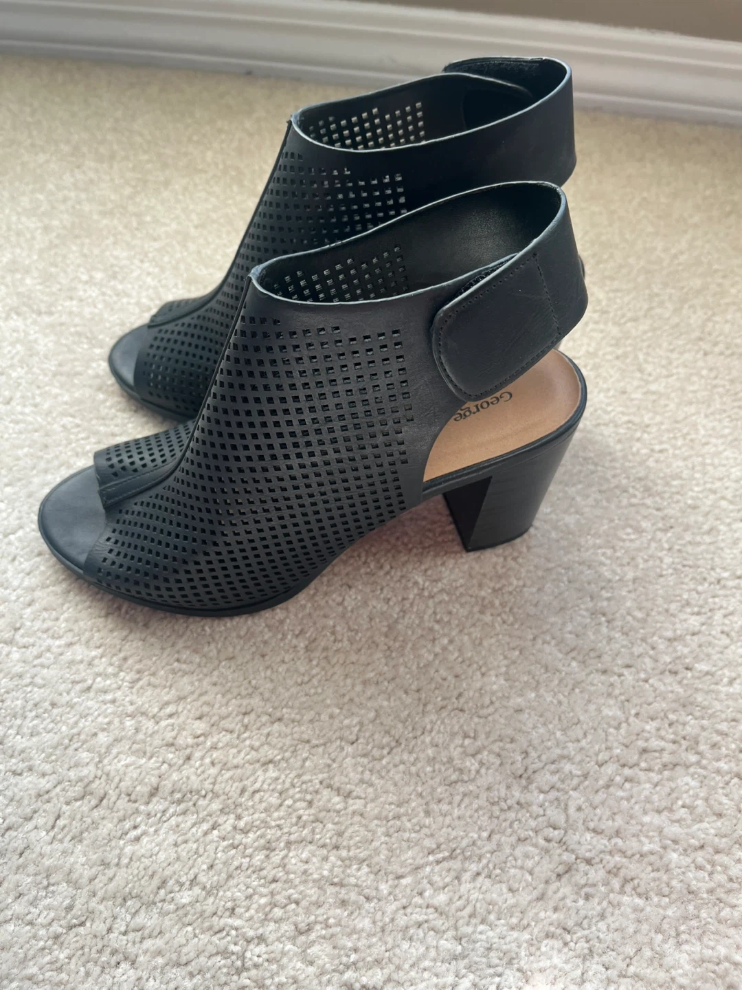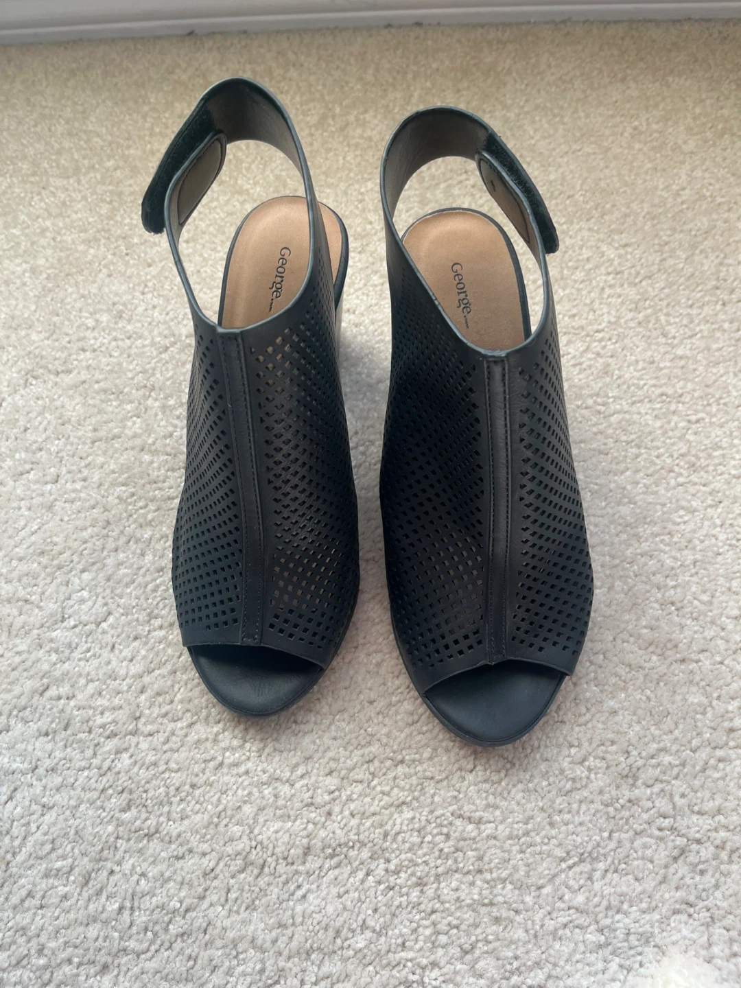 These George sandals feature a stylish black perforated design with a comfortable block heel. They have an adjustable strap for a secure fit. Heel height appears to be around 3 inches.