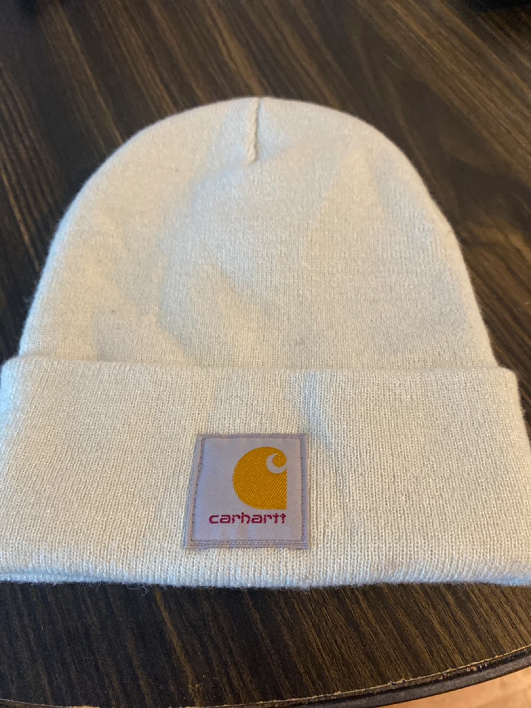 Cream colored Carhartt beanie hat. It's made from a soft, knit material. This hat is perfect for keeping warm on cold days!