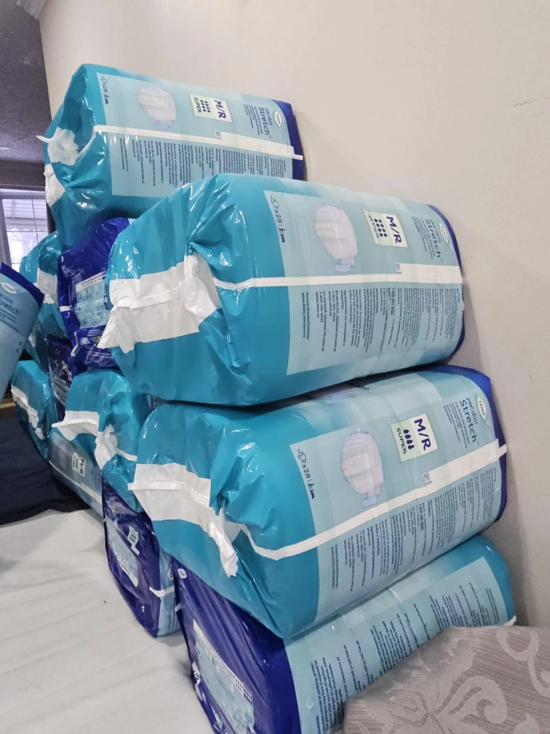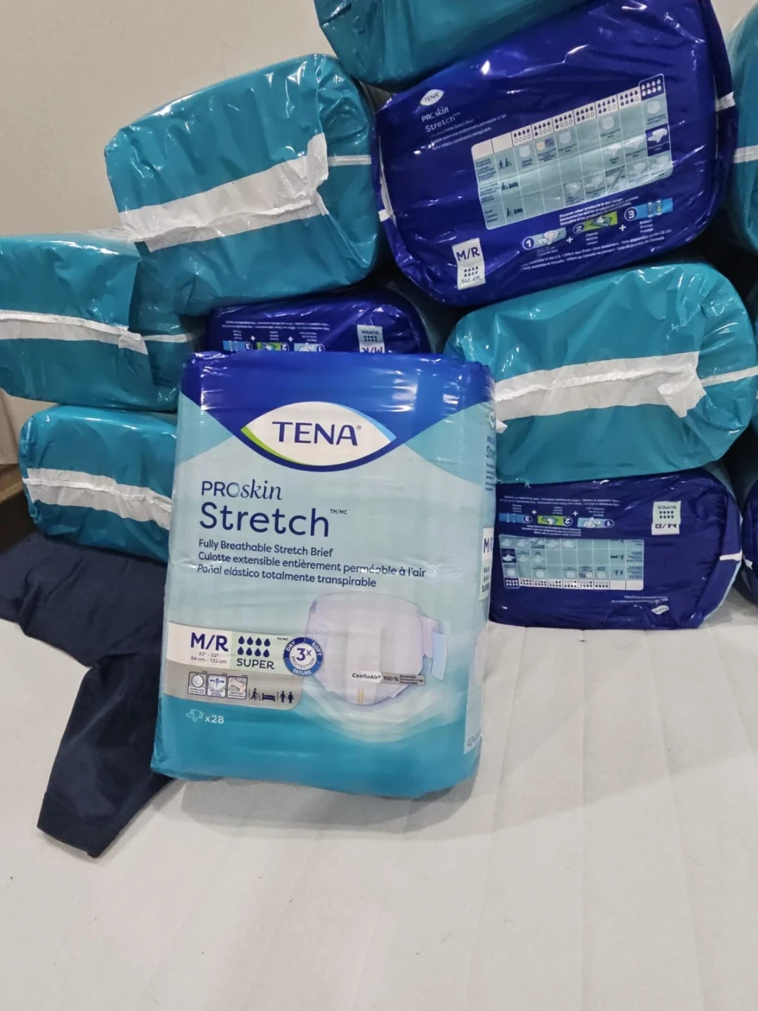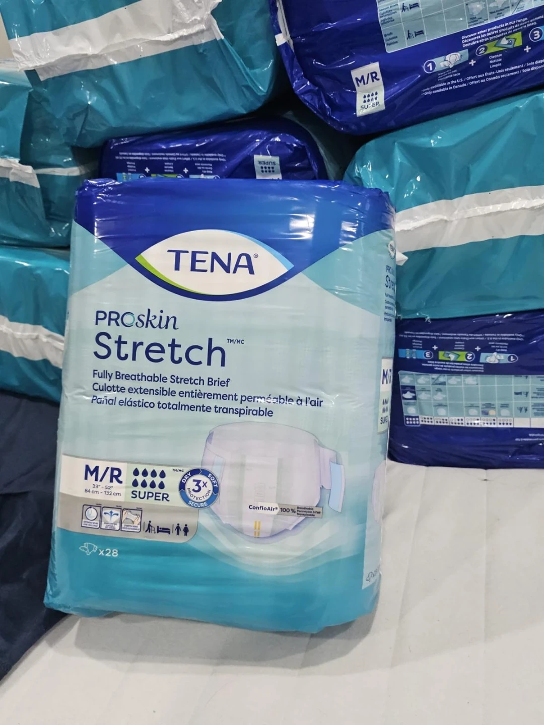 This package contains 28 TENA ProSkin Stretch Super Incontinence Briefs in size Medium/Regular. They're fully breathable stretch briefs designed for comfort and protection. The waist size is 33"-53" (84-135 cm).