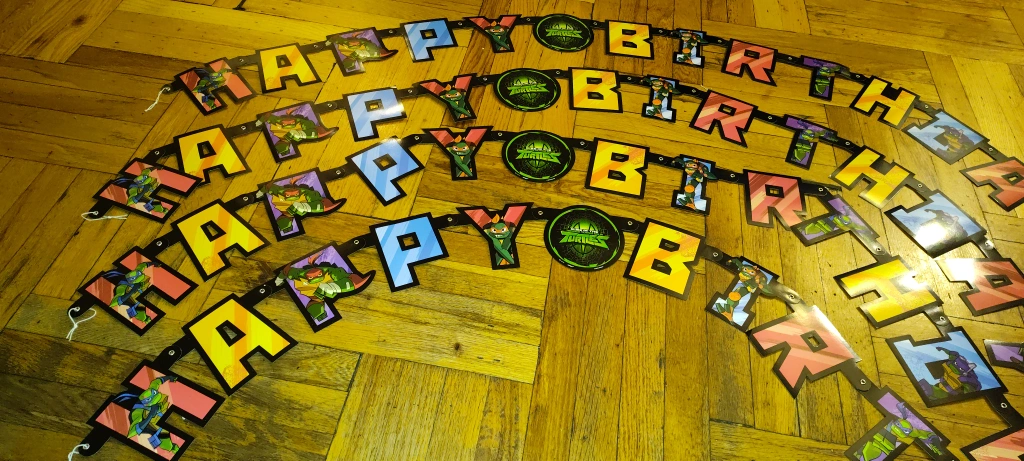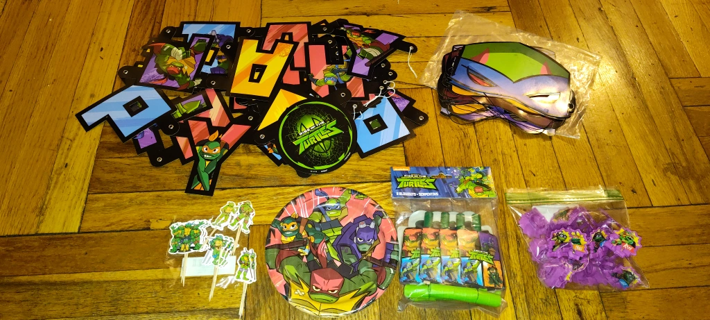 Unused Teenage Mutant Ninja Turtles party supplies. Includes 4 banners, 8 ct plates, 20 ring souvenirs, 18 cupcake toppers, and 6 masks. Perfect for a TMNT themed party!