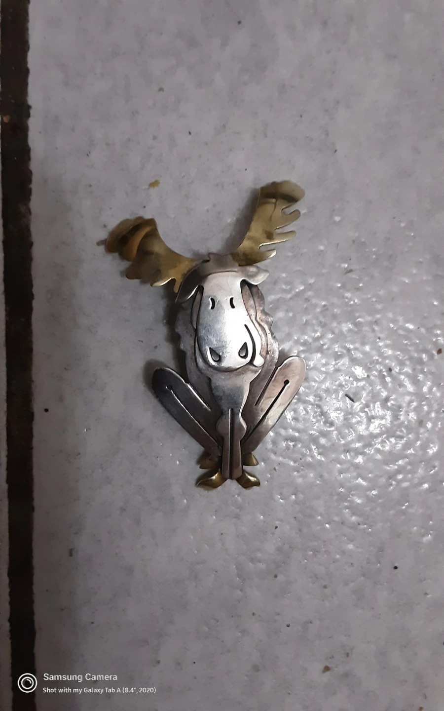This is a vintage moose brooch. It's made of Brass and sterling Silver with gold-tone accents on the antlers and hooves. The clasp is secure and in good working order.