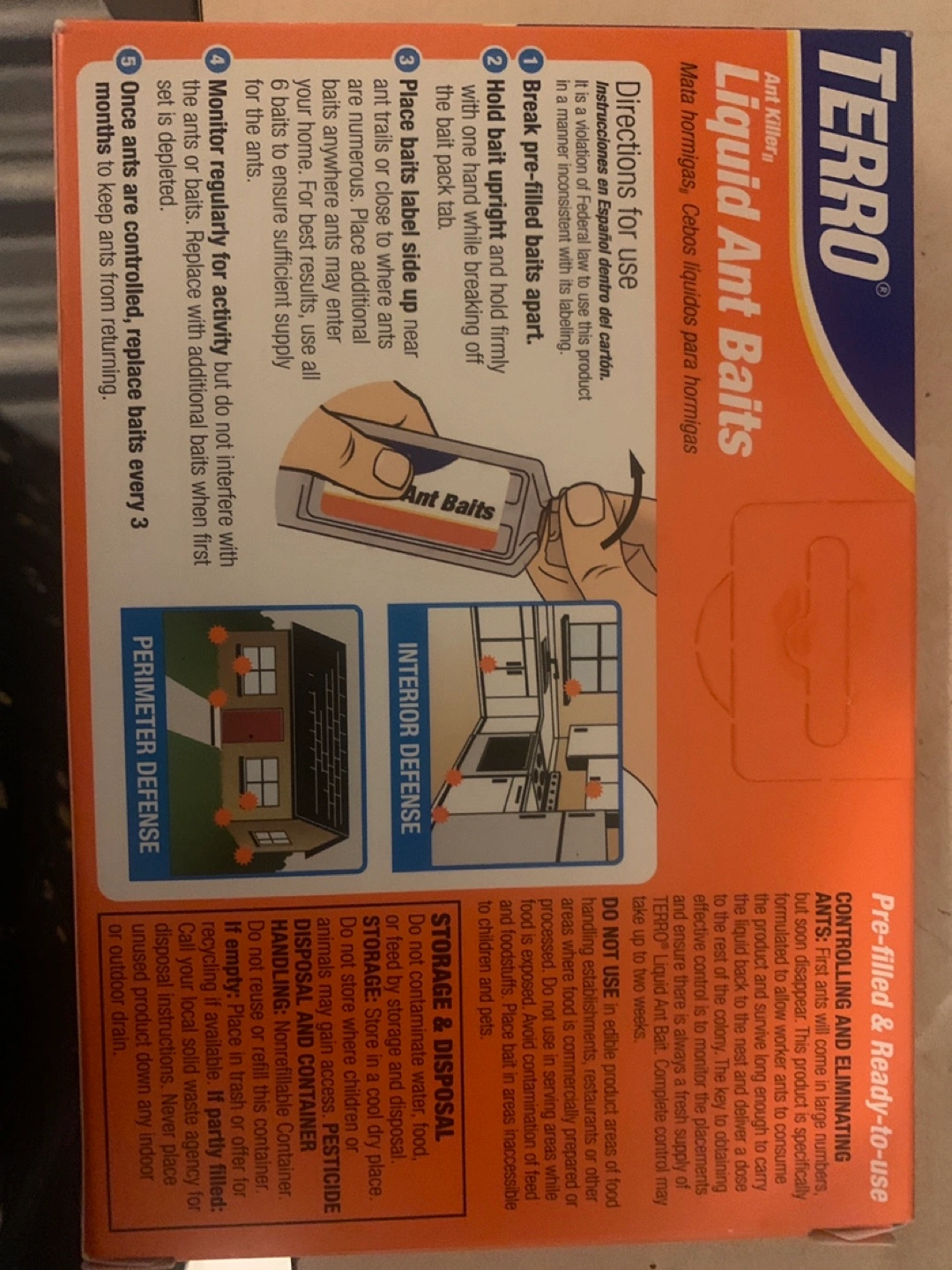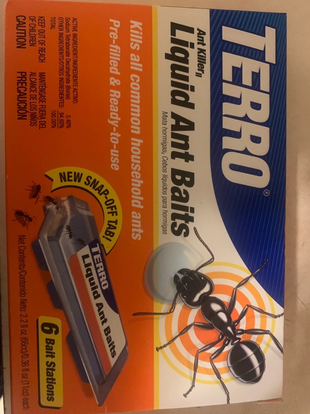 Selling a box of TERRO Liquid Ant Baits, comes with 6 bait stations to help you get rid of those pesky ants! The box says it's pre-filled and ready-to-use, so it should be super convenient. Just place the baits near ant trails or where you see ants, and let them do their thing! Once the ants are gone, you can replace the baits every 3 months to keep them from coming back