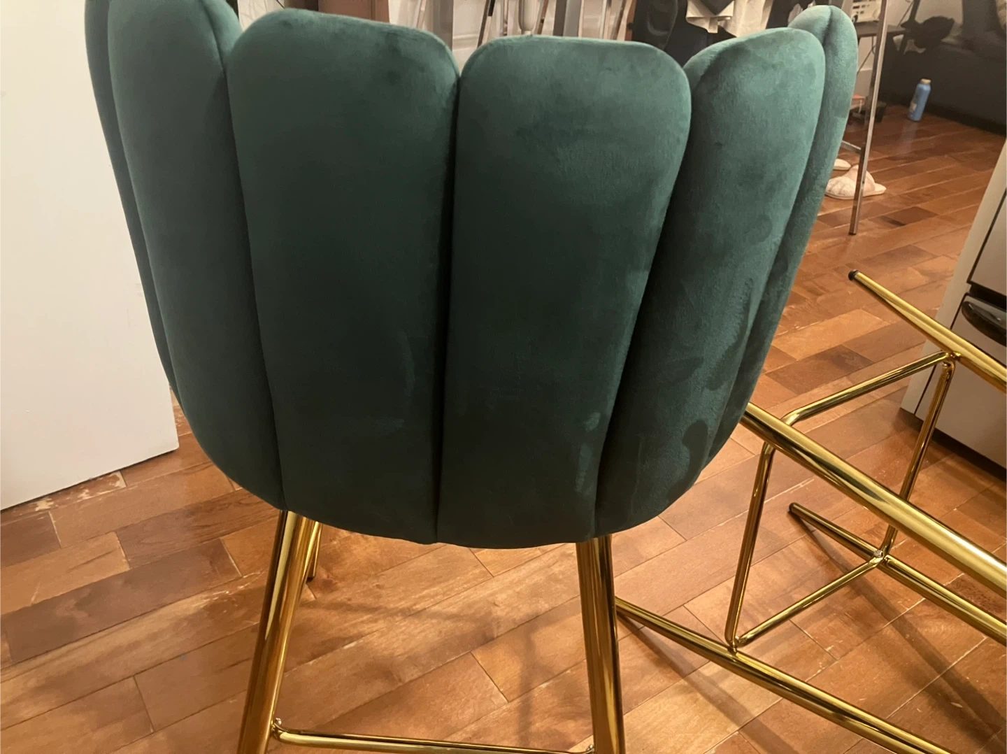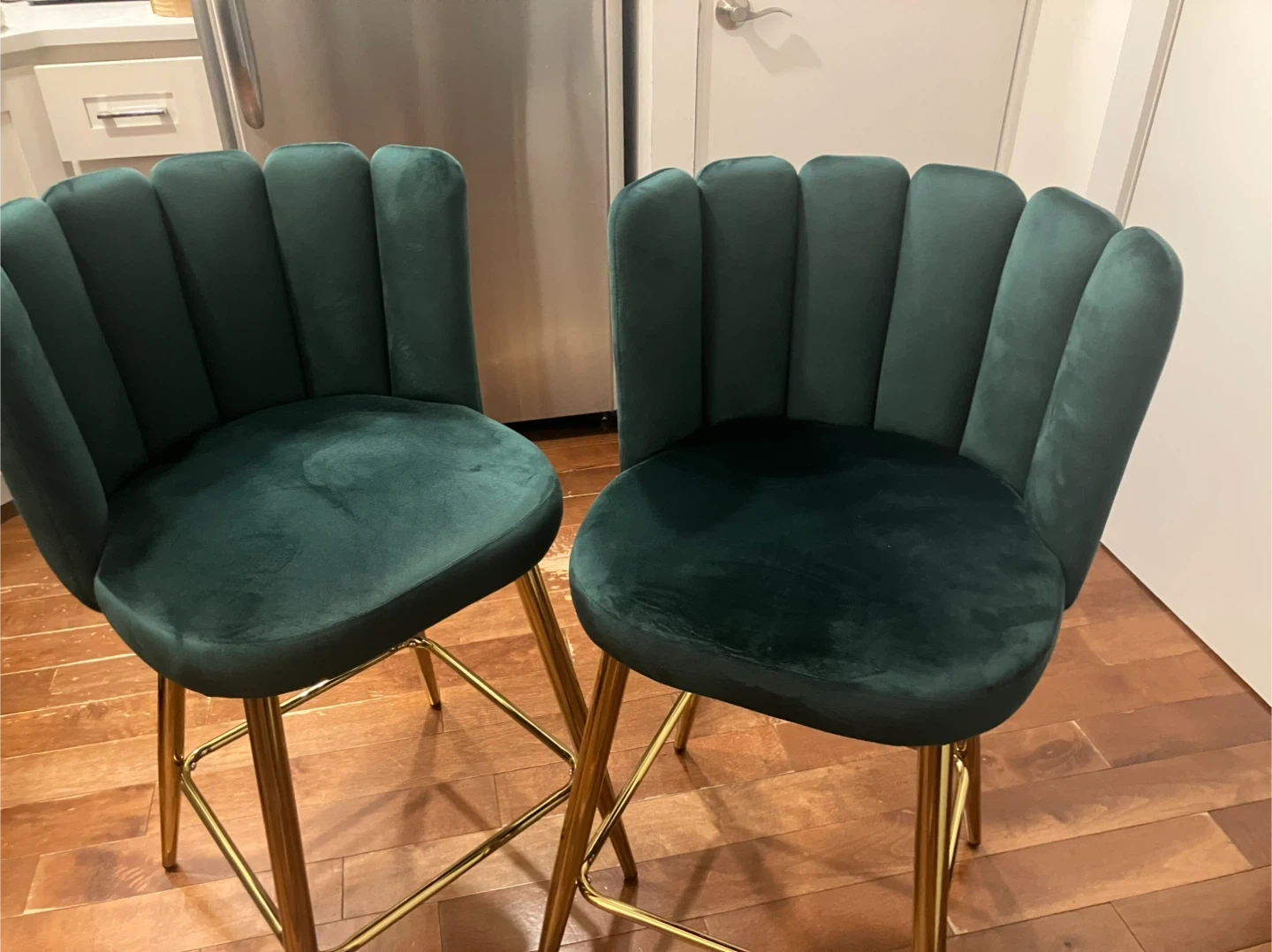 Chic emerald green velvet bar stools. Feature plush seating and elegant gold metal legs. These chairs add a stylish touch to any kitchen or bar area!