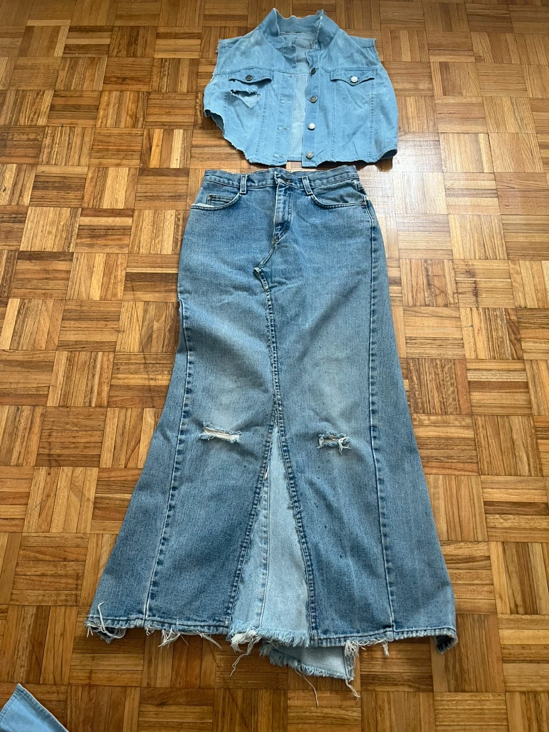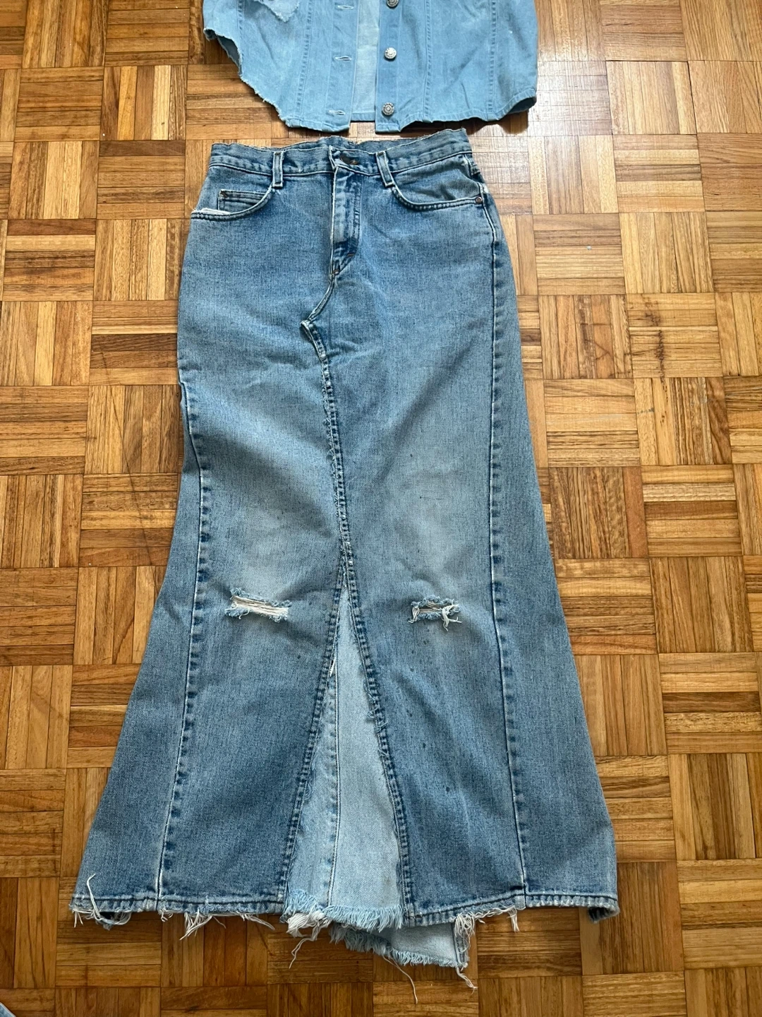 unique two-piece denim set featuring a maxi skirt with a raw hem and front slit, paired with a sleeveless vest. Both pieces show distressing for a vintage look. Perfect for a casual, stylish outfit!