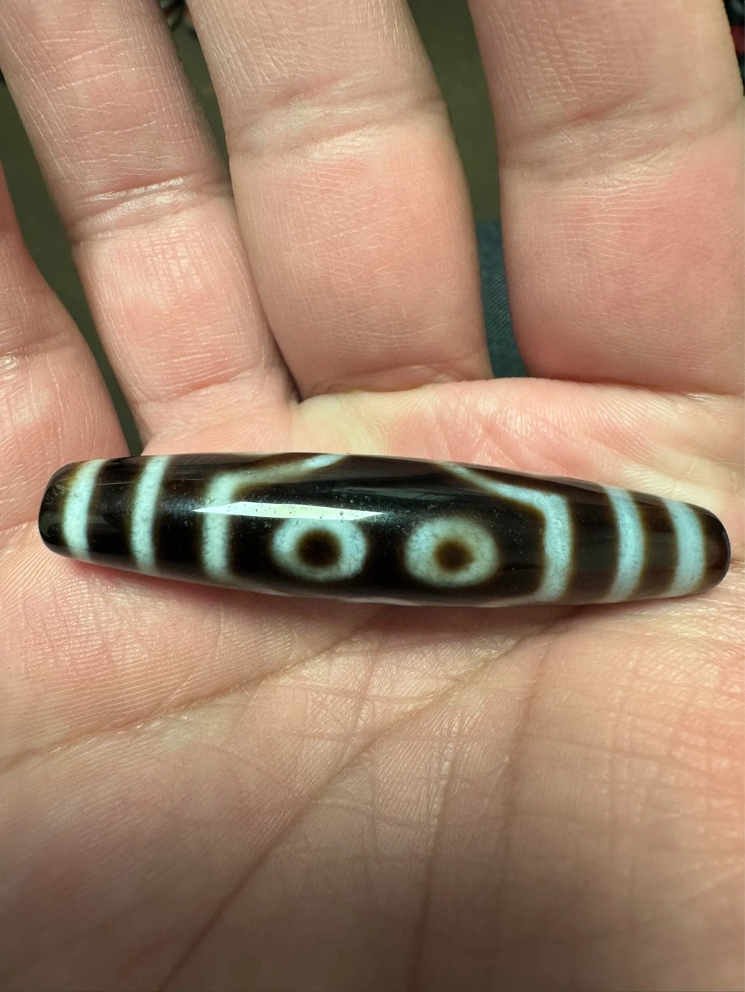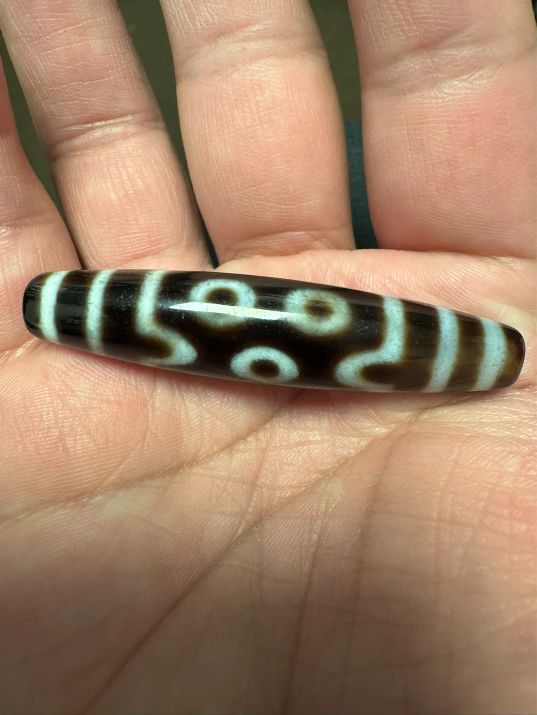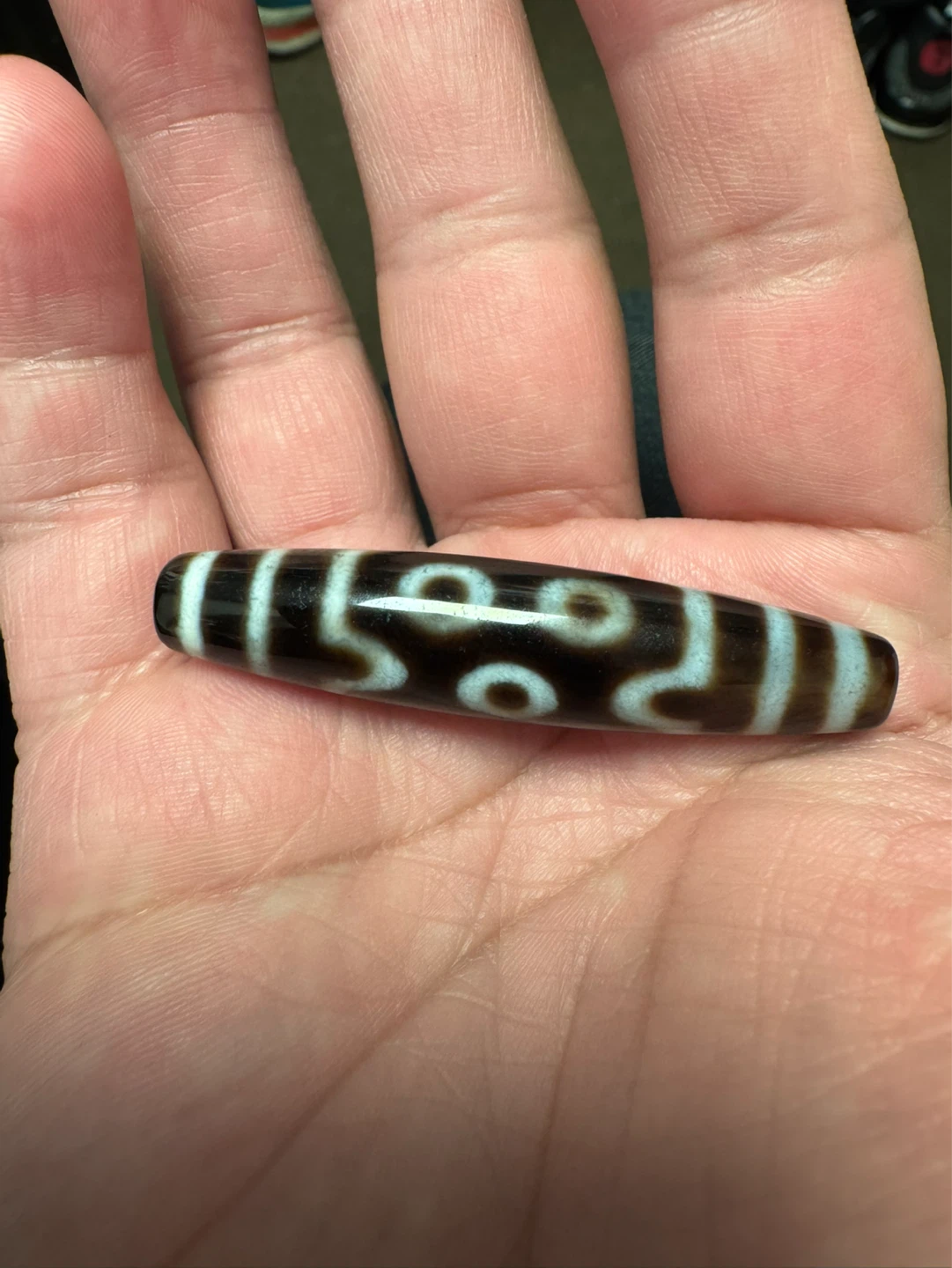 Selling a beautiful Dzi bead with traditional white etched patterns on a dark agate stone. This long cylindrical bead features classic “eye” and line motifs, often associated with protection, luck, and positive energy.