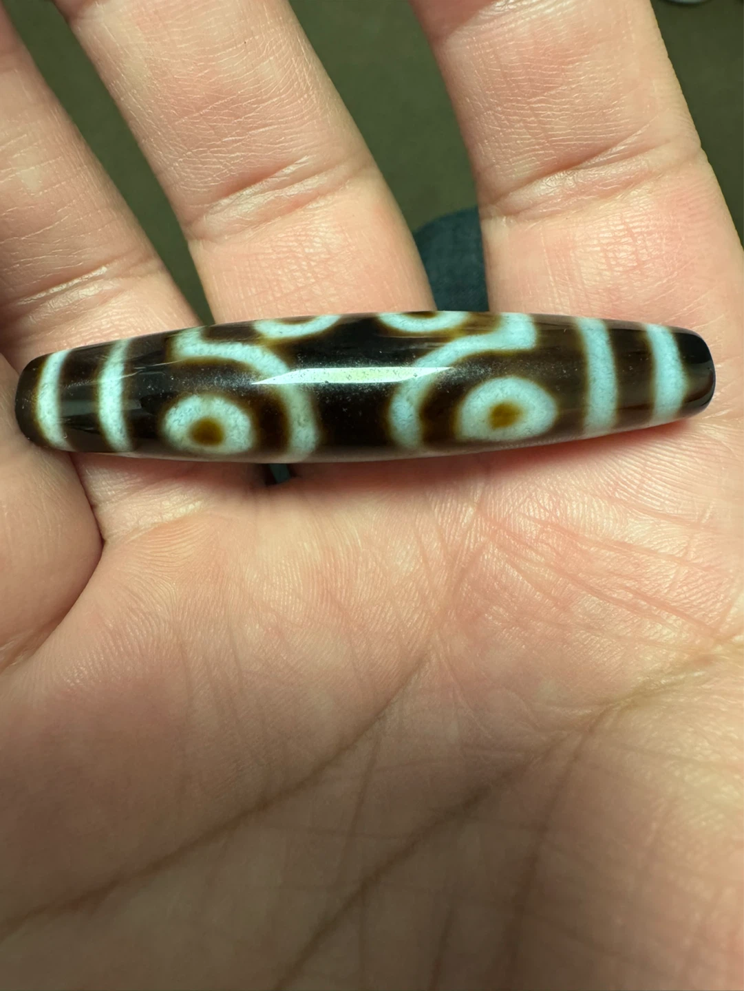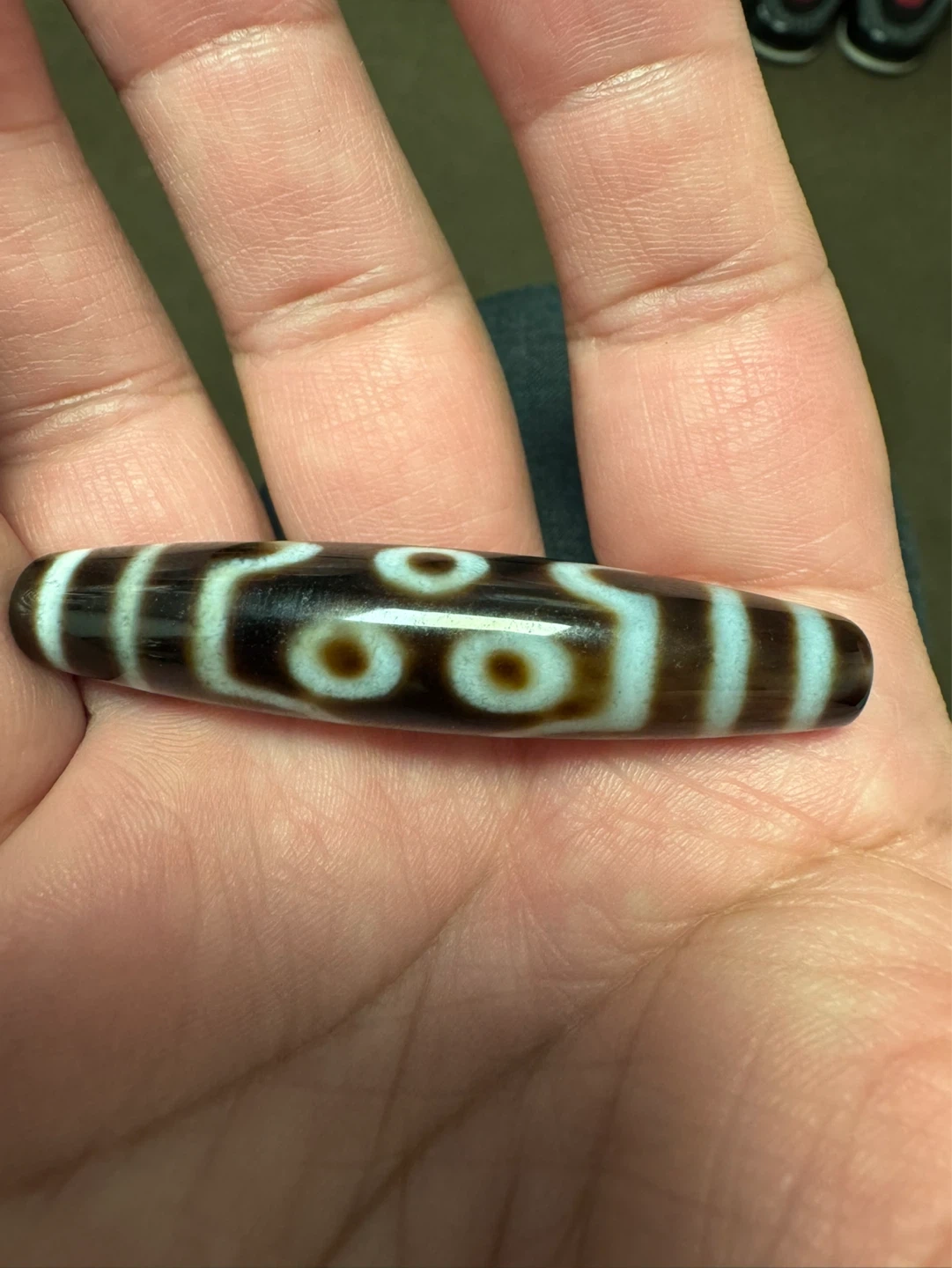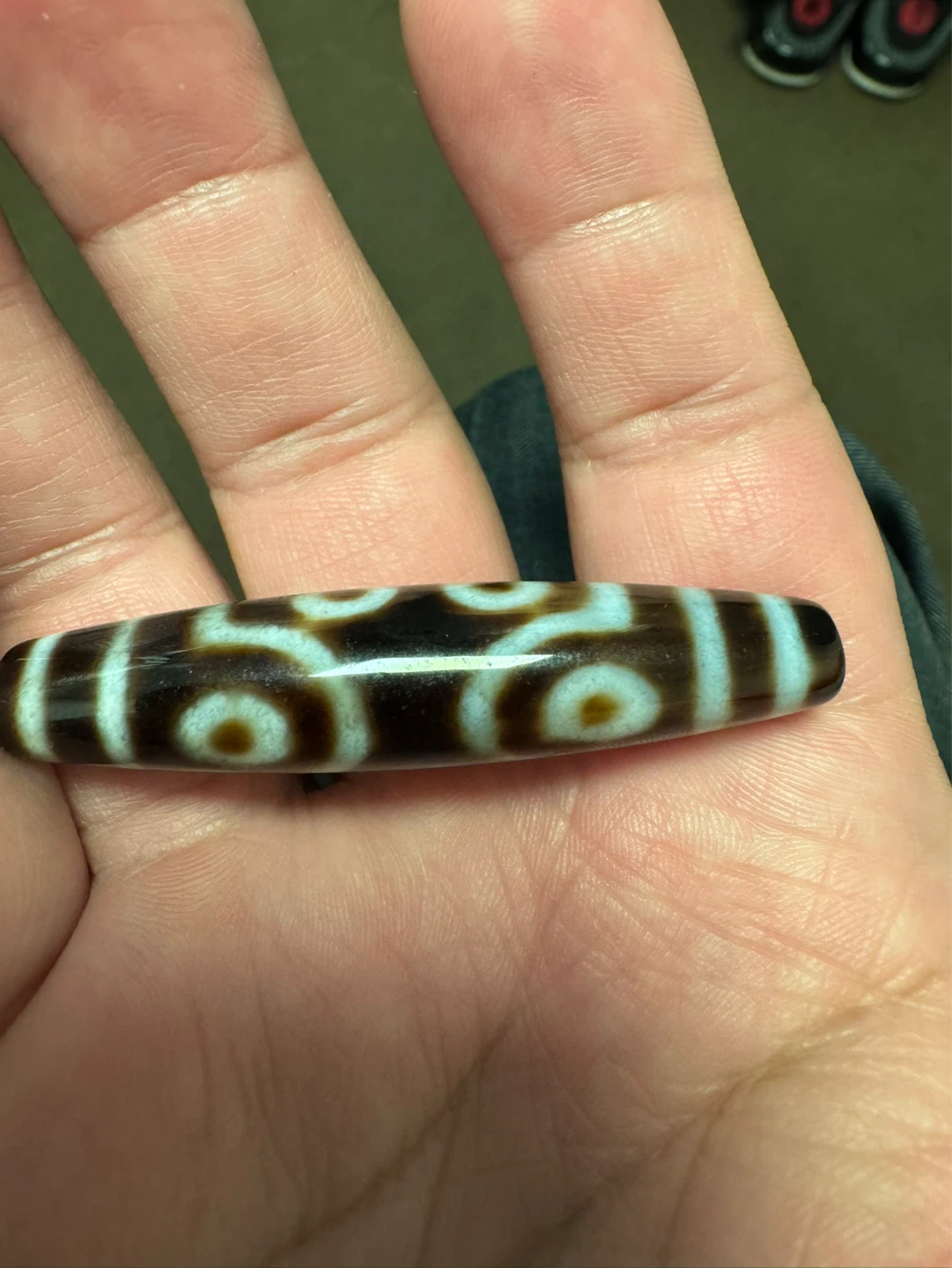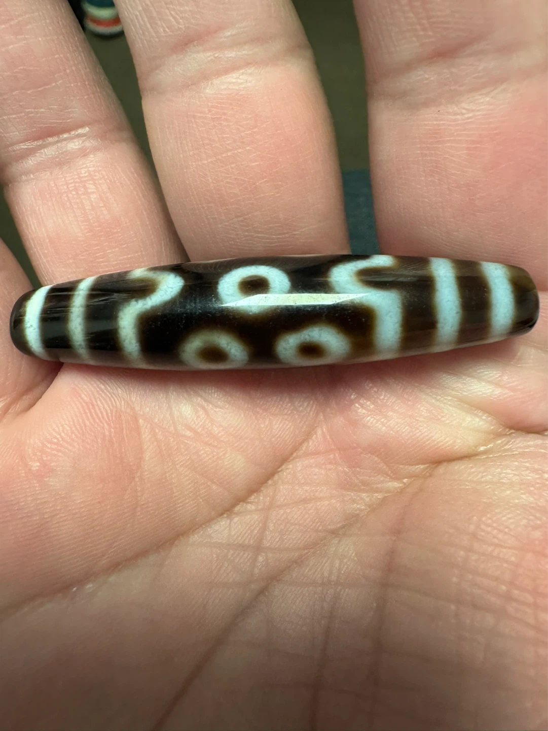 Selling a beautiful Dzi bead with traditional white etched patterns on a dark agate stone. This long cylindrical bead features classic “eye” and line motifs, often associated with protection, luck, and positive energy.
