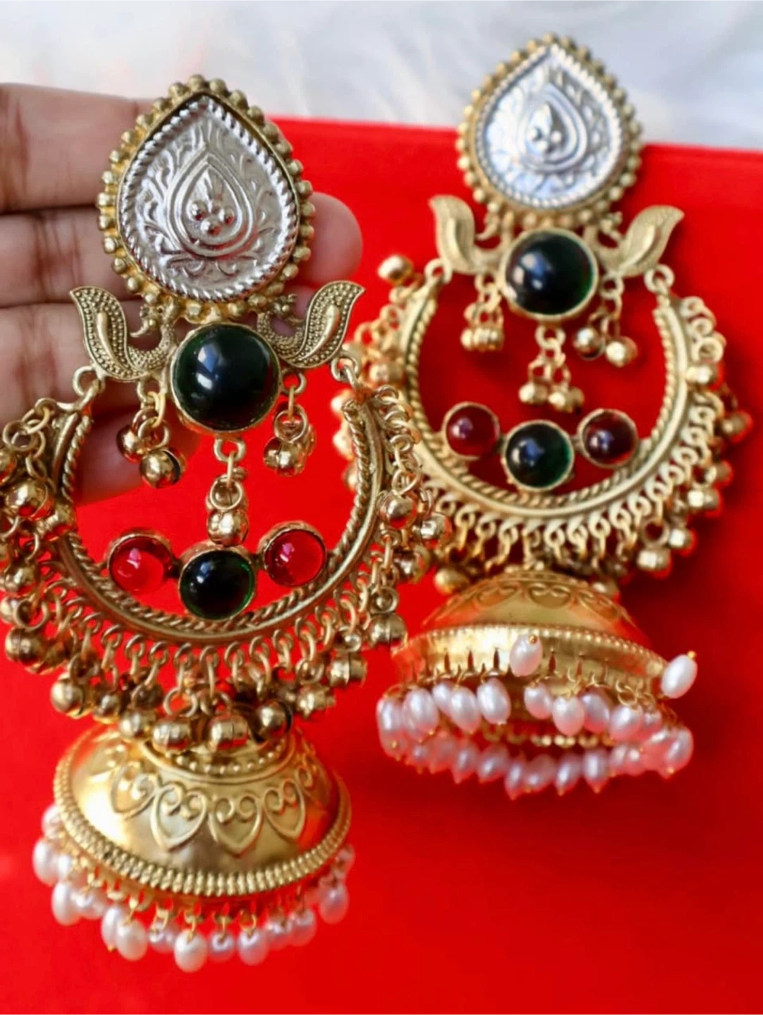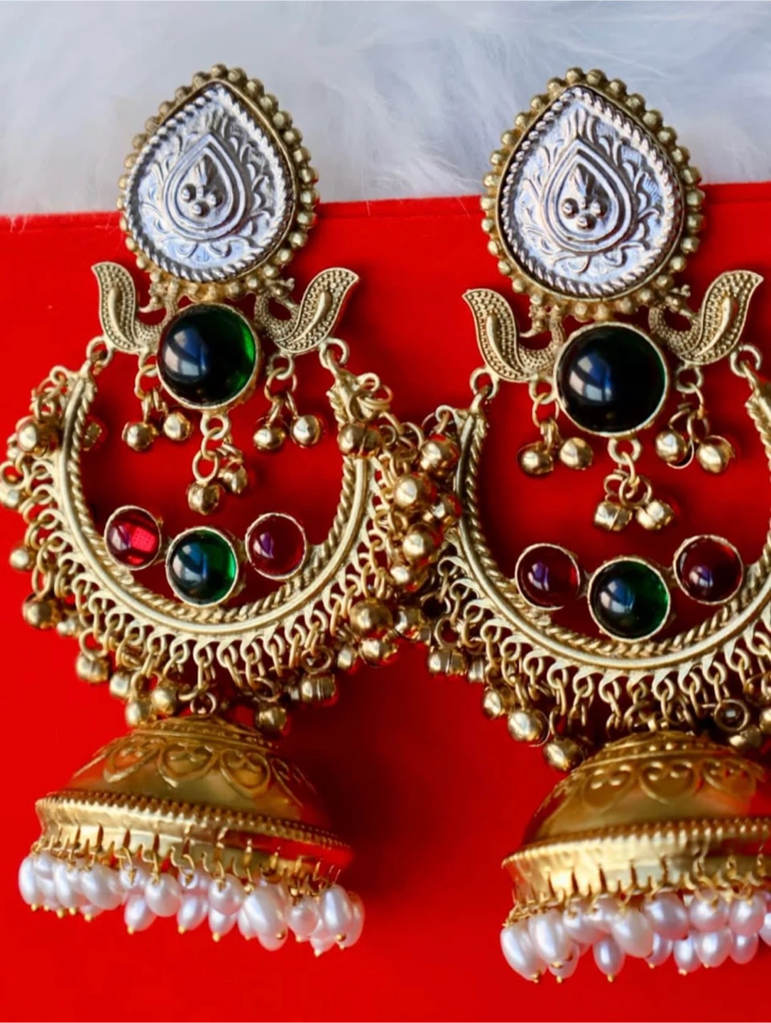 Kashmiri jhumkis. These jhumka earrings feature a gold-tone finish with intricate detailing. They're adorned with colorful gemstones in green and red, along with pearl accents at the bottom. The design includes ornate dangling elements and a traditional jhumka bell shape.