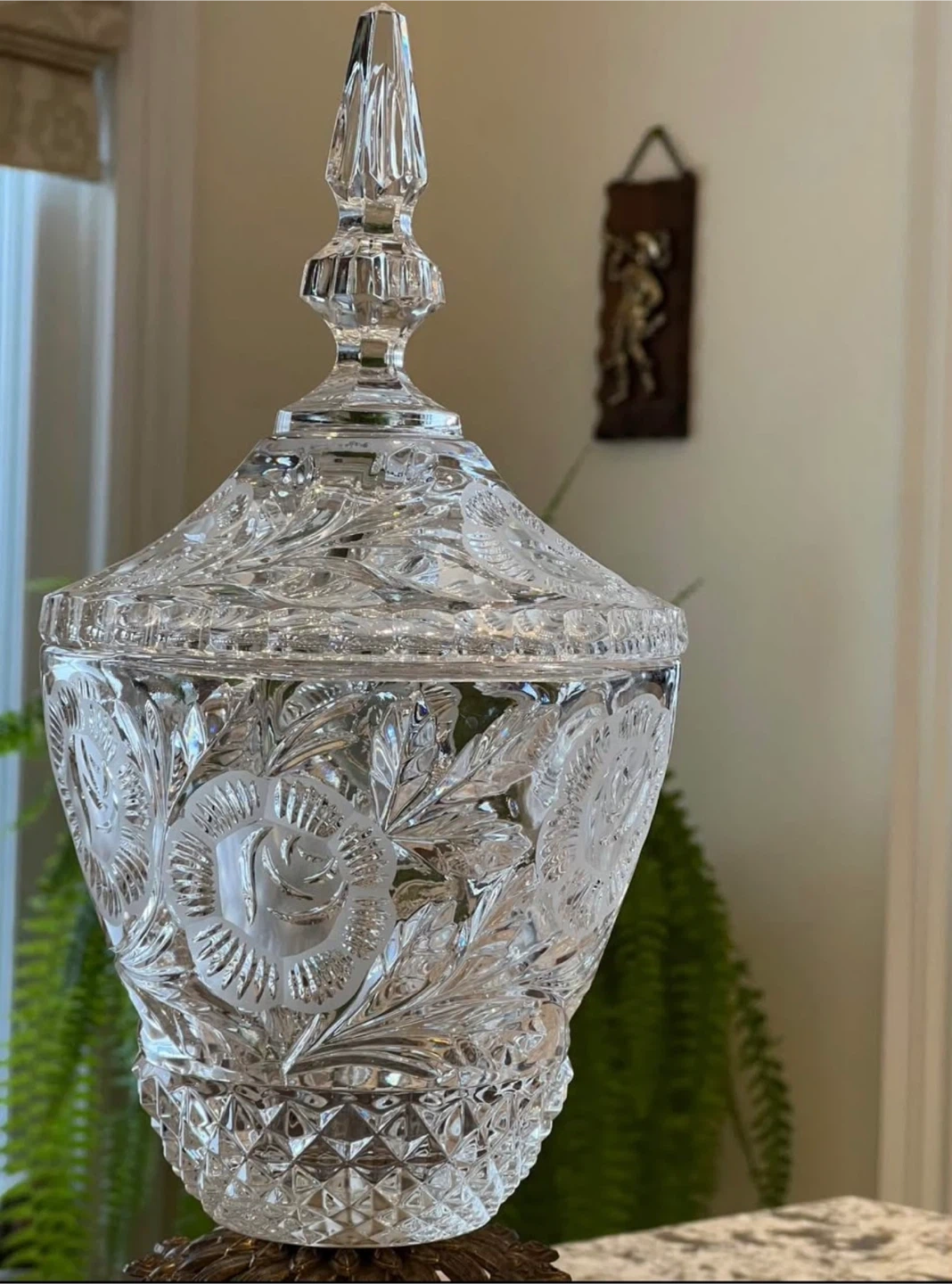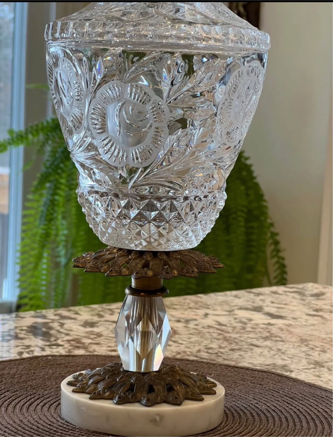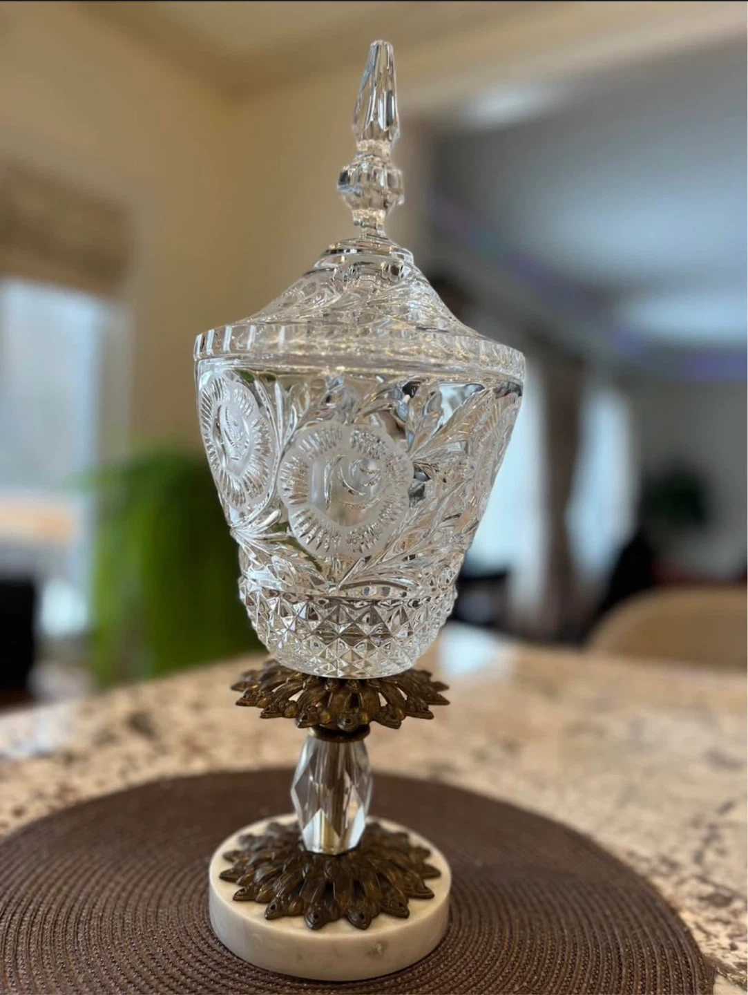 A beautiful crystal glass candy dish with a detailed floral pattern. It has a glass lid and rests on an ornate metal base with a marble bottom. Perfect for serving treats or as a decorative piece on your table!