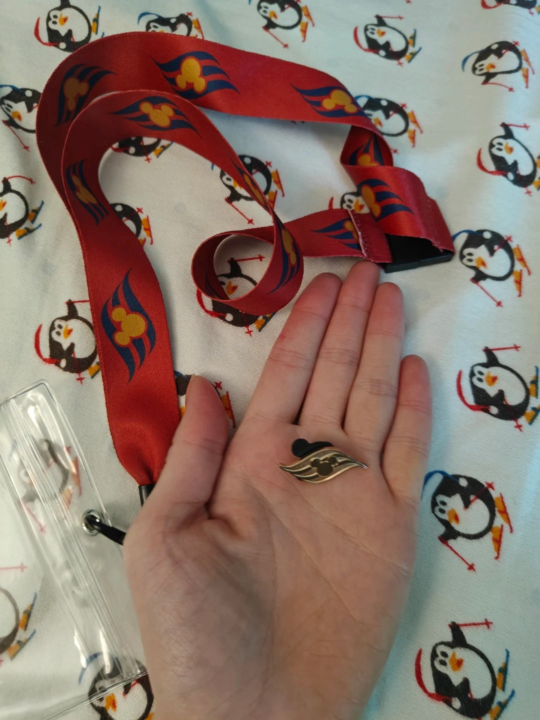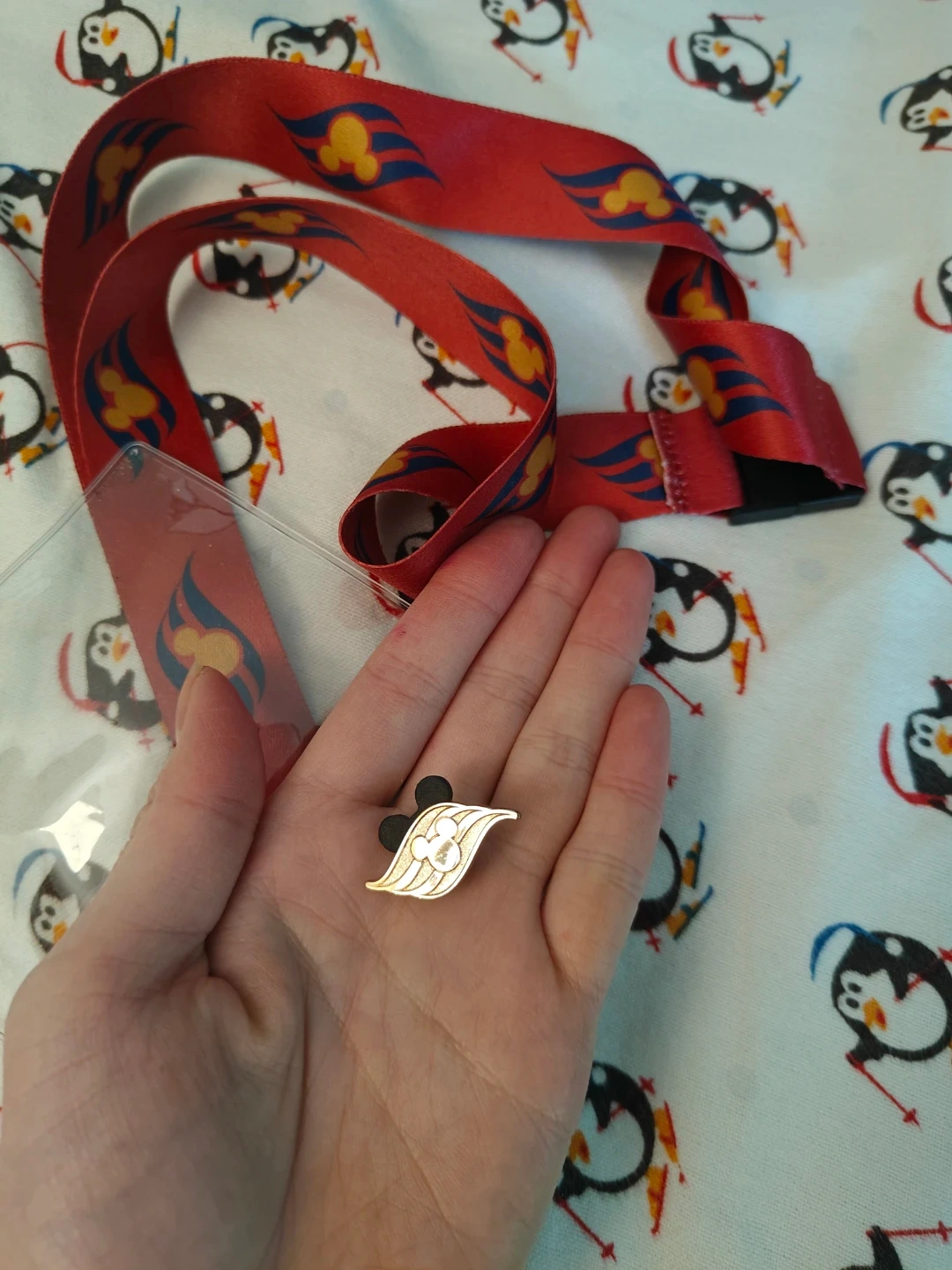This is a Disney Cruise Line lanyard and pin set. The lanyard features the Disney Cruise Line logo and colours. The pin is a gold-toned metallic design with Mickey Mouse ears. It's perfect for holding your Key to the World card on your cruise!