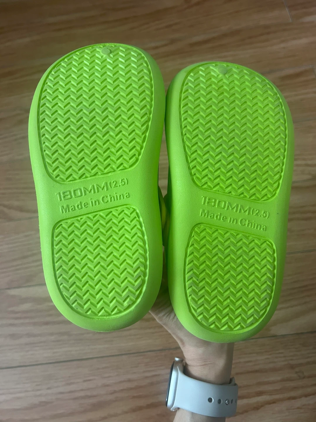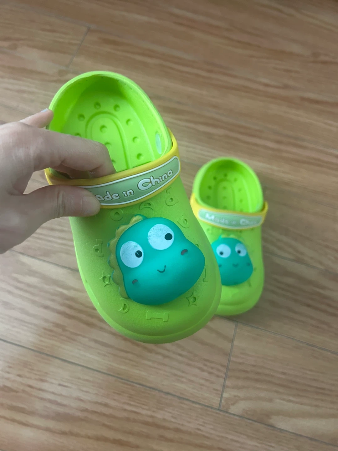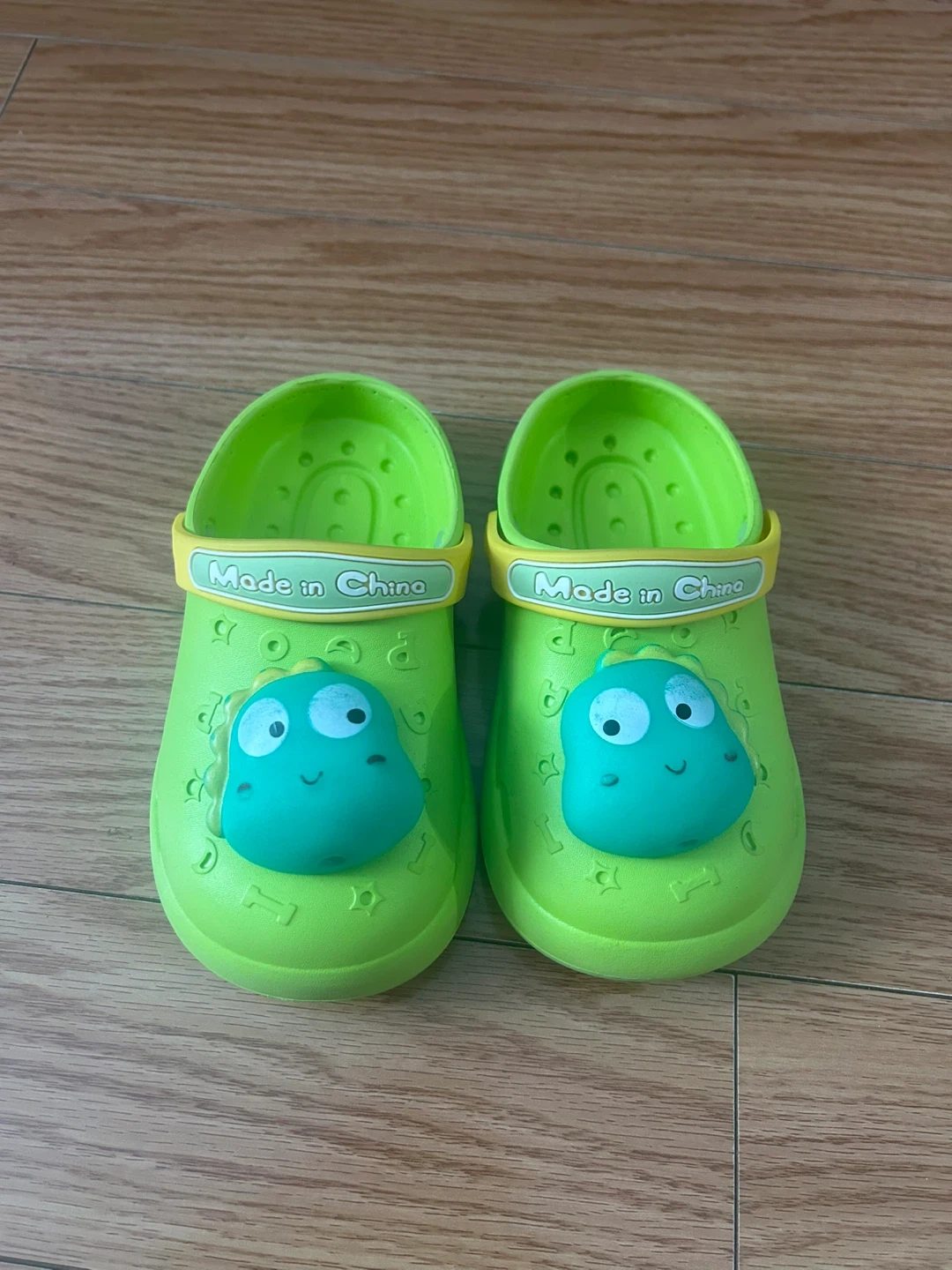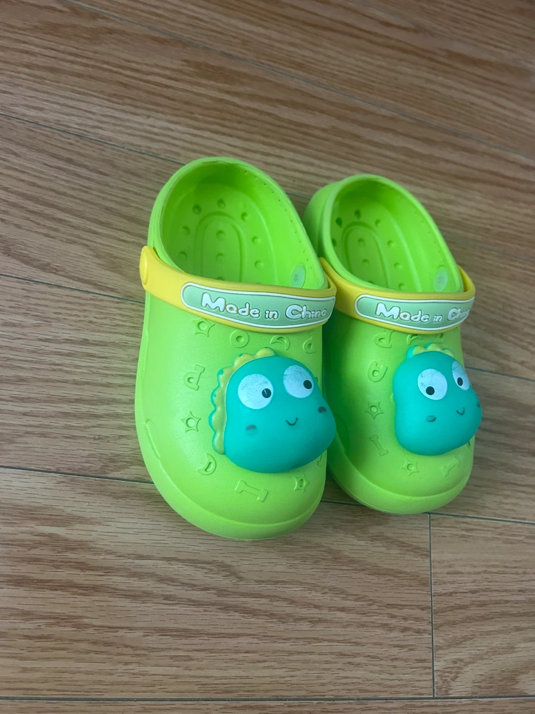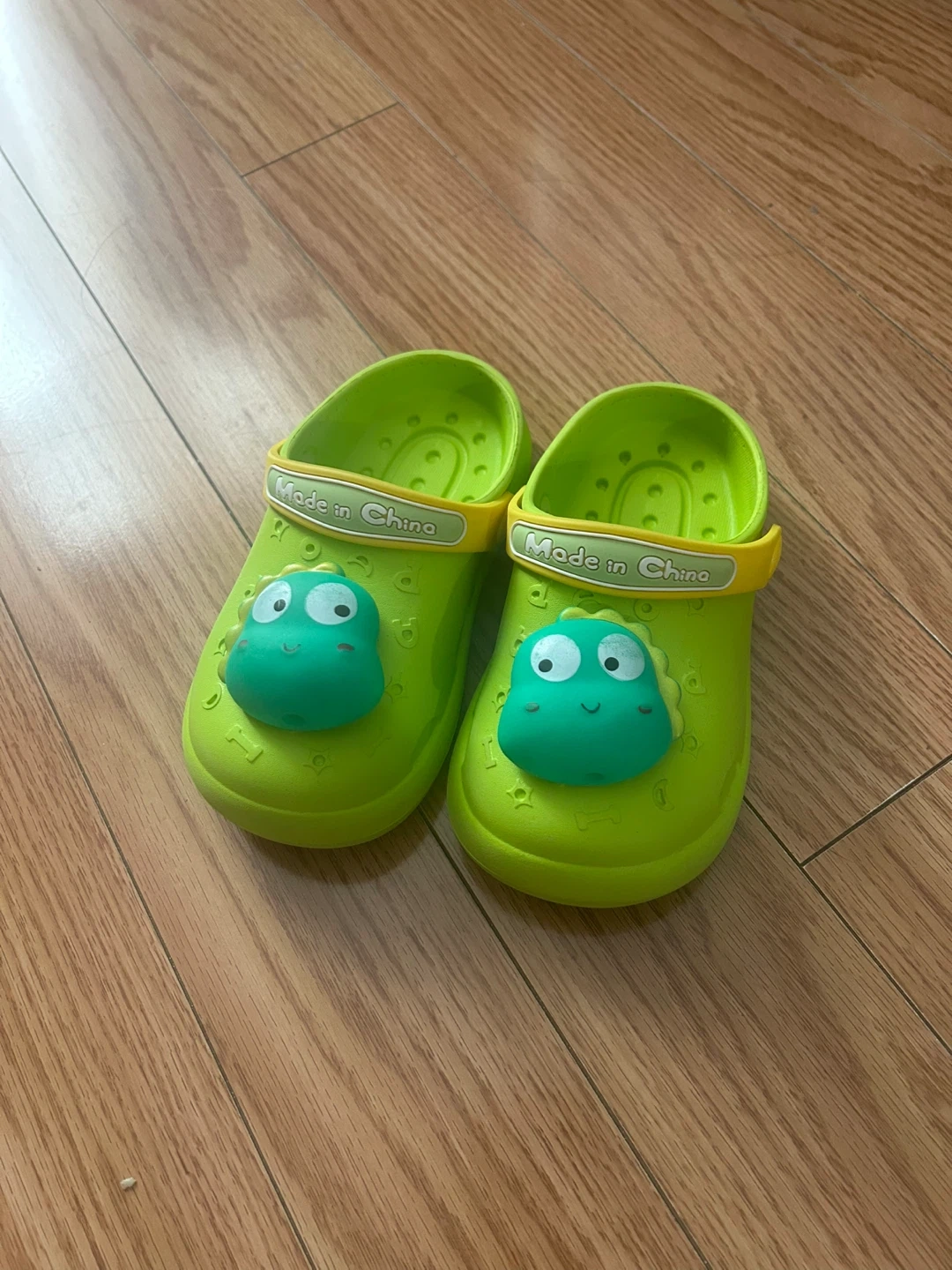These bright green clogs feature a fun dinosaur design that kids will love. They're made from a durable, easy-to-clean material. The soles are marked 130MM (2.5), indicating the size. Perfect for little ones to wear for play or just around the house!