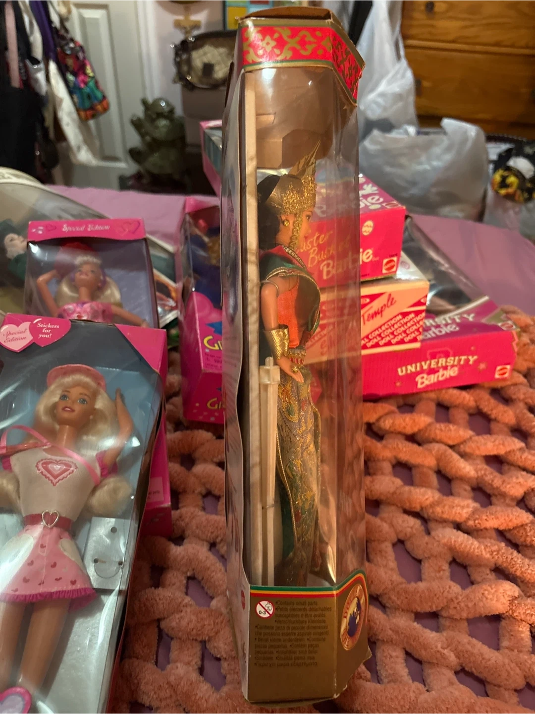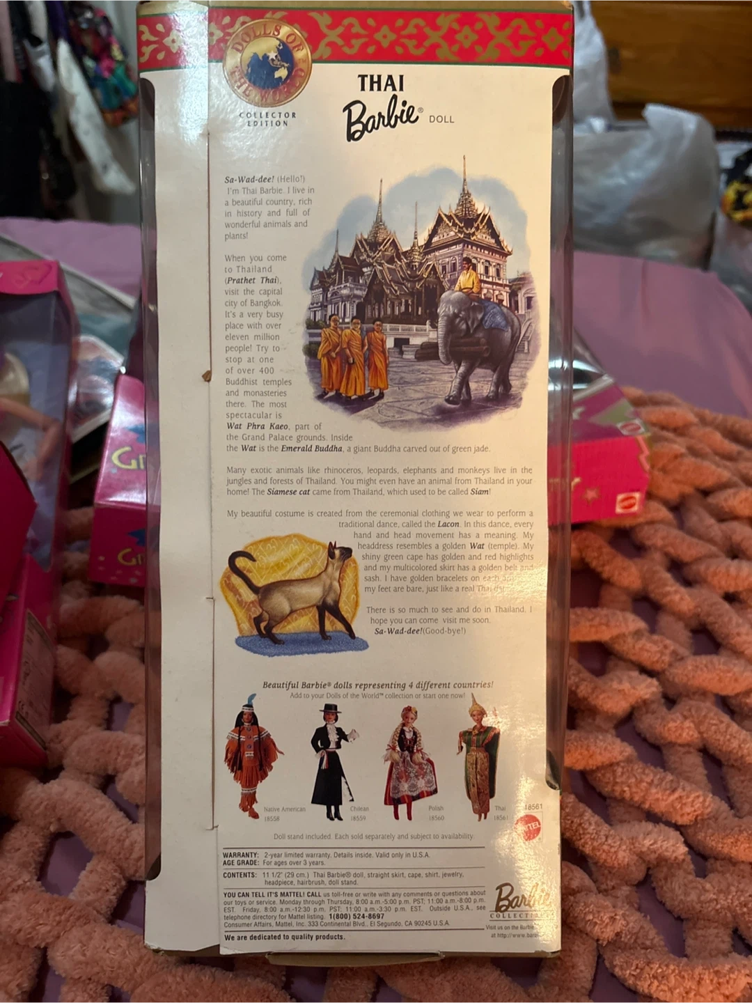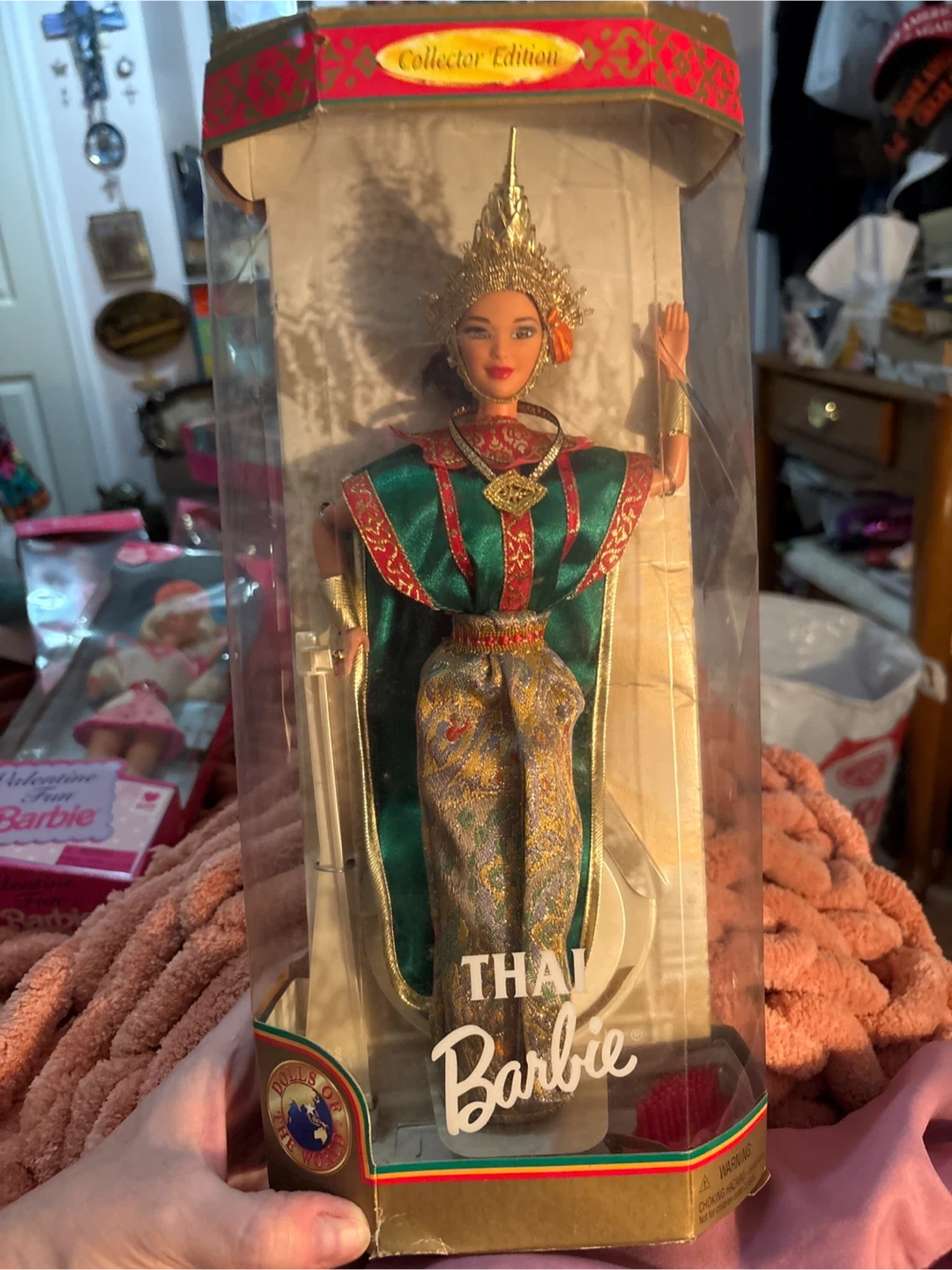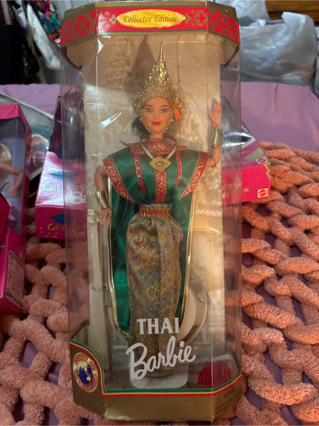 Selling a Thai Barbie doll from the Dolls of the World Collector Edition! It's still in its original packaging. The Barbie wears a beautiful costume from Thailand, including a golden headdress, green cape, and a multicolored skirt. A great addition to any Barbie collection!