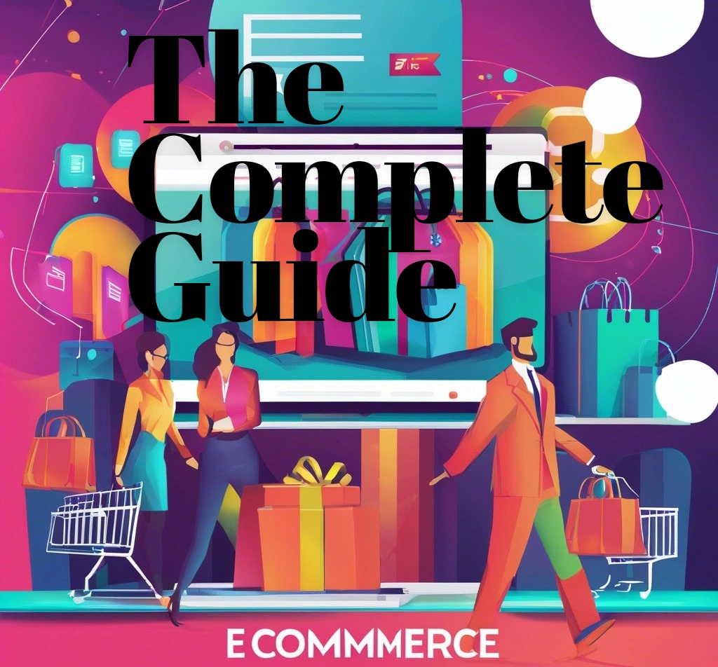 The image shows a book titled 'The Complete Guide E-commerce'. It seems to be a guide about e-commerce, featuring illustrations of people shopping and interacting with online stores. If you're looking to learn more about e-commerce, this book could be a great resource