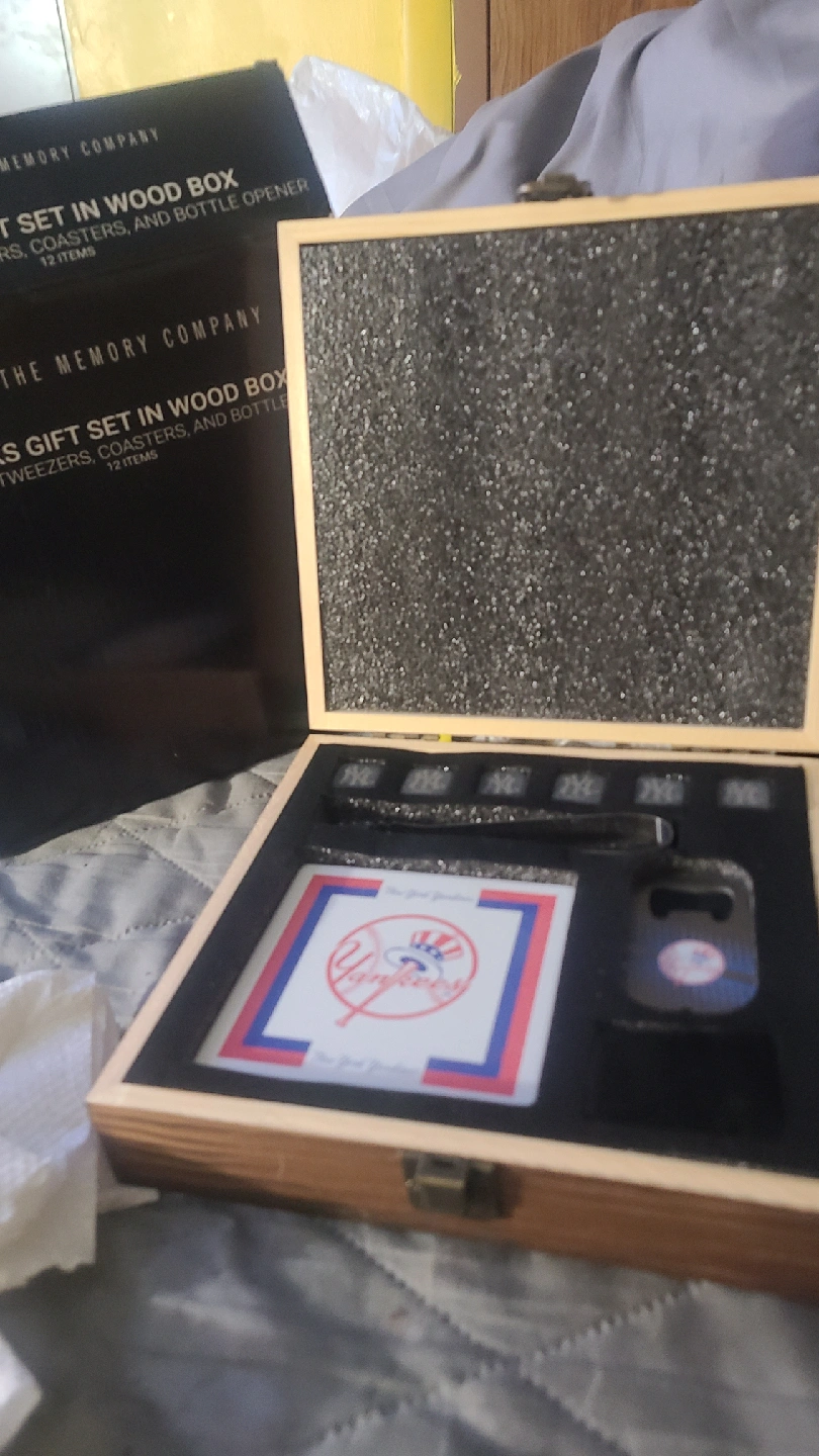 Selling The Memory Company Yankees gift set in a wood box. It includes coasters and a bottle opener. There are 12 items included in the set.