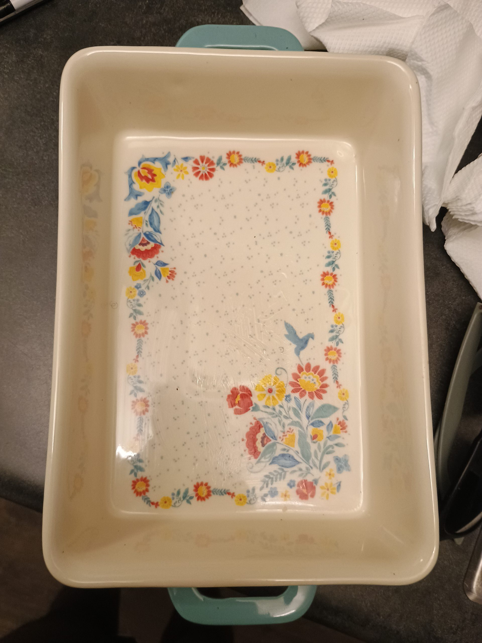 Here's a lovely rectangular baking dish from The Pioneer Woman collection! It has a pretty floral design around the rim and cute handles on the sides. It's perfect for baking casseroles, desserts, or roasting veggies