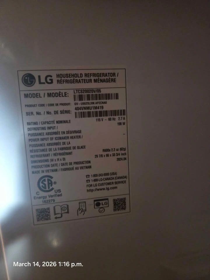 LG refrigerator (Model: LTCS20020V/05). Bought at Costco and still has warranty. Manufactured in April 2024, this unit is about two years old and has plenty of life left. It's a reliable, standard-size fridge from a trusted brand, perfect for a family kitchen or an upgrade.