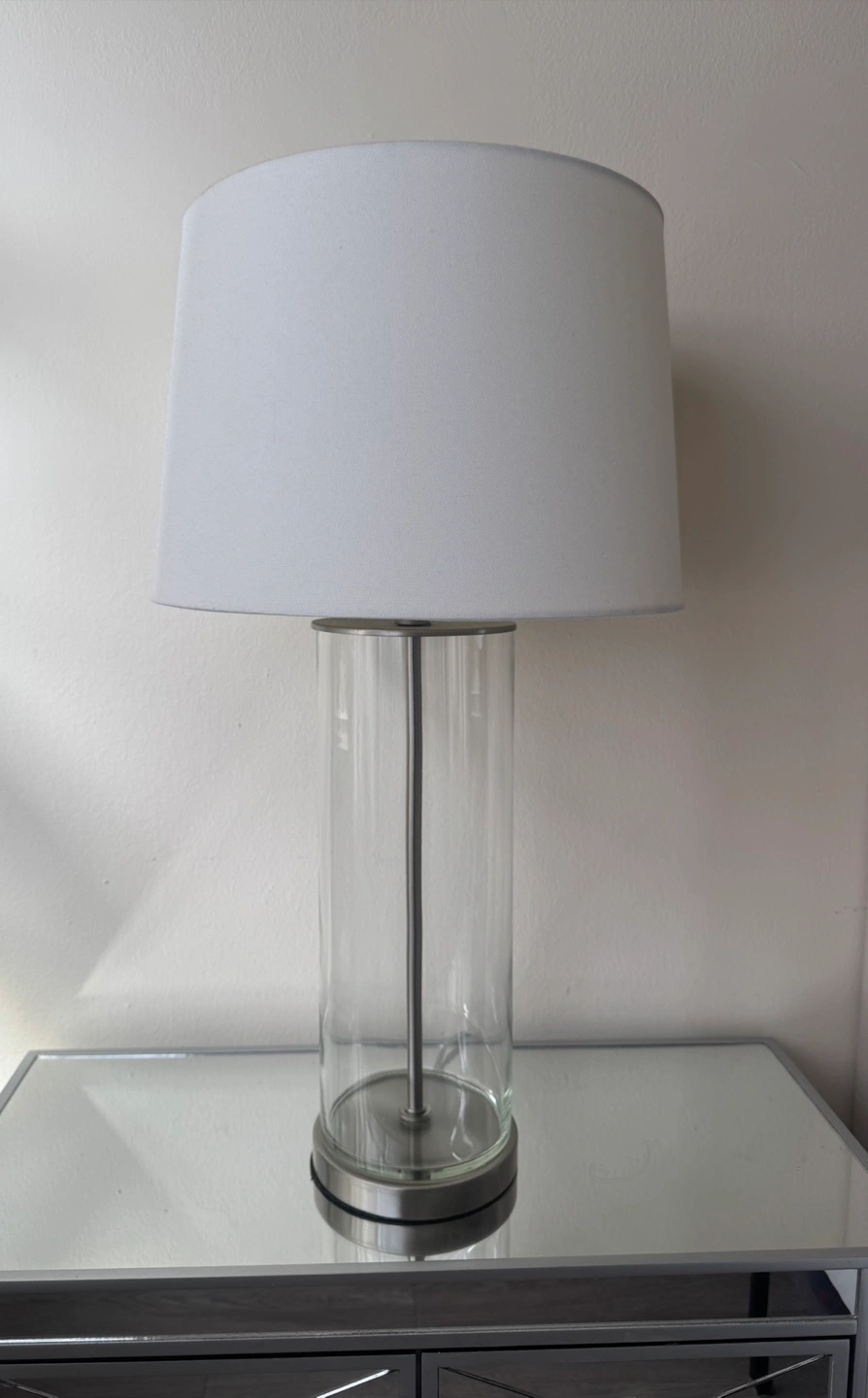 23Here's a stylish glass cylinder table lamp with a white shade! It's in great condition and would look lovely in any room. The clear glass base and simple design make it a versatile piece that complements various decor styles